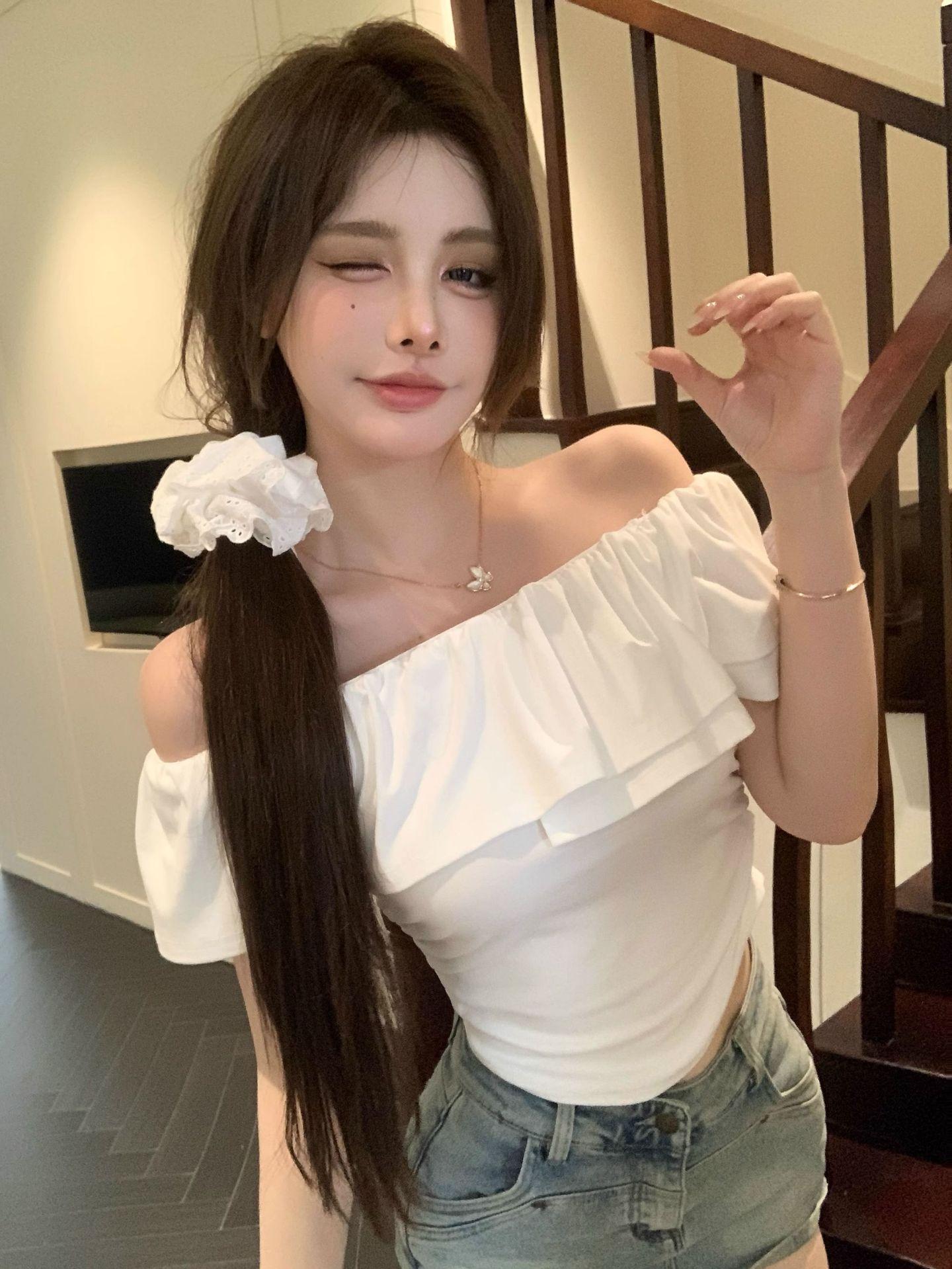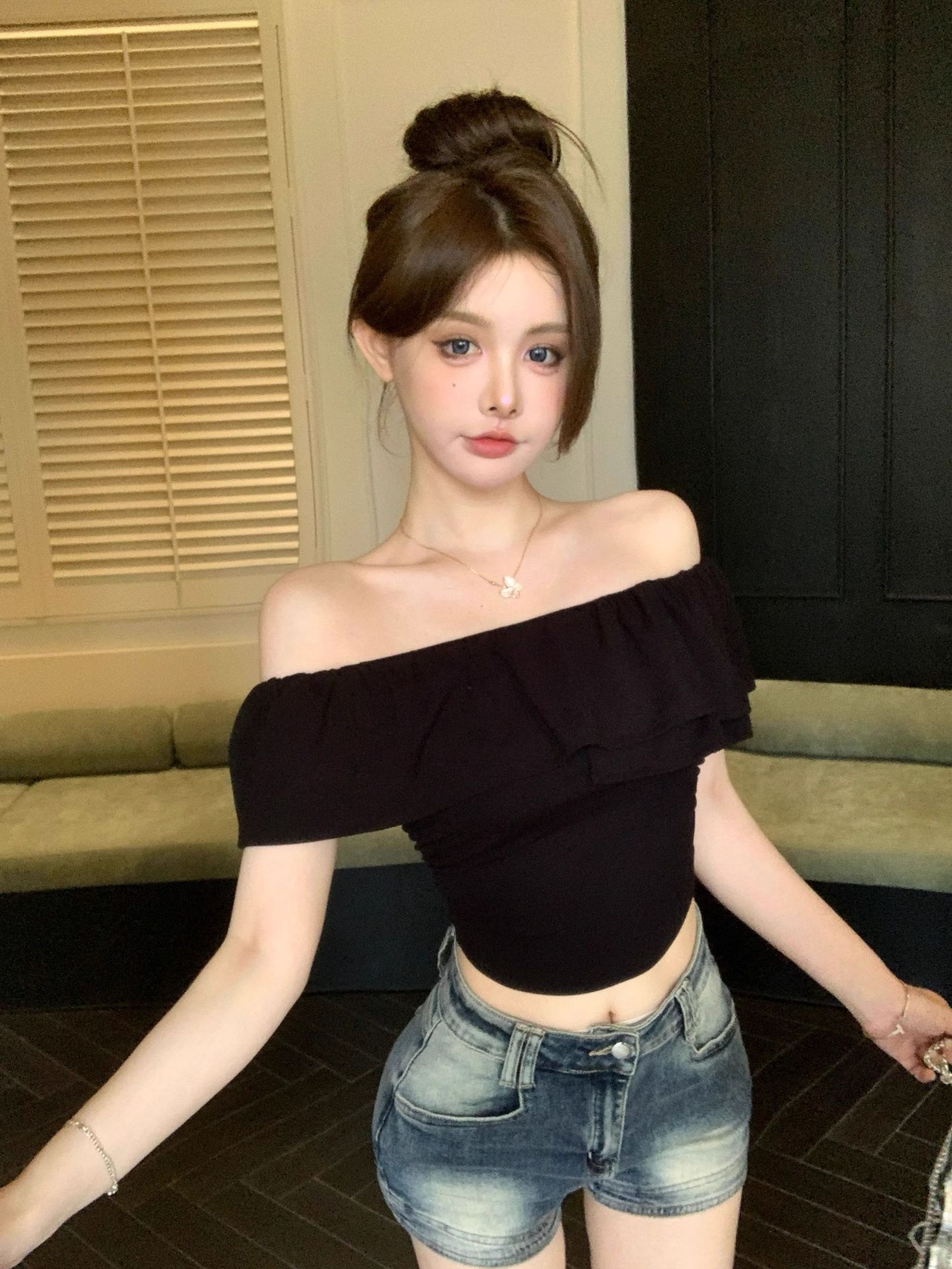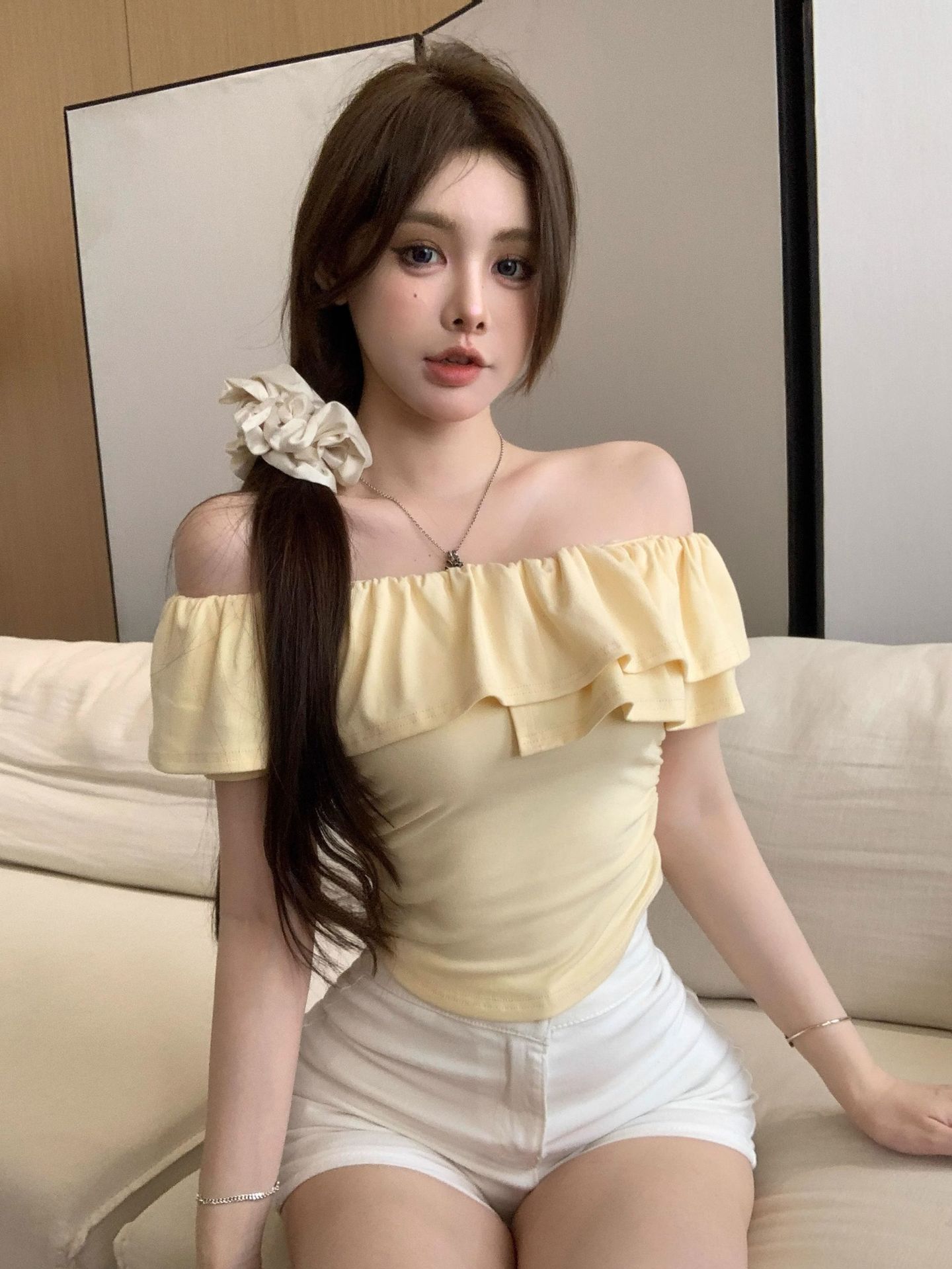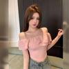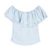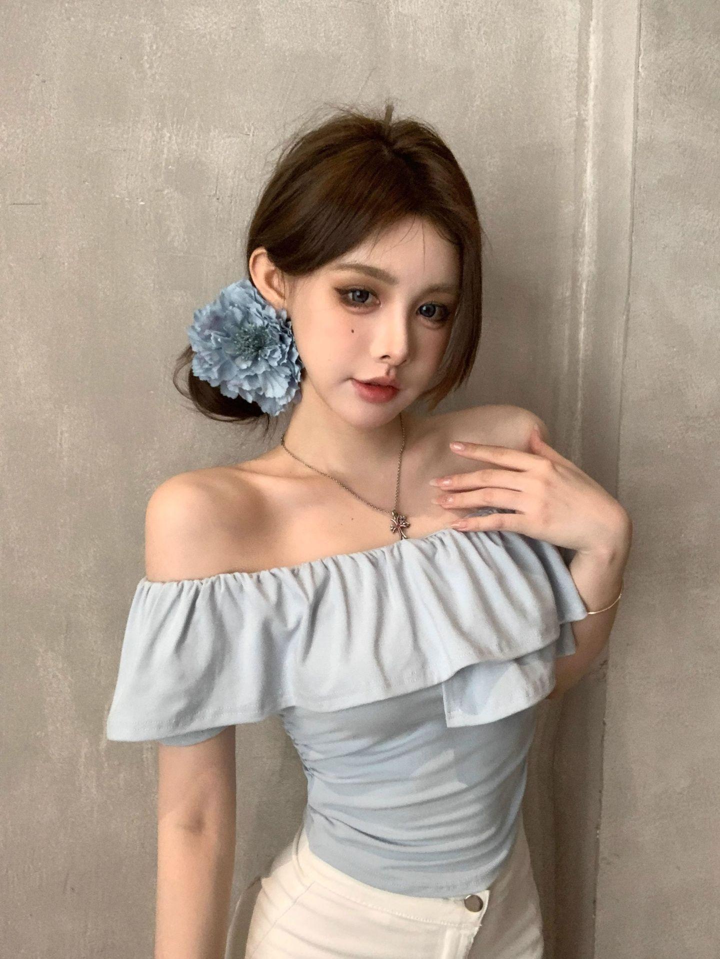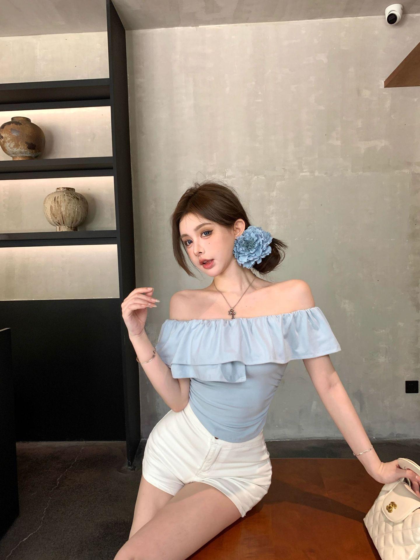 Camiseta de manga corta sexy con hombros descubiertos para mujer, corte entallado, plisado, con volantes, azul, corta y elegante, top pequeño de verano