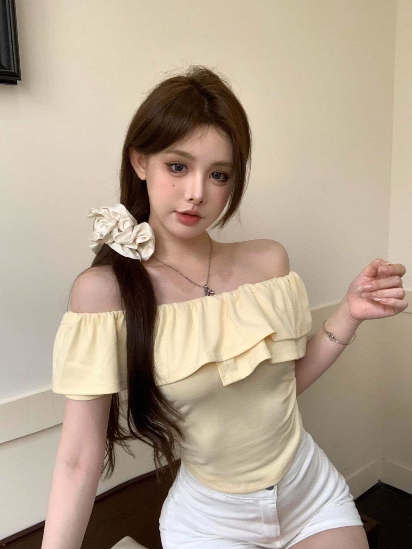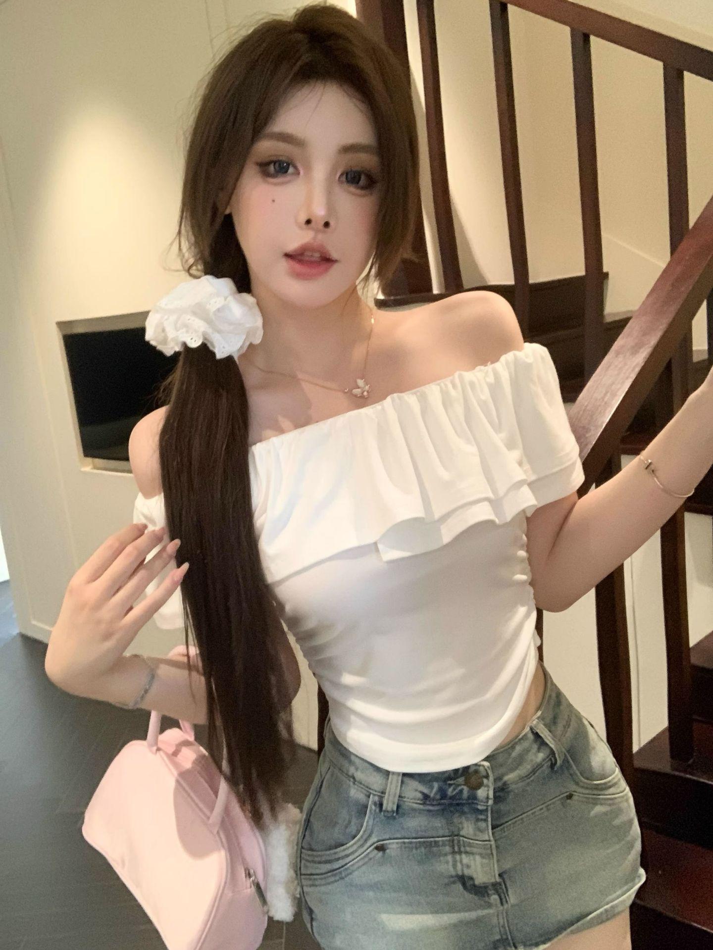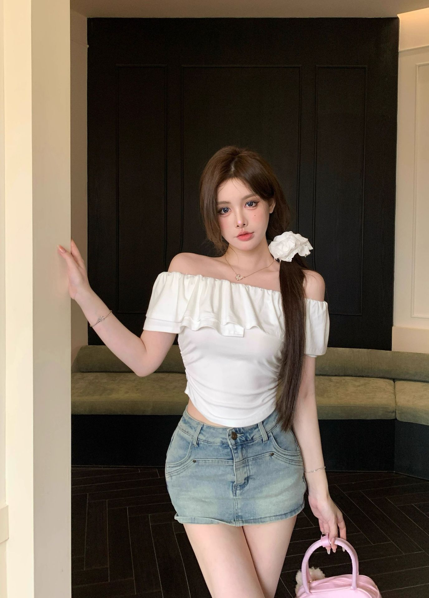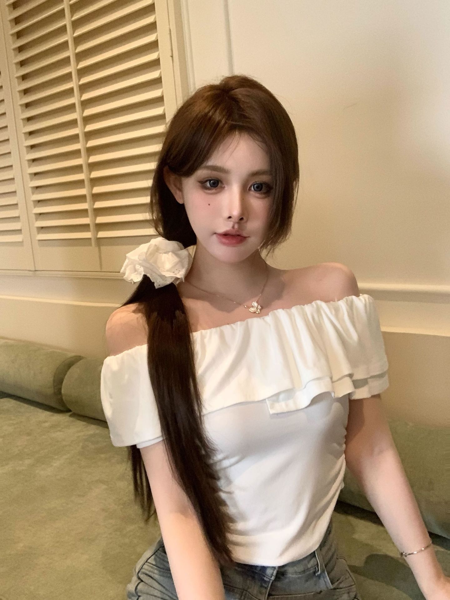 Camiseta de manga corta sexy con hombros descubiertos para mujer, corte entallado, plisado, con volantes, azul, corta y elegante, top pequeño de verano