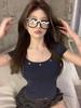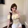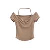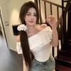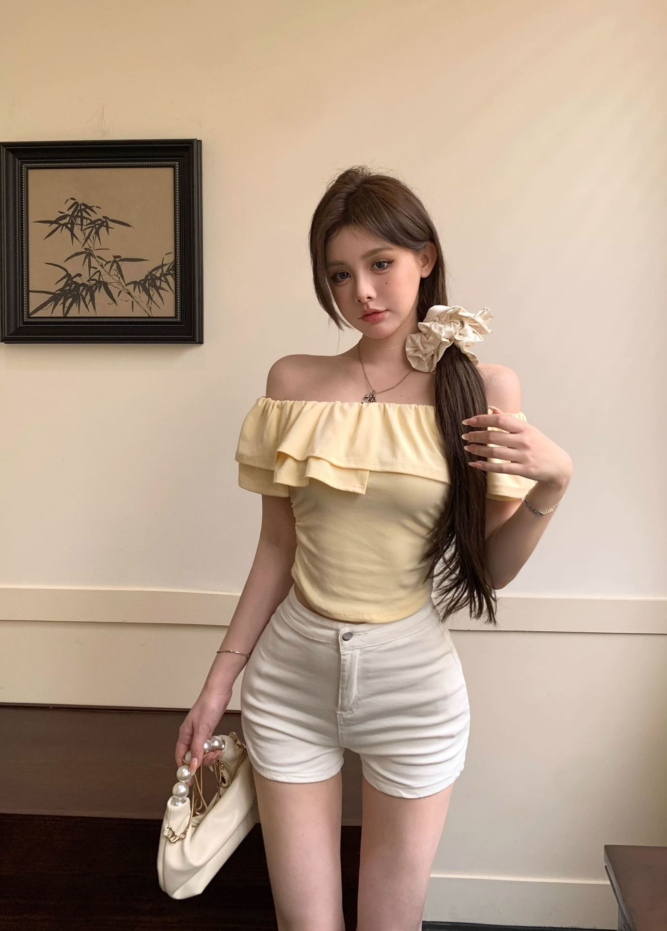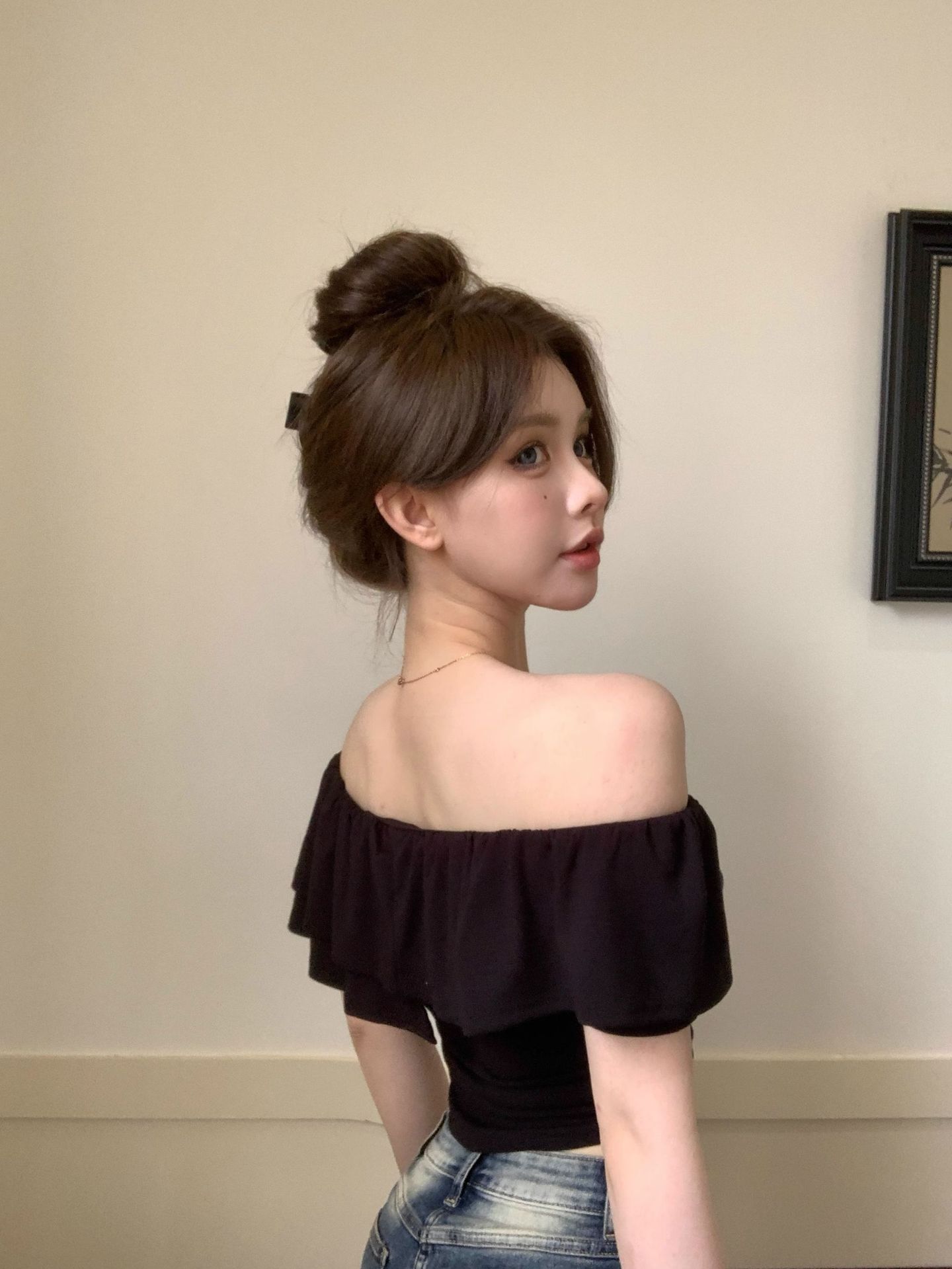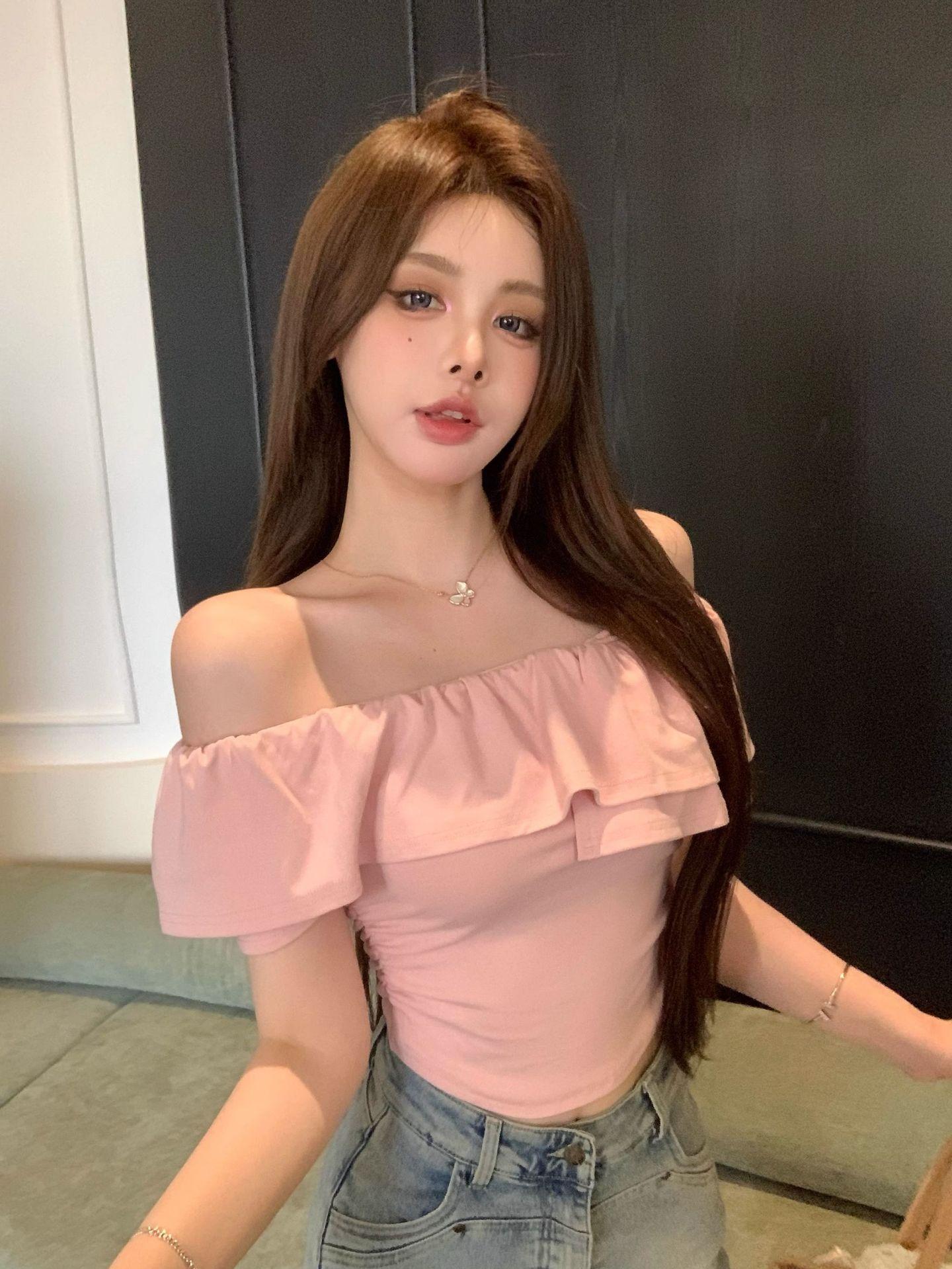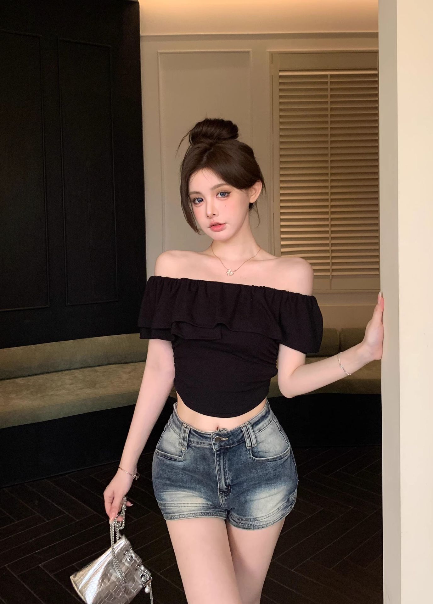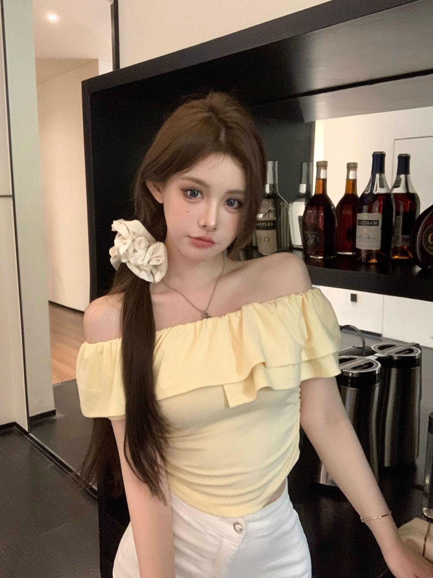 Camiseta de manga corta sexy con hombros descubiertos para mujer, corte entallado, plisado, con volantes, azul, corta y elegante, top pequeño de verano