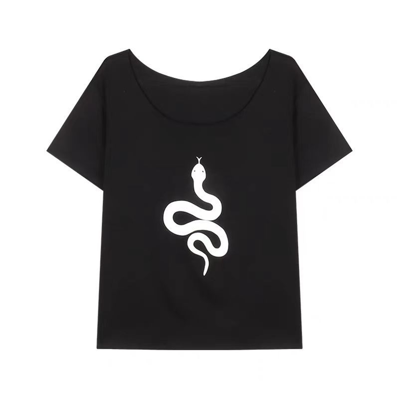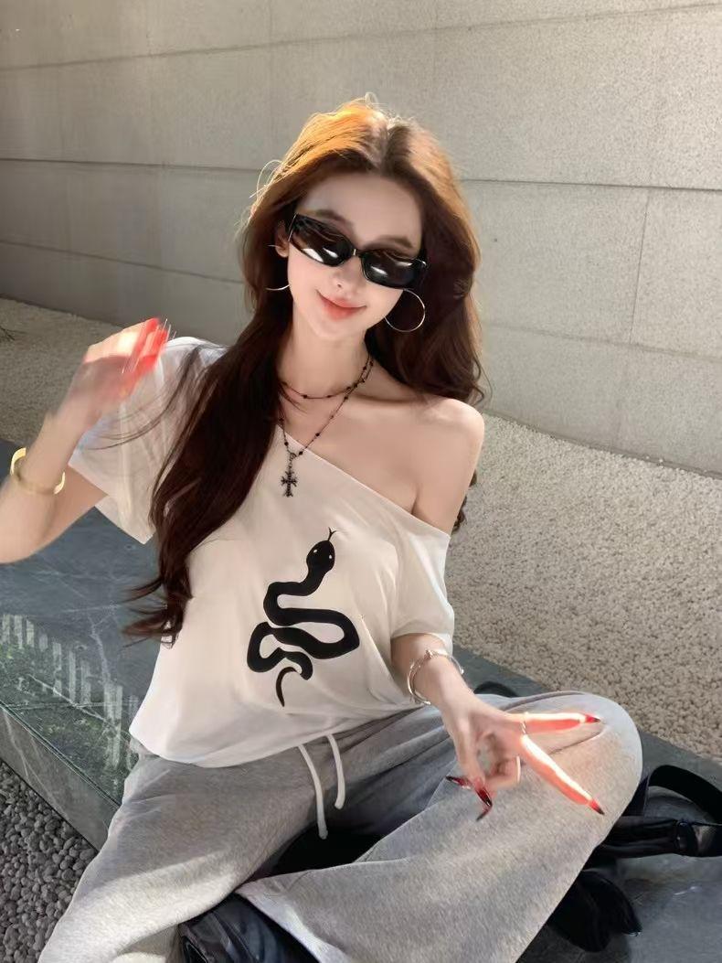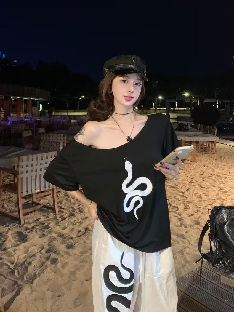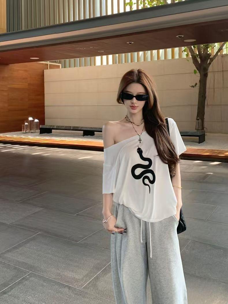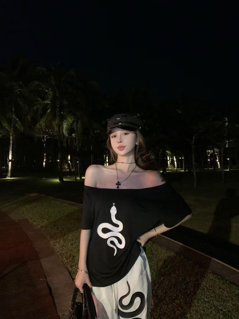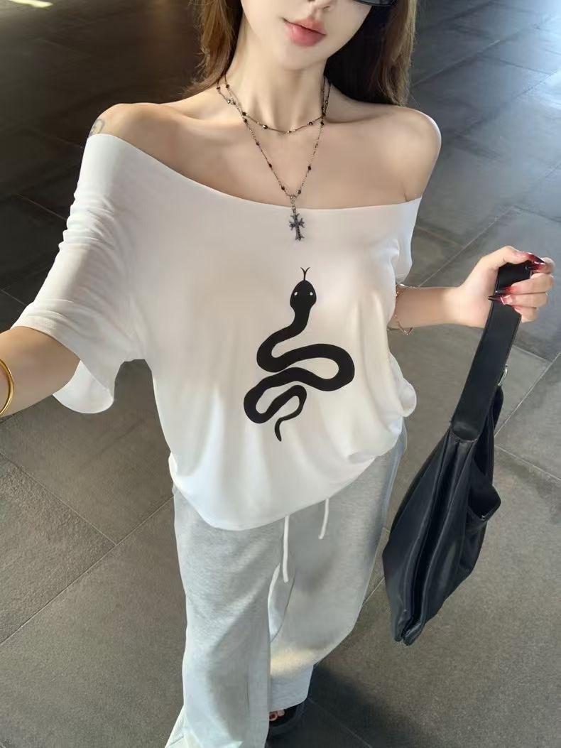 Playera de Manga Corta con Hombros Descubiertos y Estampado de Serpiente para Mujer, Diseño Holgado Blanco de Verano, Top Versátil Único y Chic