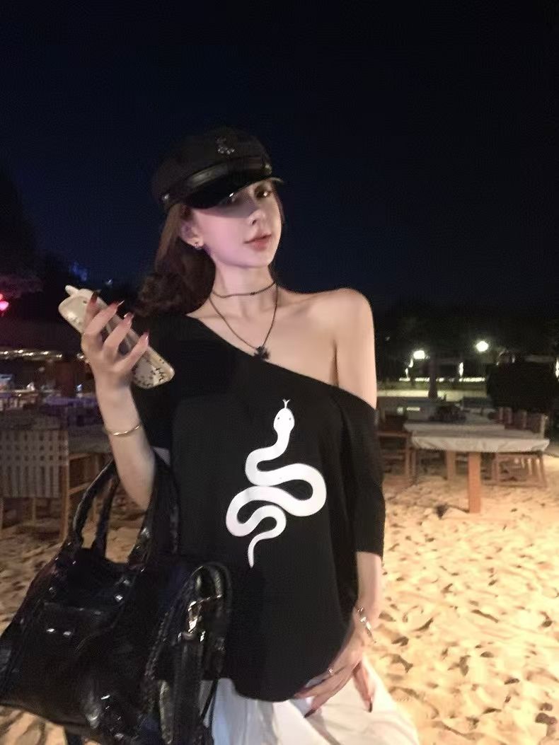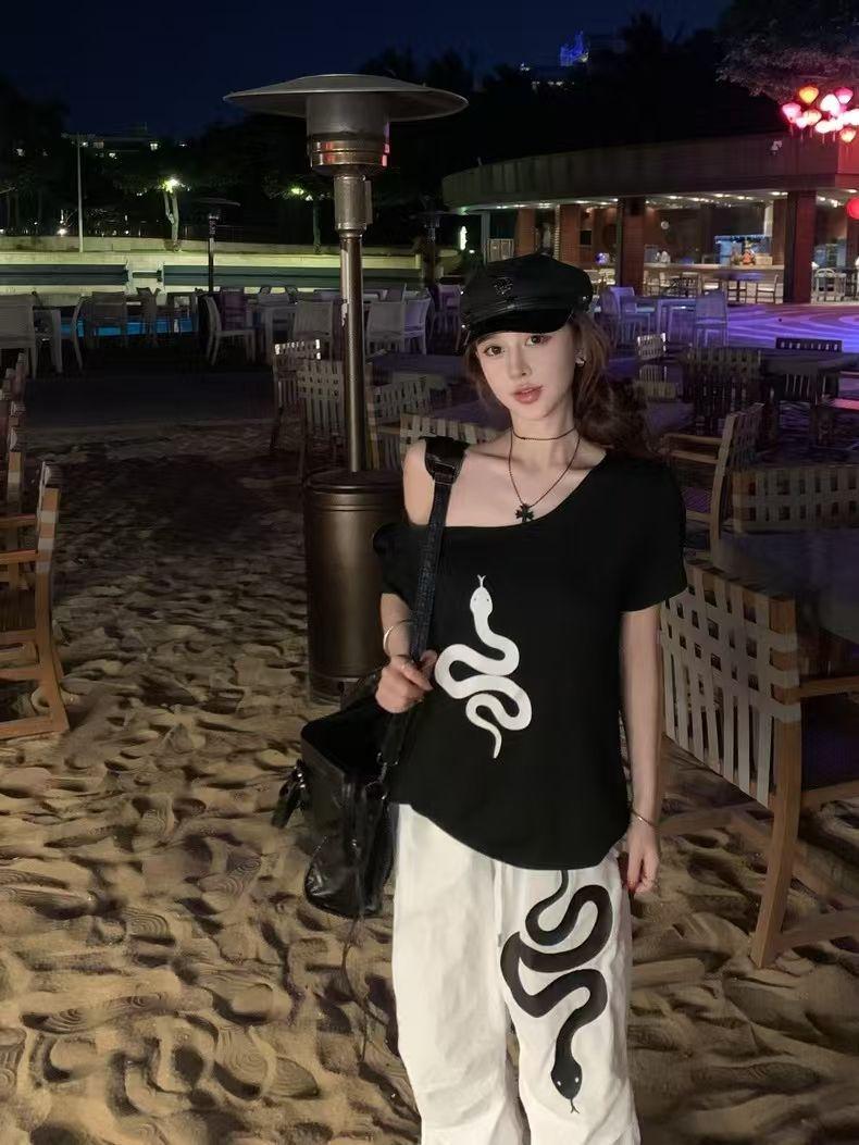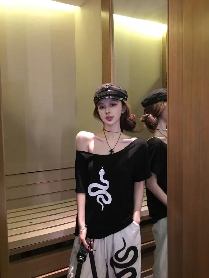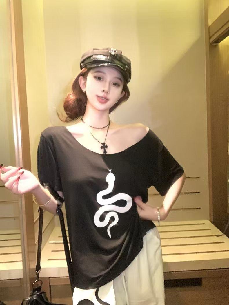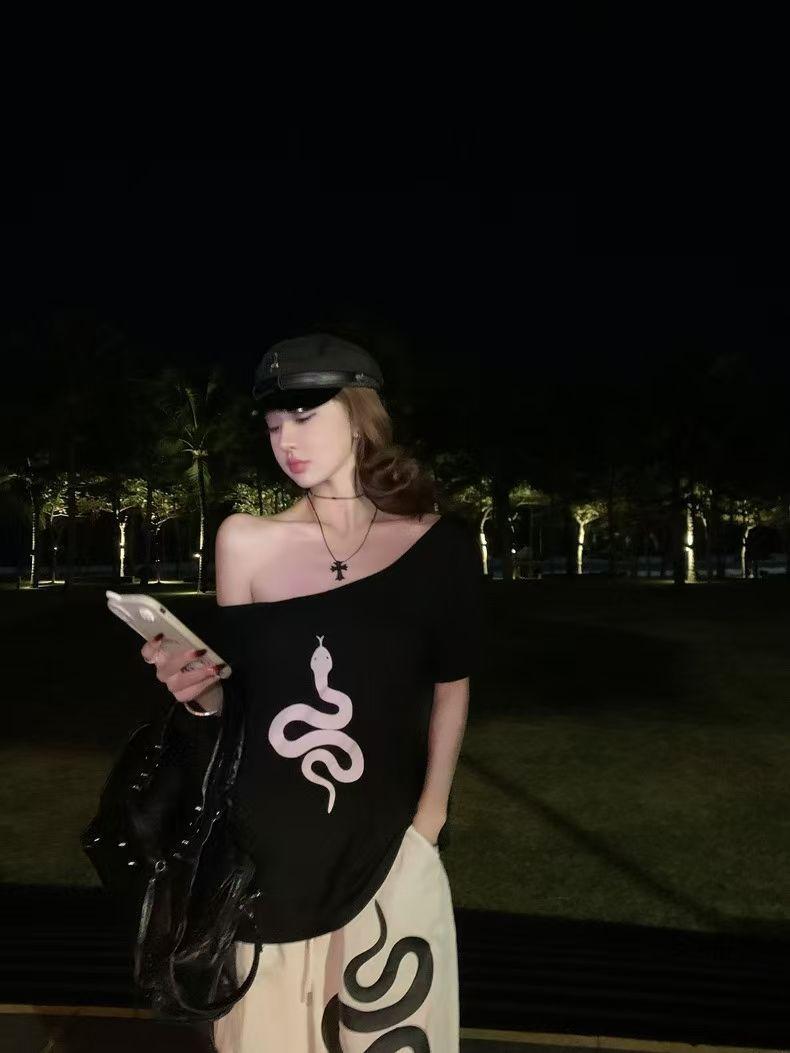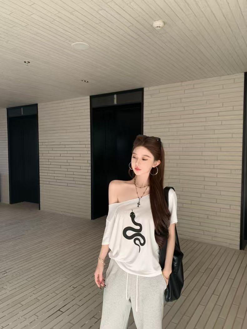 Playera de Manga Corta con Hombros Descubiertos y Estampado de Serpiente para Mujer, Diseño Holgado Blanco de Verano, Top Versátil Único y Chic