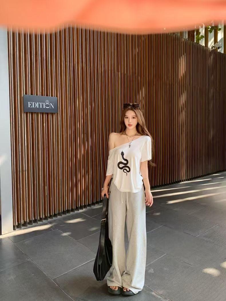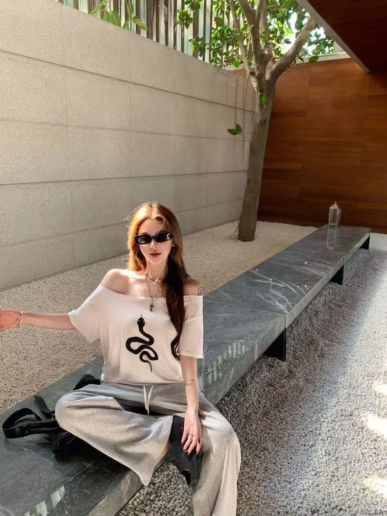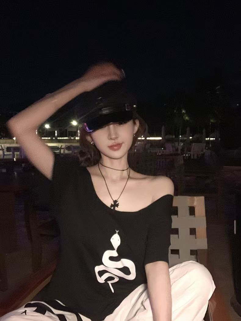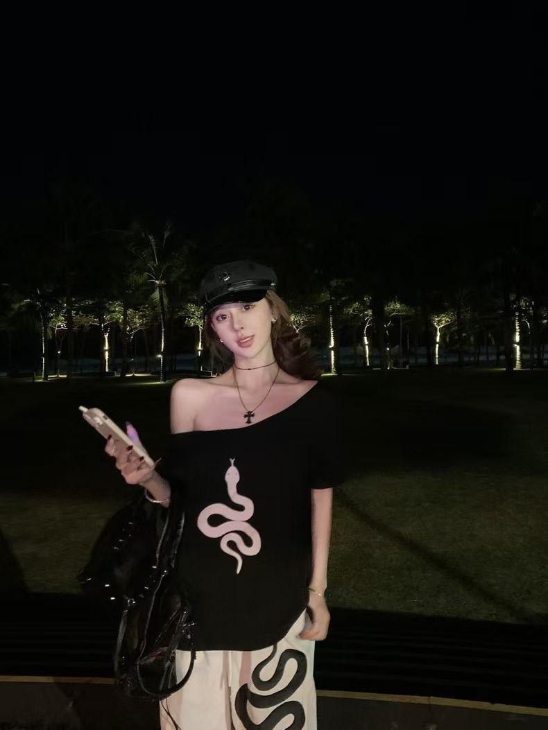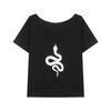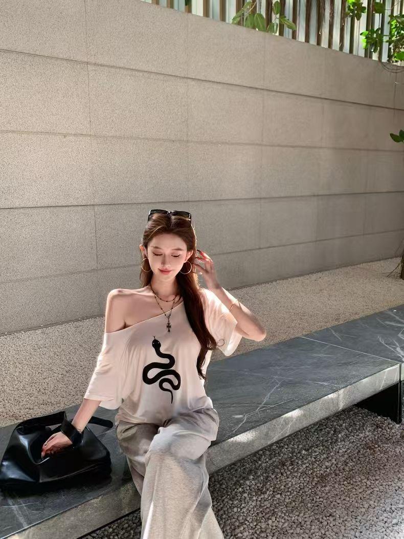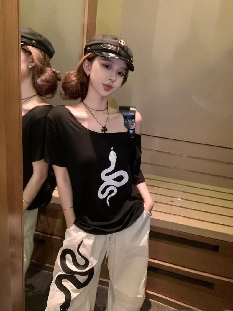 Playera de Manga Corta con Hombros Descubiertos y Estampado de Serpiente para Mujer, Diseño Holgado Blanco de Verano, Top Versátil Único y Chic
