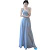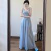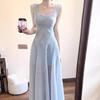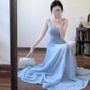 Vestido francés azul de verano con tirantes para mujer 2025 Nuevo Elegante Adelgazante de cintura A palabra Falda para vacaciones en la playa
