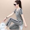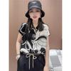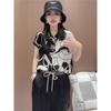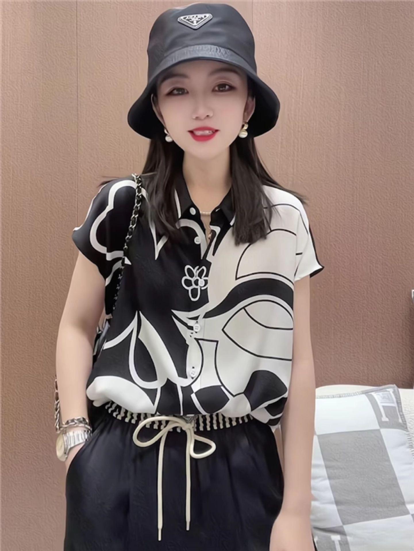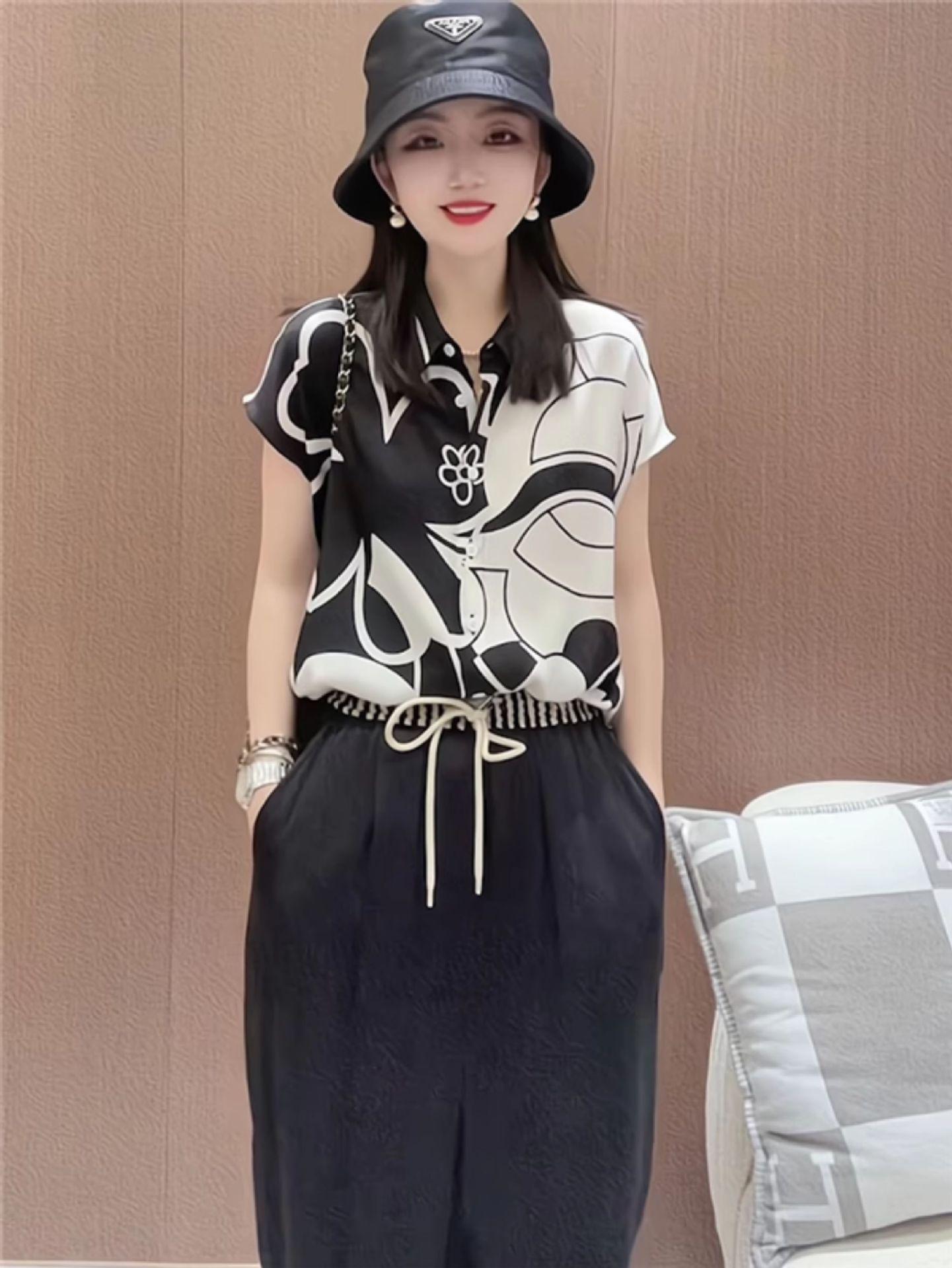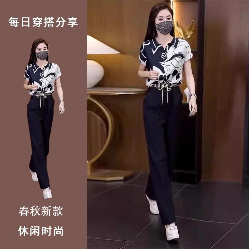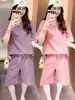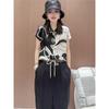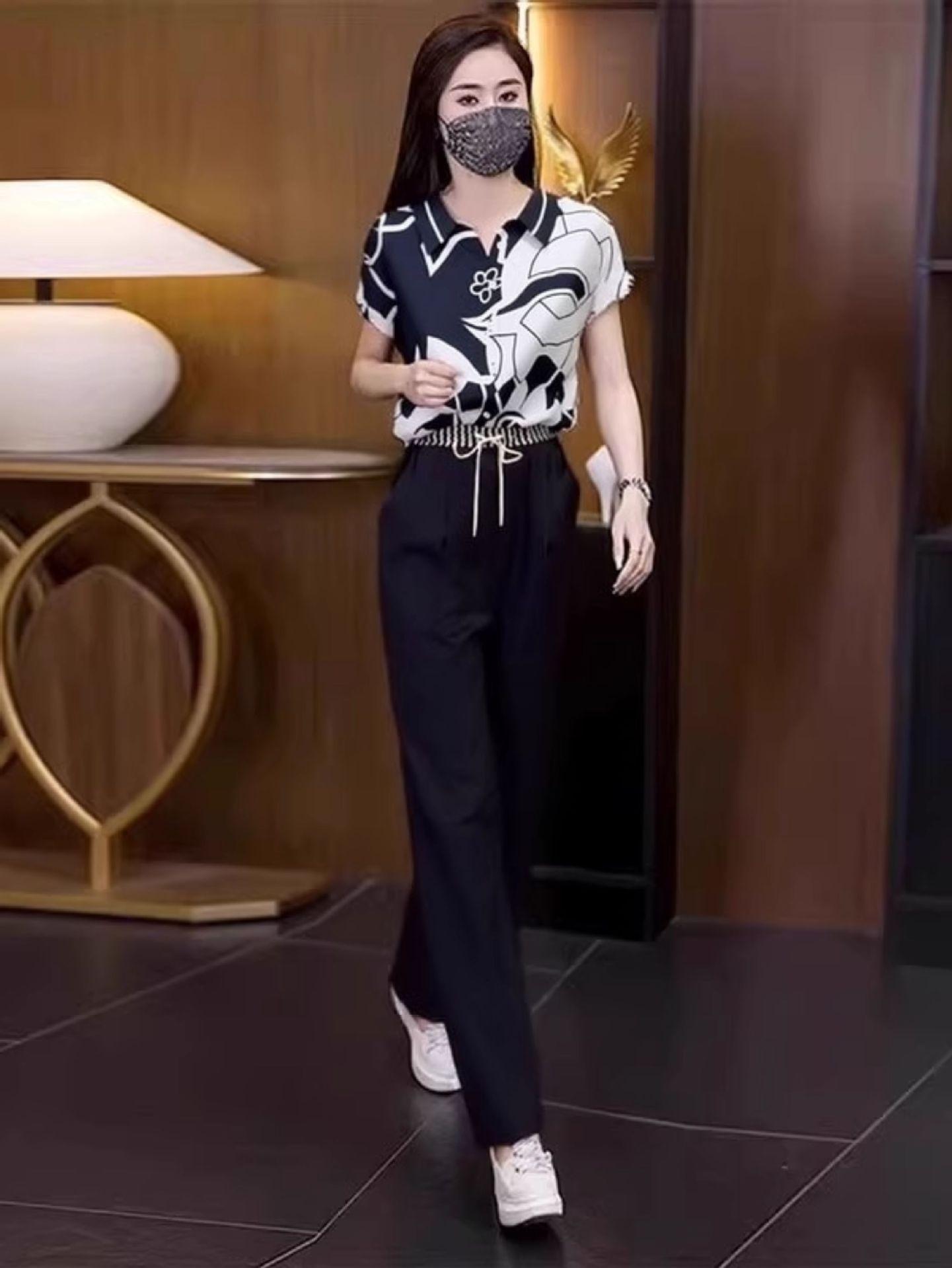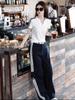 Camisa Delgada de Solapa a Color Block de Manga Corta Traje de Pantalones Anchos Sueltos para Mujer Verano Europeo Casual Moda Deportiva Conjunto de Dos Piezas