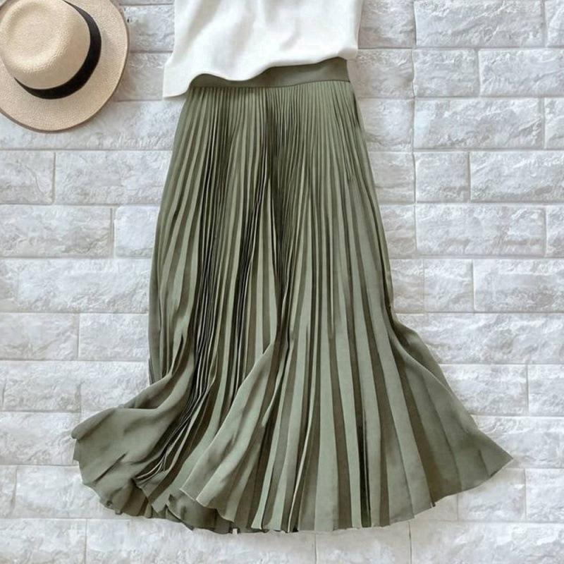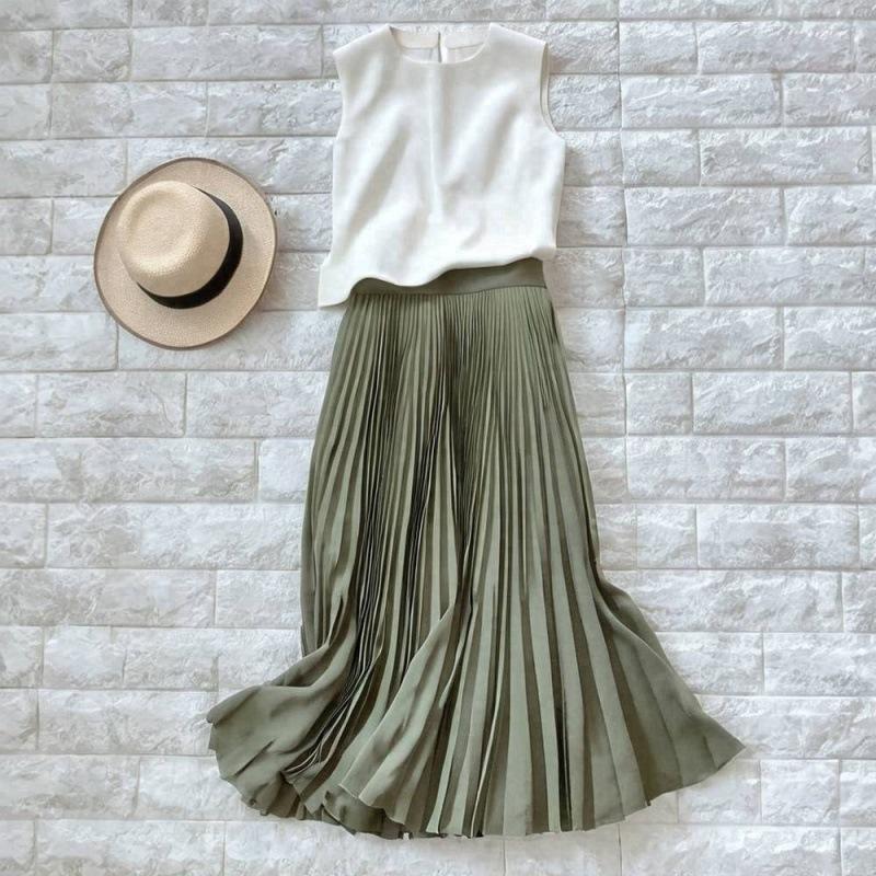 White top + light khaki skirt, White top + green skirt, White top + navy blue skirt, White top + brown skirt