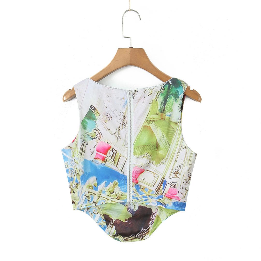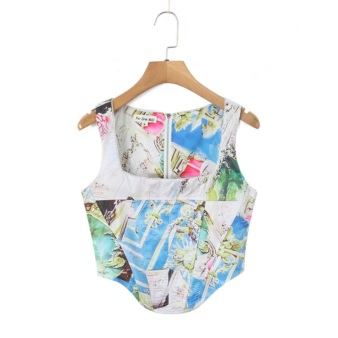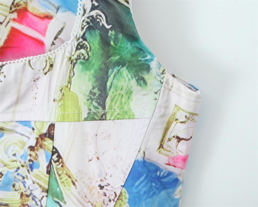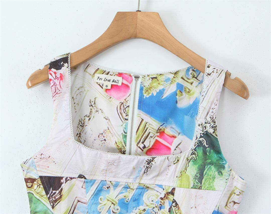 Nicho Chica Caliente Cuello Cuadrado Sin Mangas Estampado Cintura Chaleco Top Diseño Falda Traje con Abertura Lateral de Cintura Baja