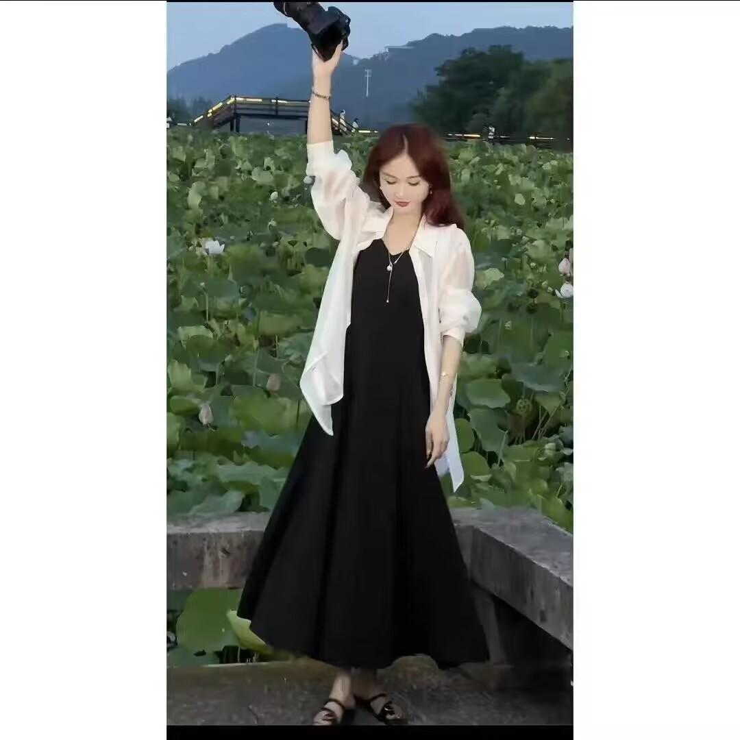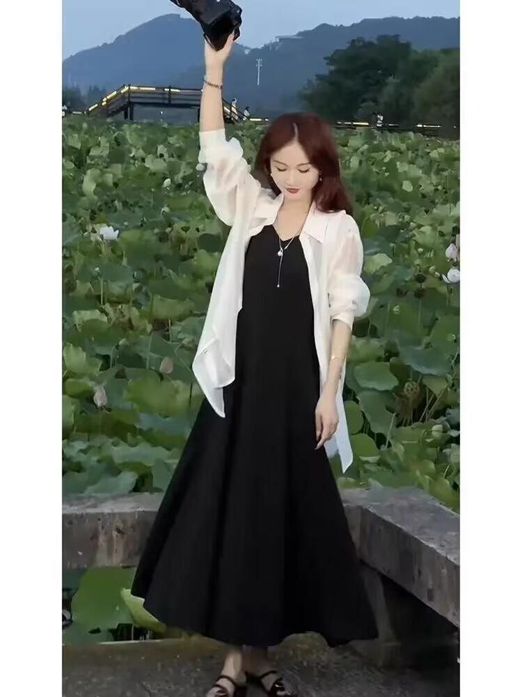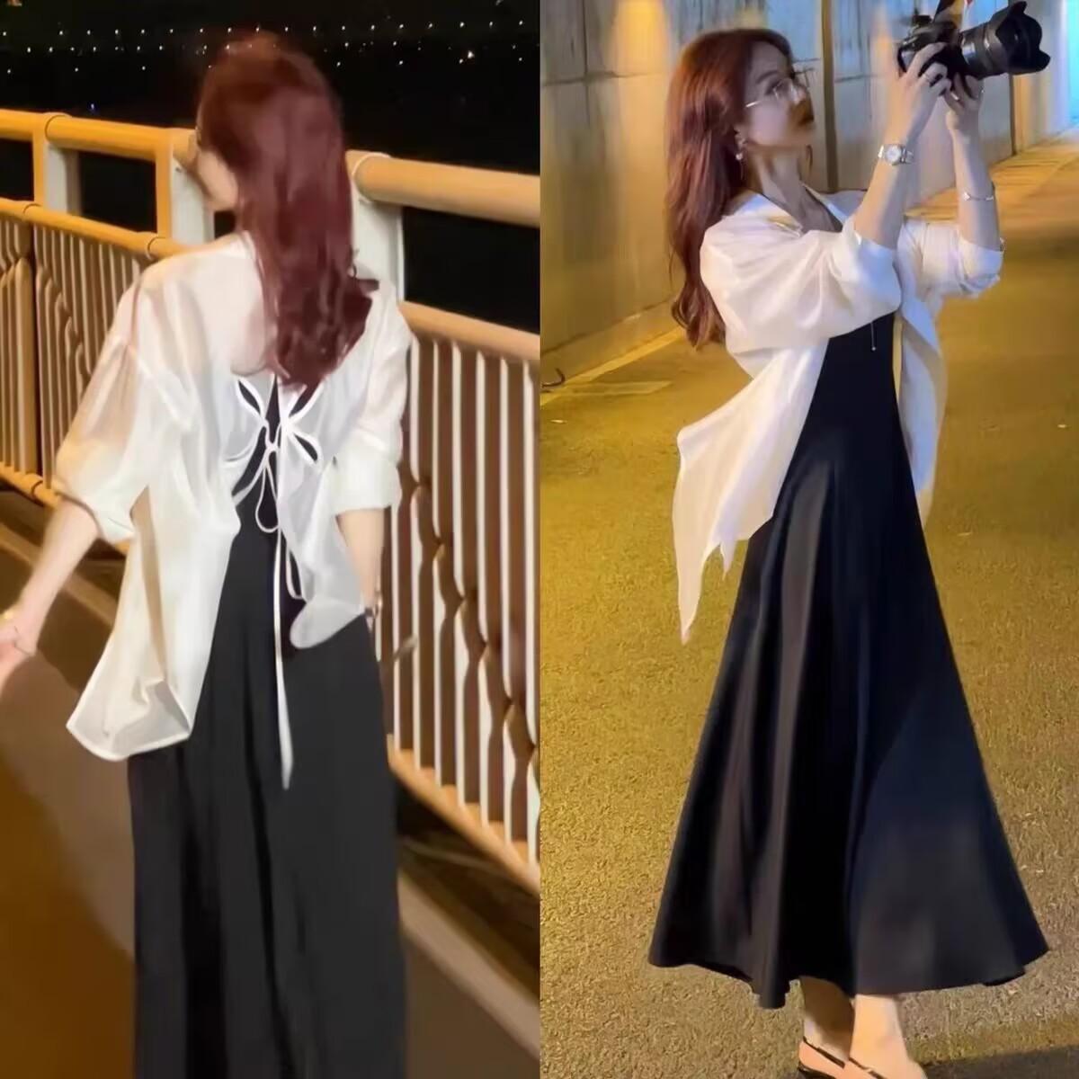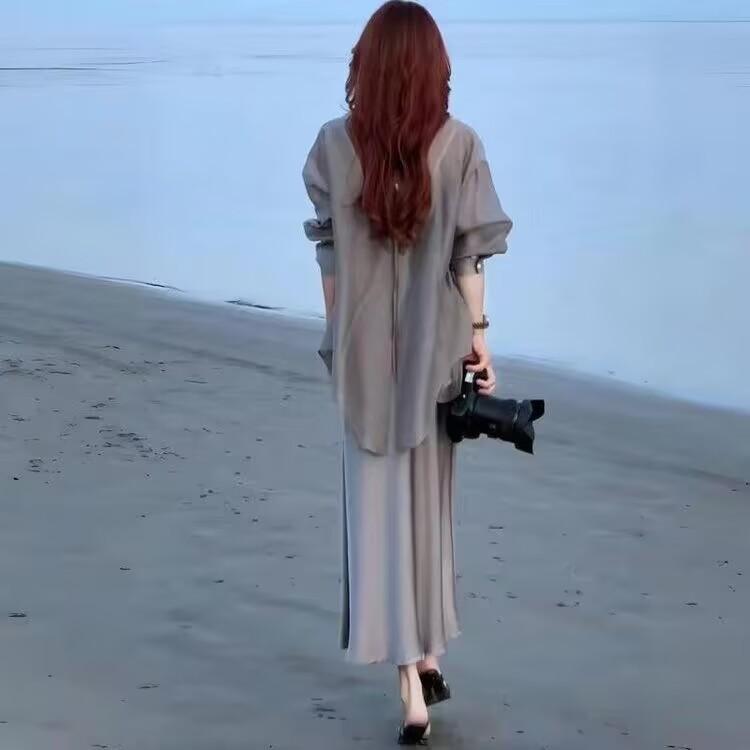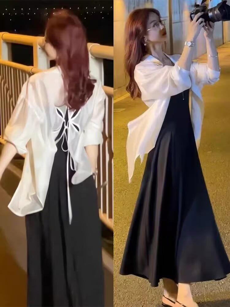 Sentido del Diseño Espalda Dividida Camisa Chaqueta Protector Solar de Seda de Hielo Fina Vestido Elegante con Tirantes Traje de Dos Piezas Verano para Mujer