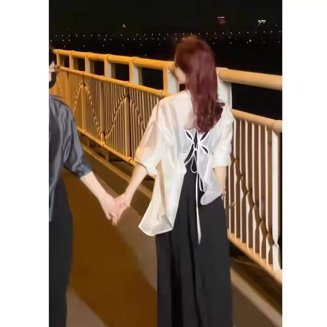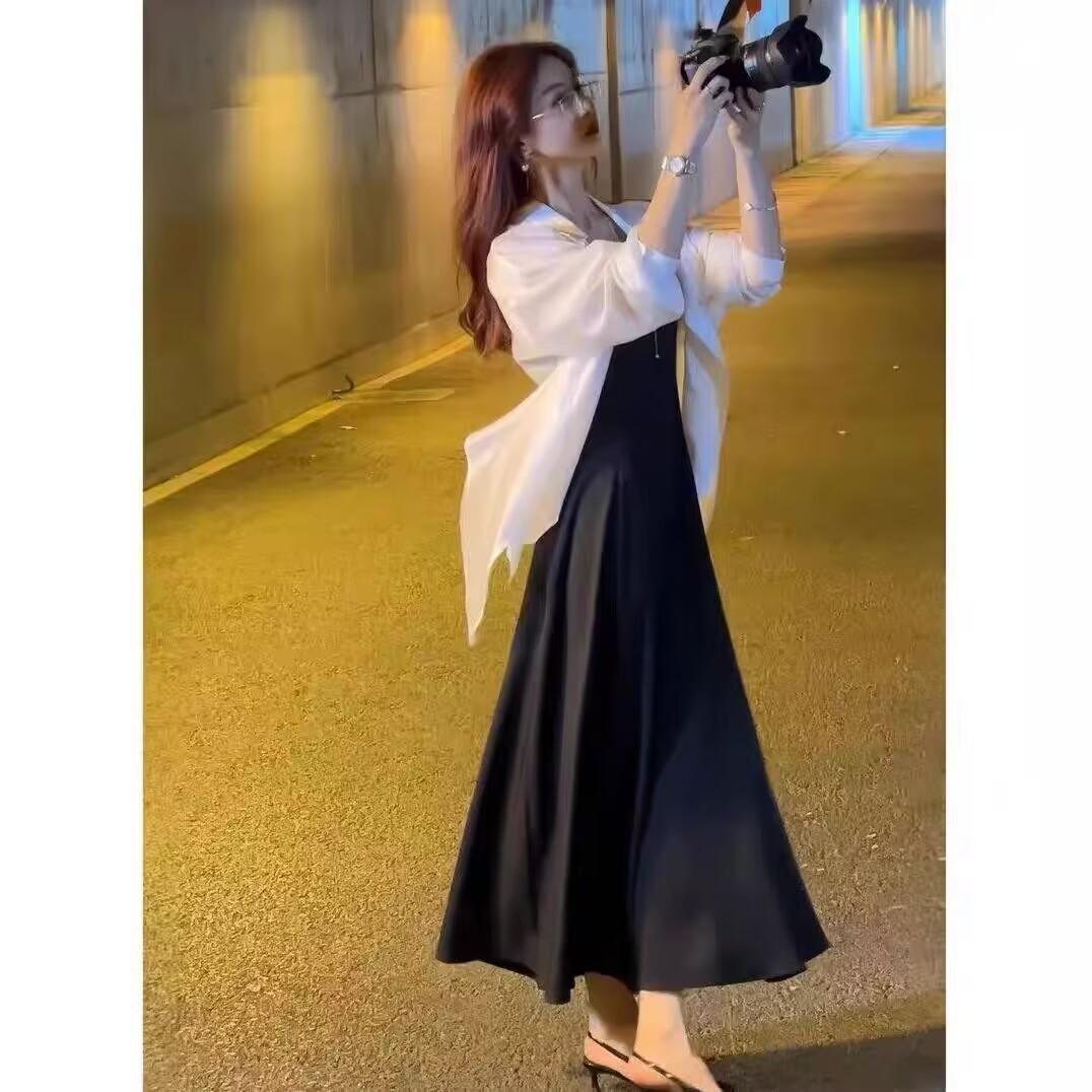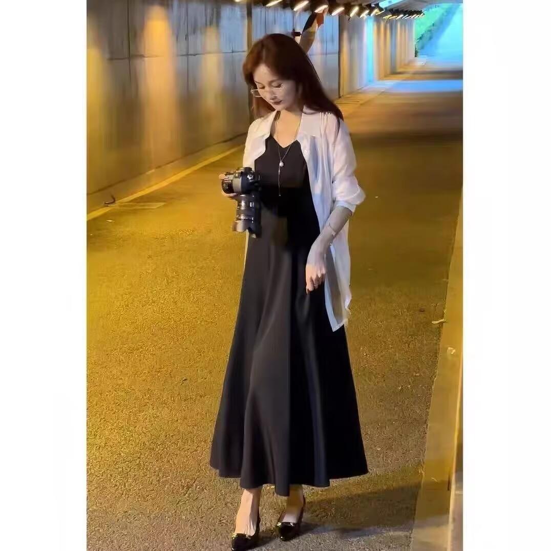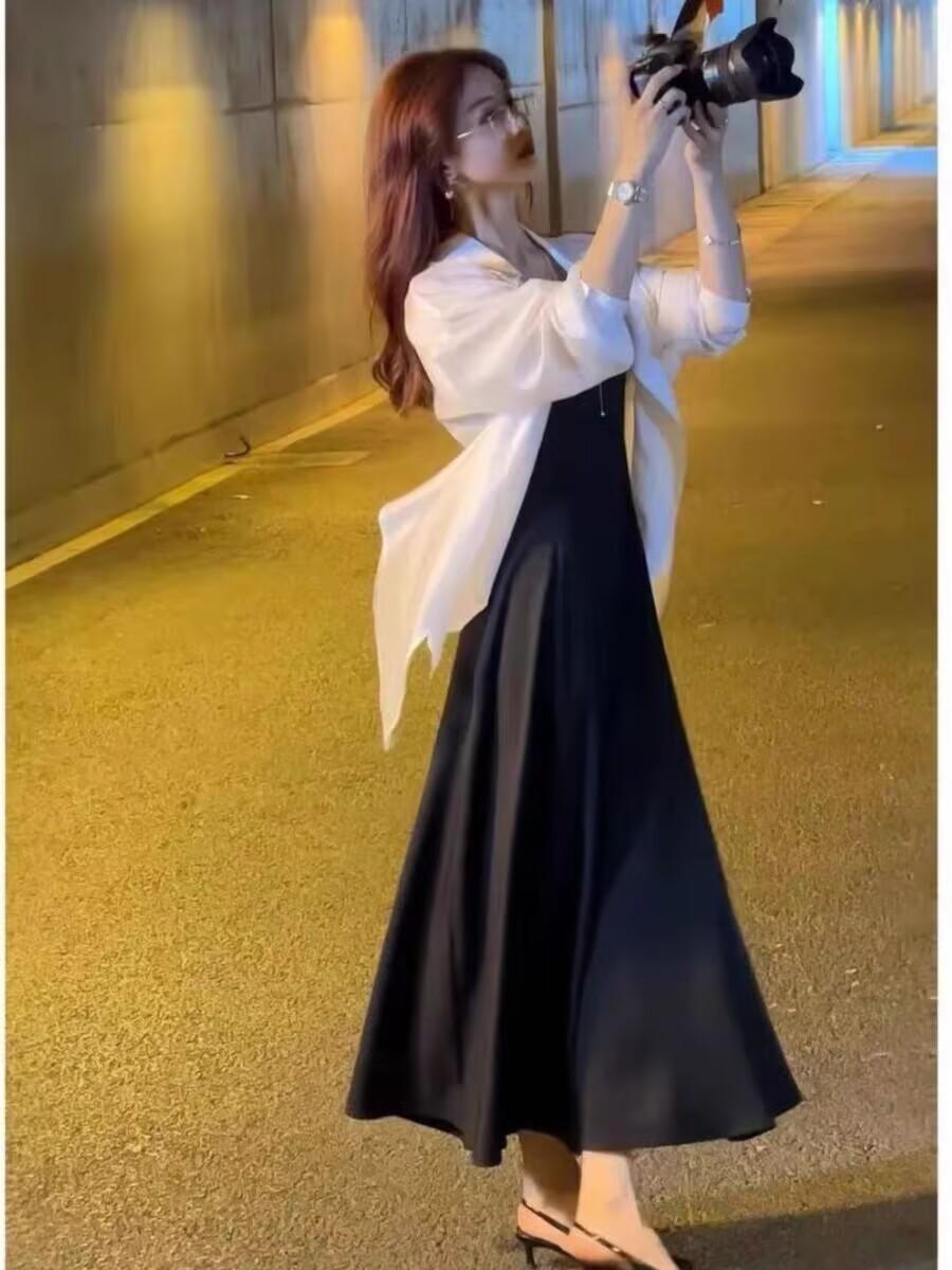 Sentido del Diseño Espalda Dividida Camisa Chaqueta Protector Solar de Seda de Hielo Fina Vestido Elegante con Tirantes Traje de Dos Piezas Verano para Mujer