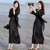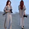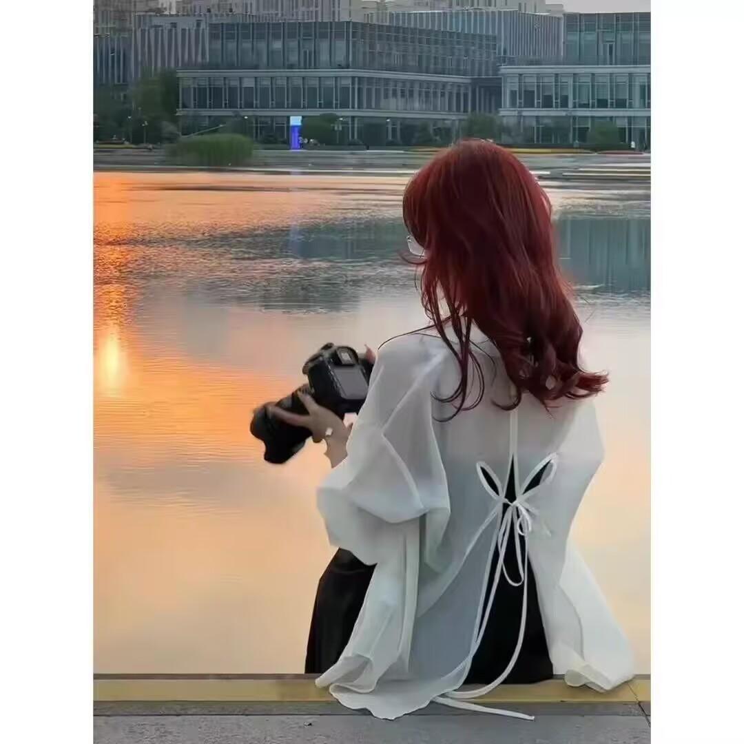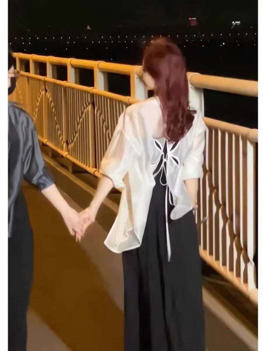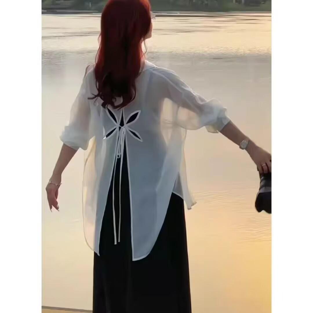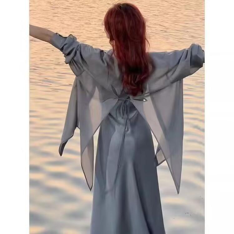 Sentido del Diseño Espalda Dividida Camisa Chaqueta Protector Solar de Seda de Hielo Fina Vestido Elegante con Tirantes Traje de Dos Piezas Verano para Mujer
