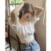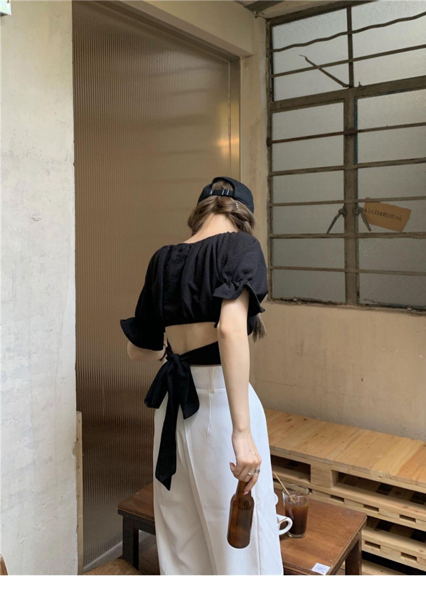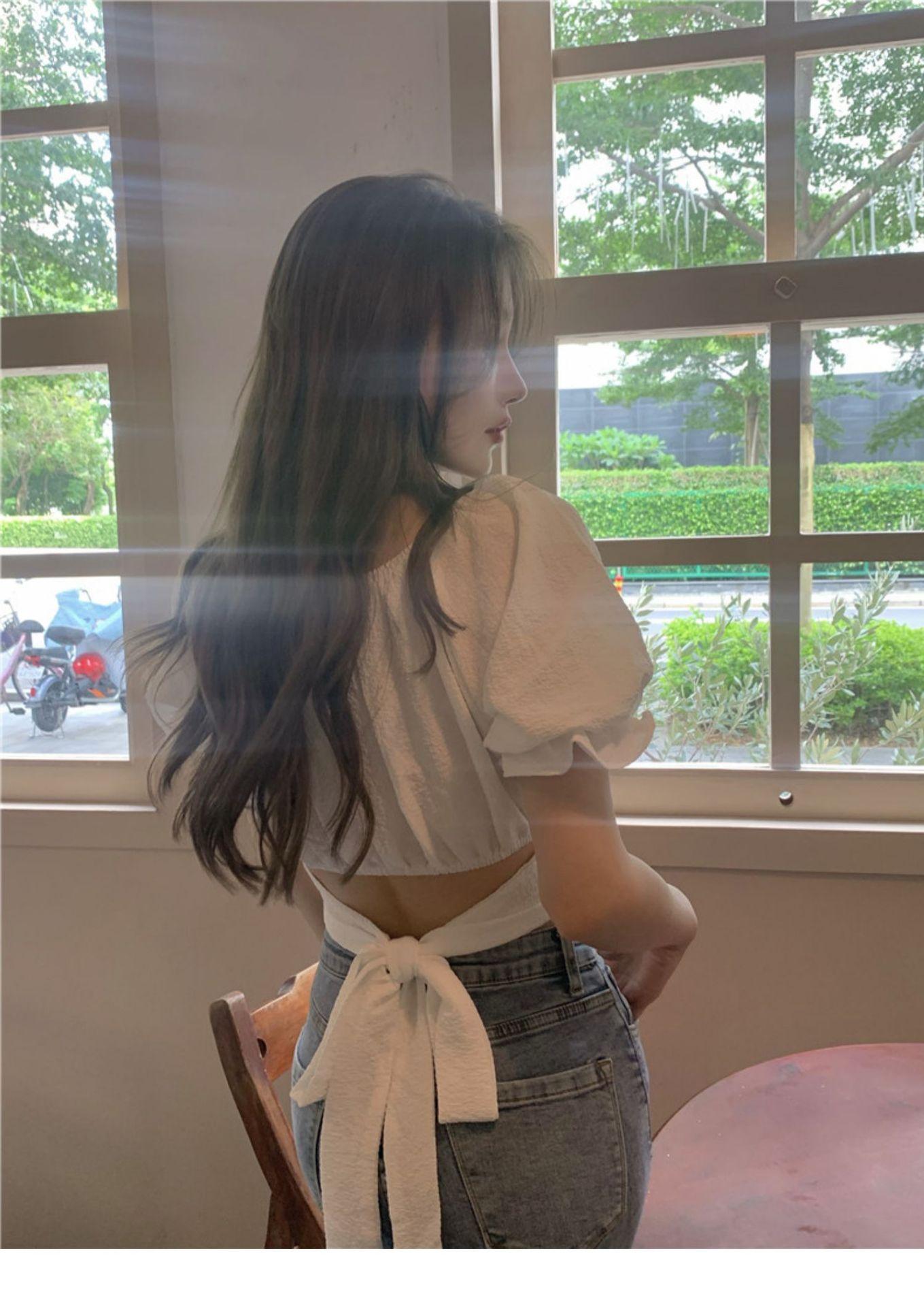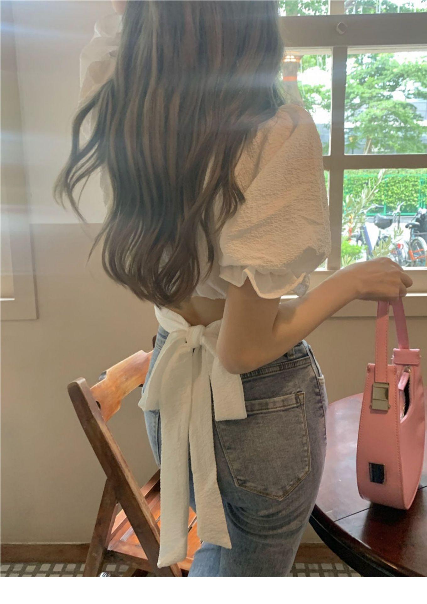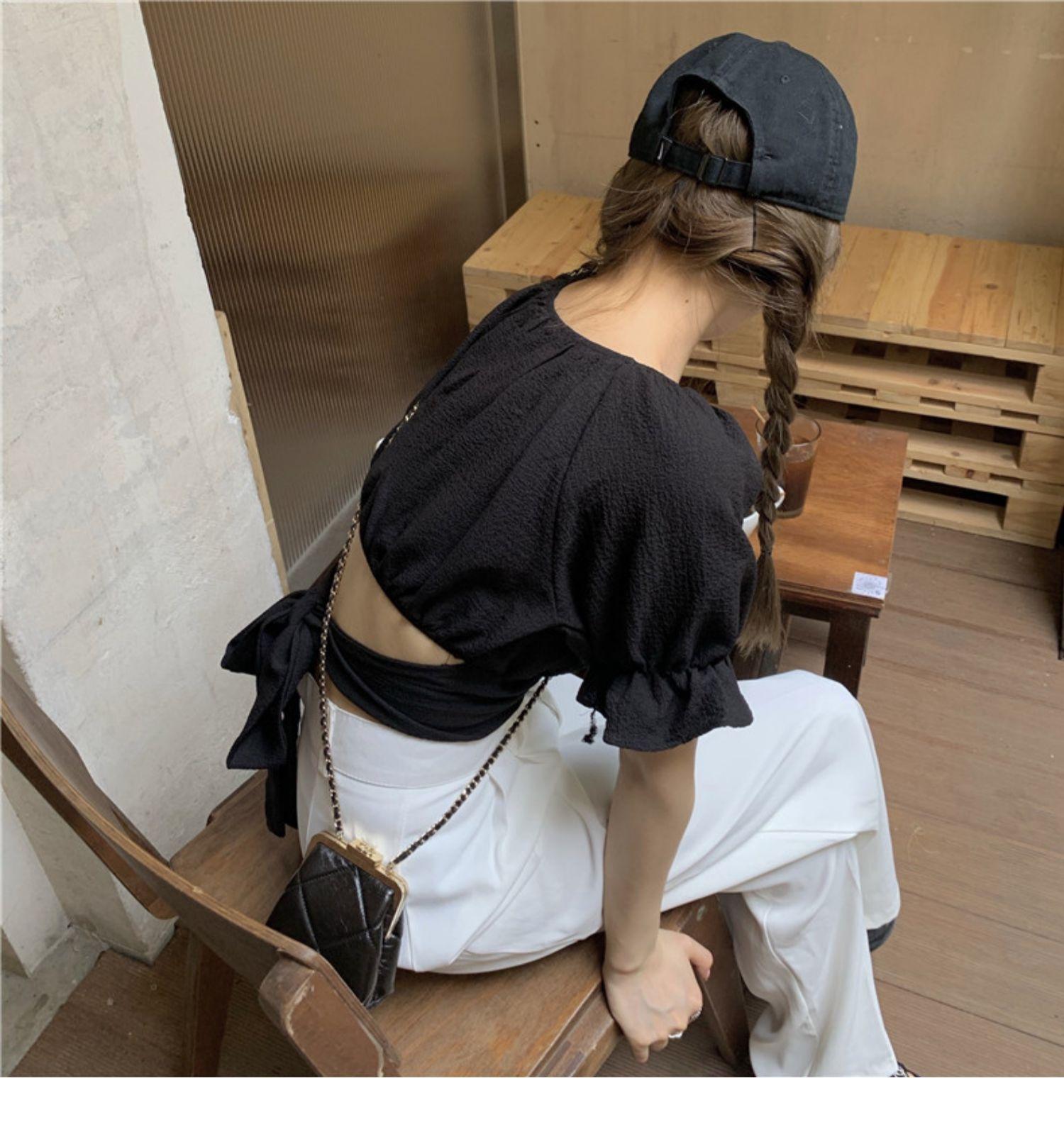 Top Blanco de Manga Abullonada para Mujer, Verano Corto Diseño Francés, Novedoso Camisa de Manga Corta Dulce y Picante con Lazo en la Espalda para Chicas Calientes