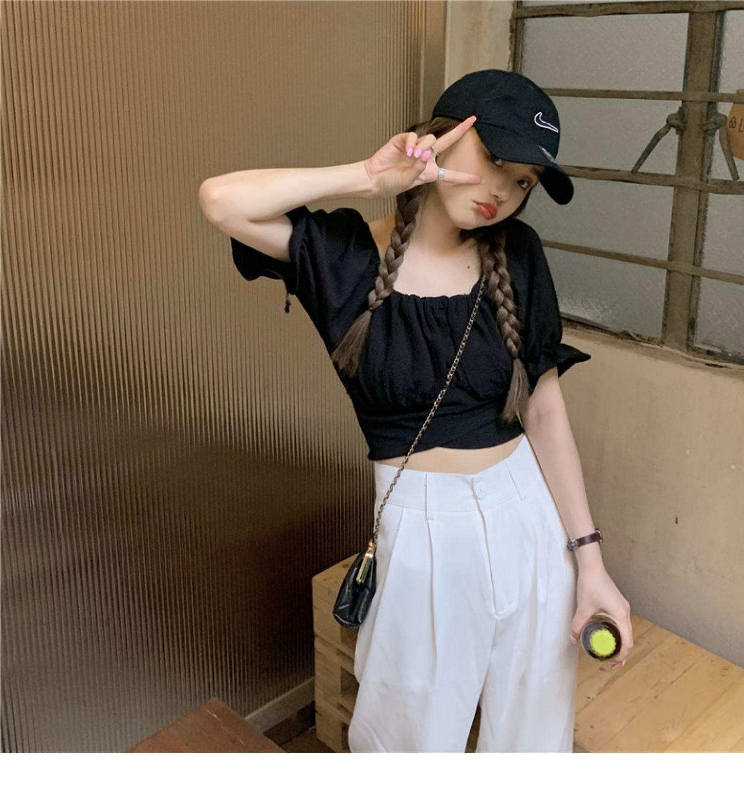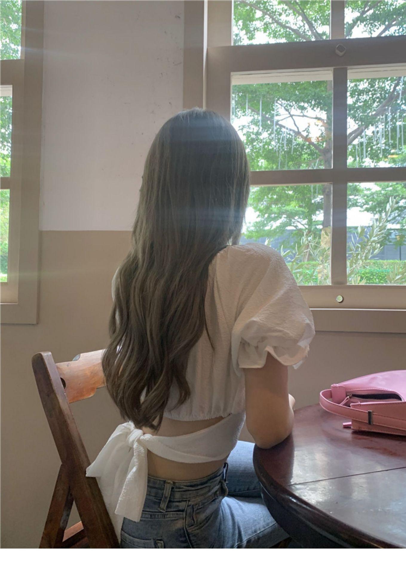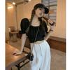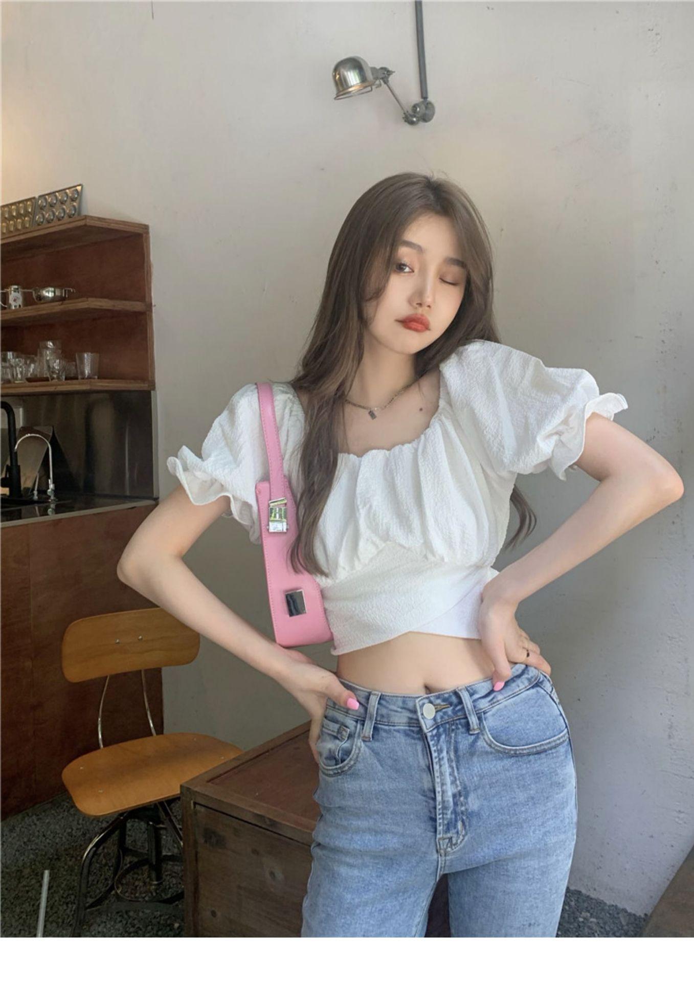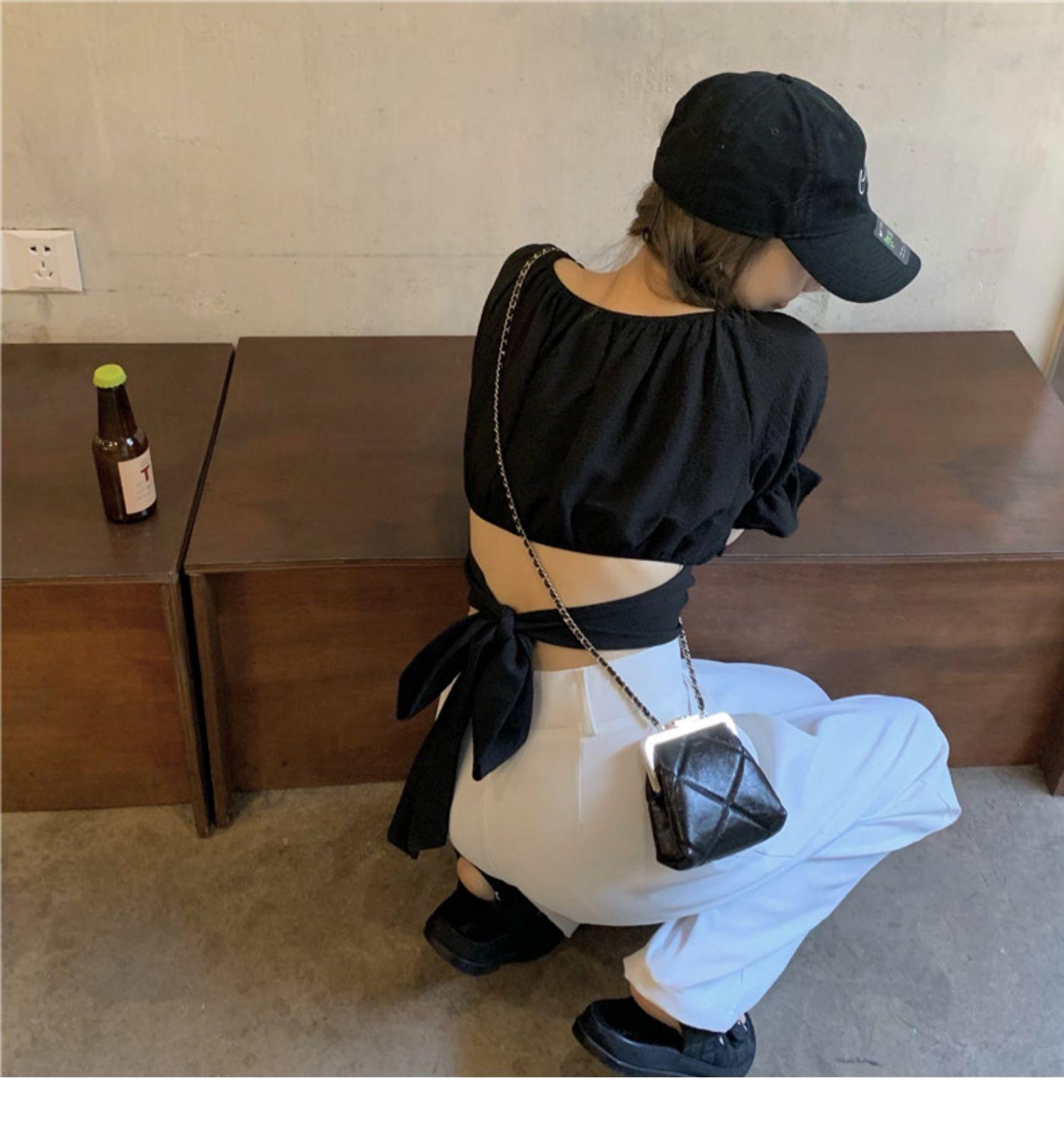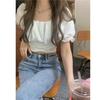 Top Blanco de Manga Abullonada para Mujer, Verano Corto Diseño Francés, Novedoso Camisa de Manga Corta Dulce y Picante con Lazo en la Espalda para Chicas Calientes