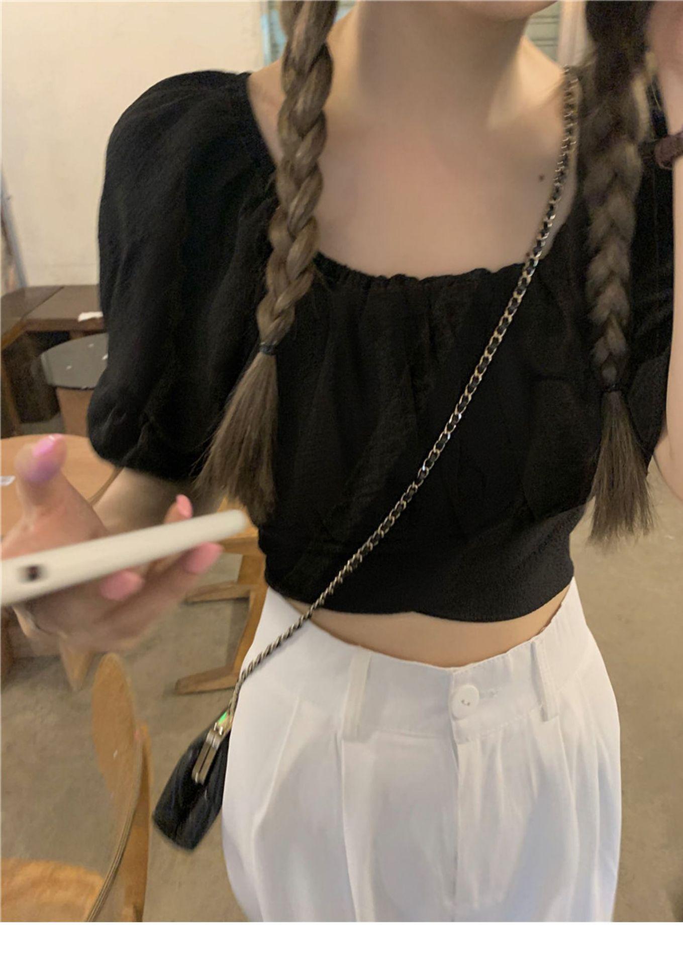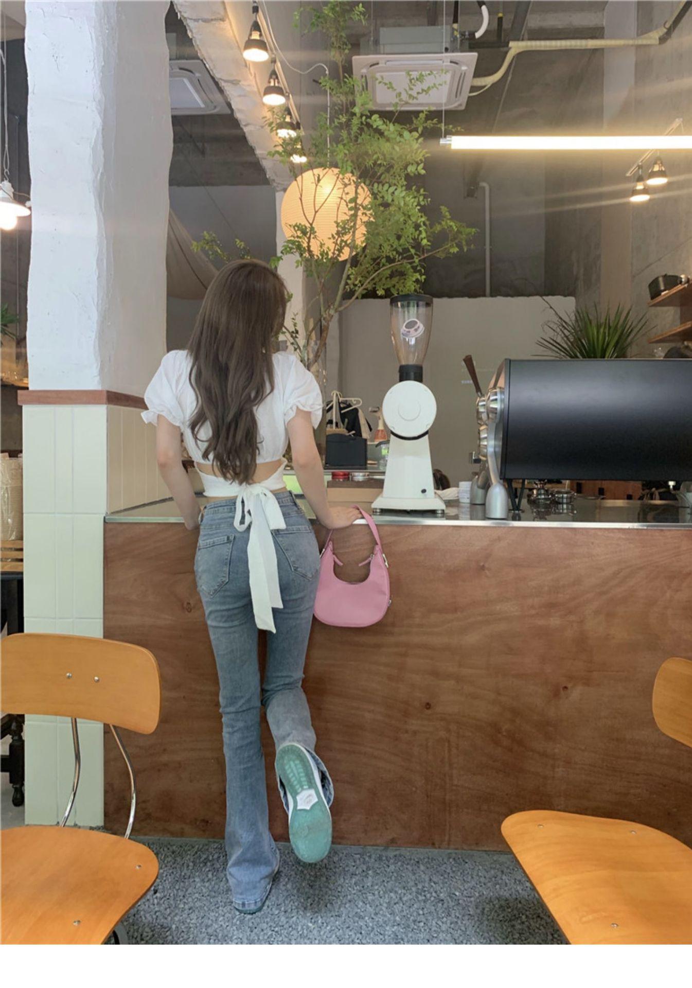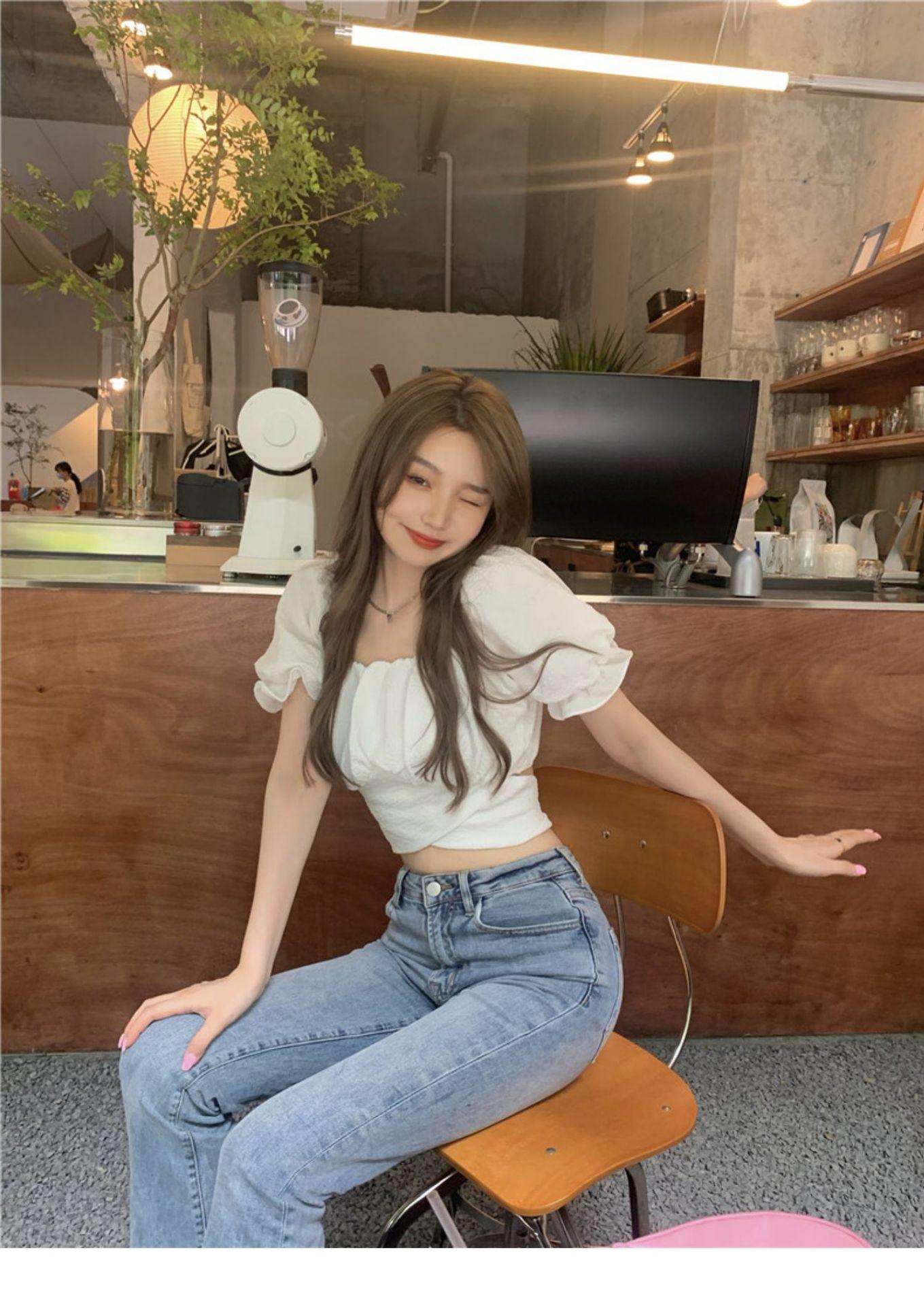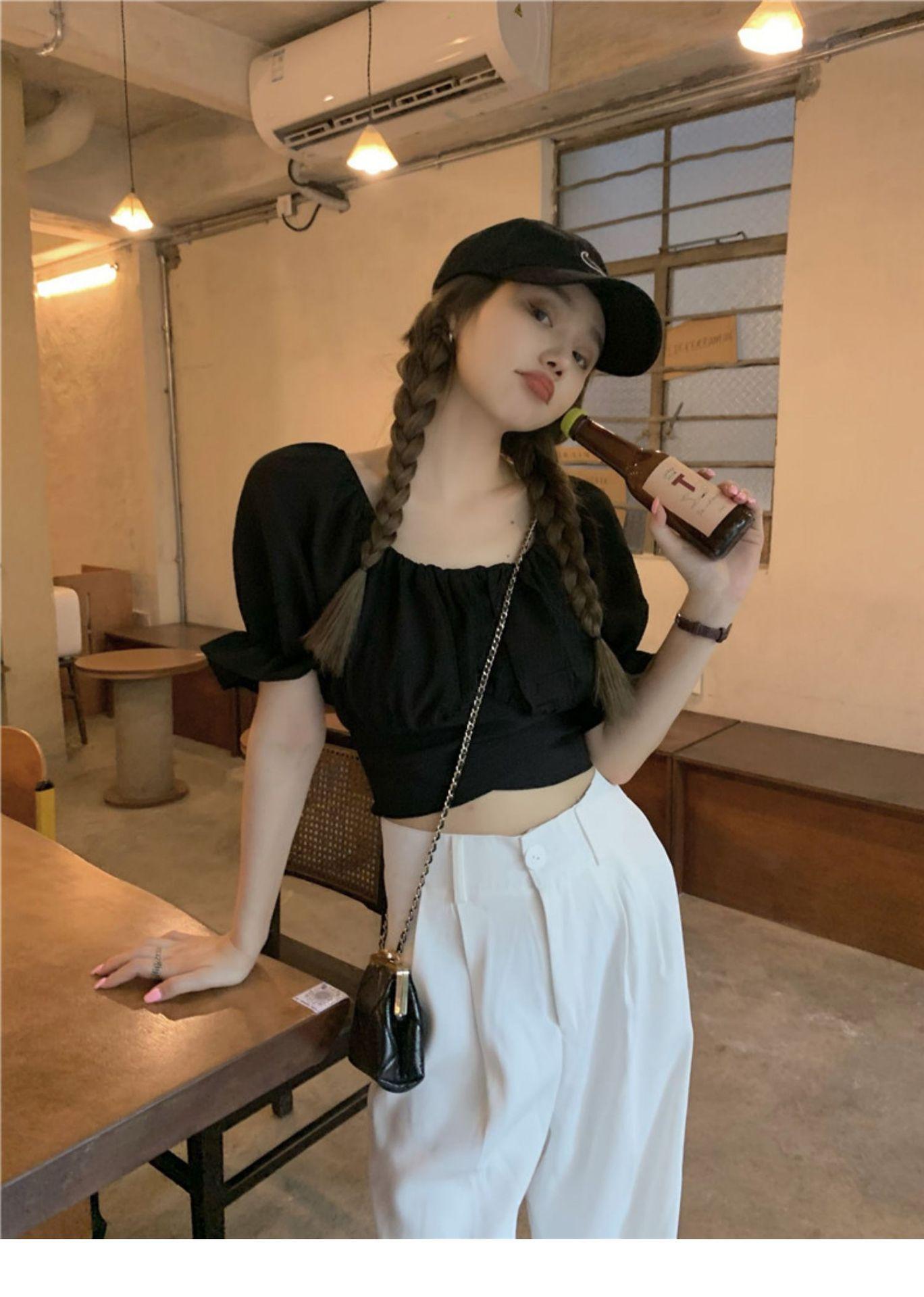 Top Blanco de Manga Abullonada para Mujer, Verano Corto Diseño Francés, Novedoso Camisa de Manga Corta Dulce y Picante con Lazo en la Espalda para Chicas Calientes