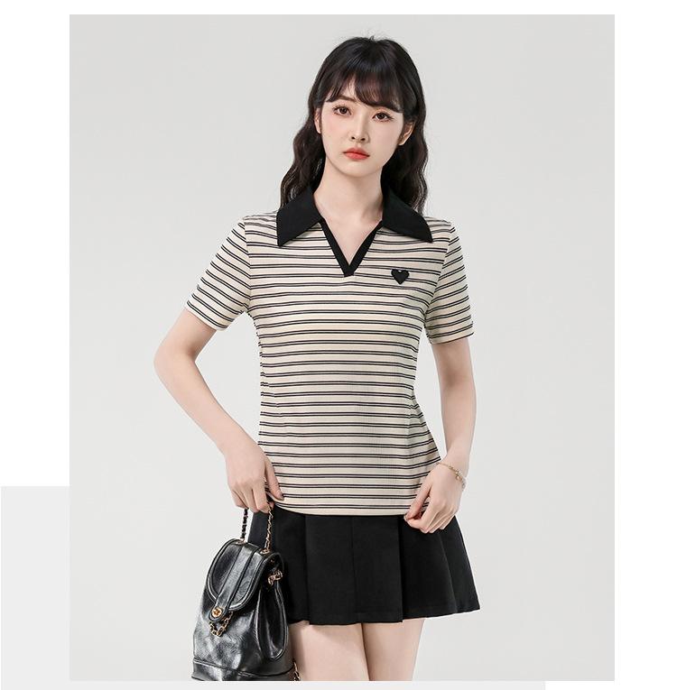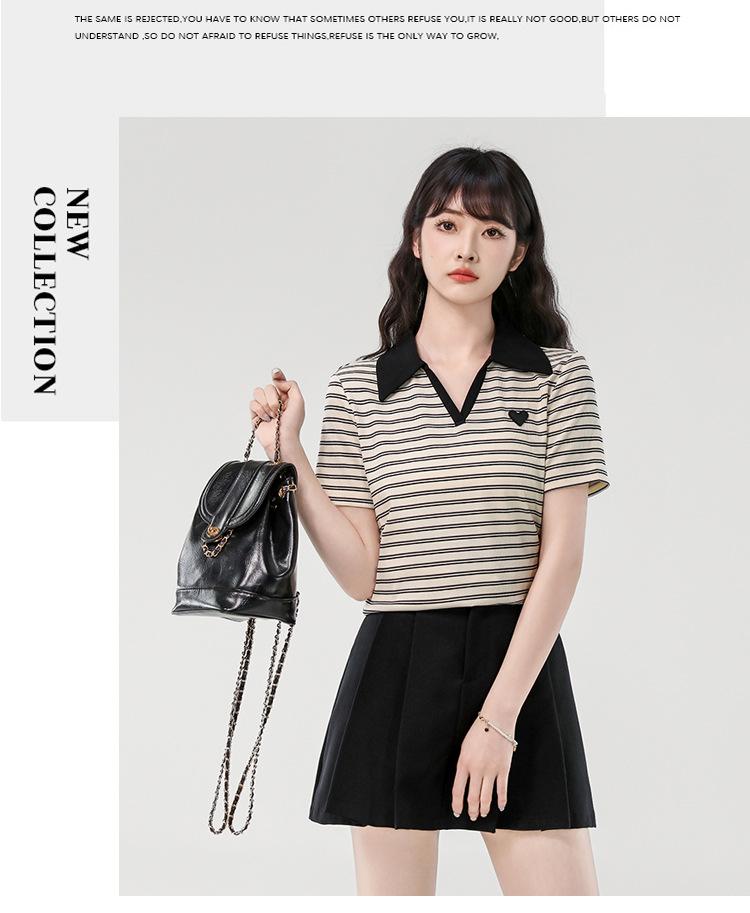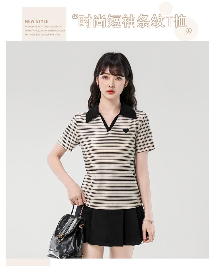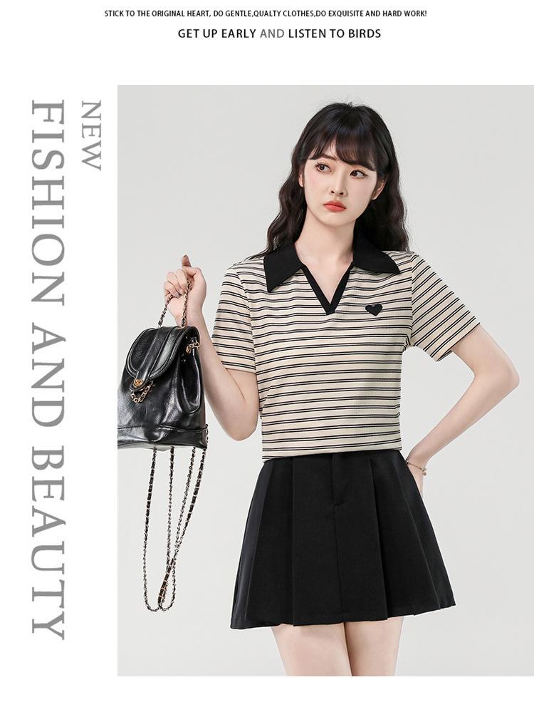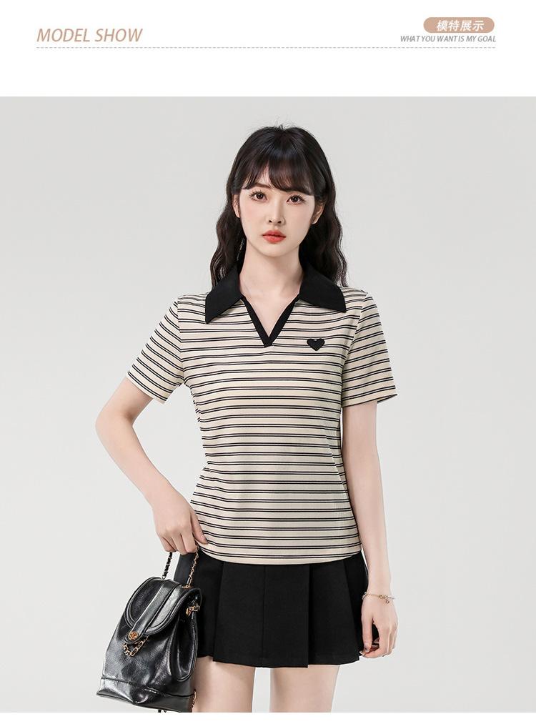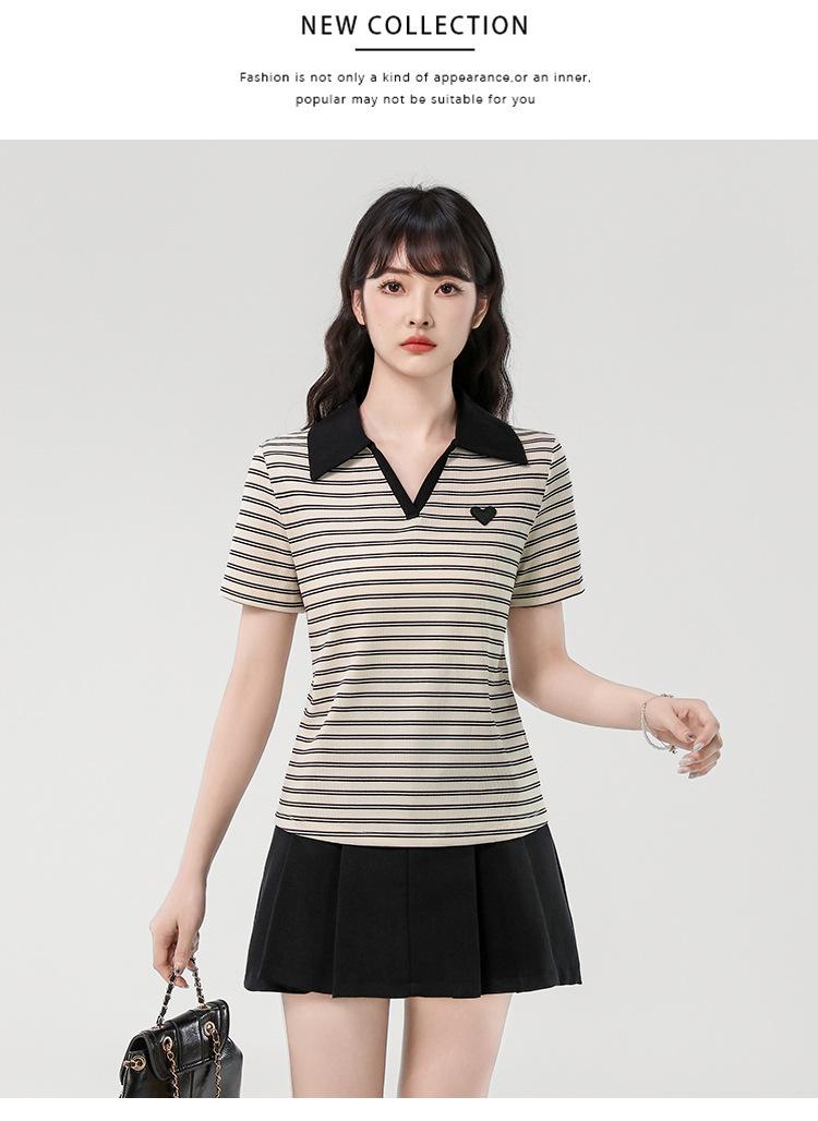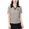Playera de Manga Corta con Cuello Polo Rayado en Contraste Camisa Pequeña Verano 2025 Nueva Holgada Casual Hombro Moda para Mujer