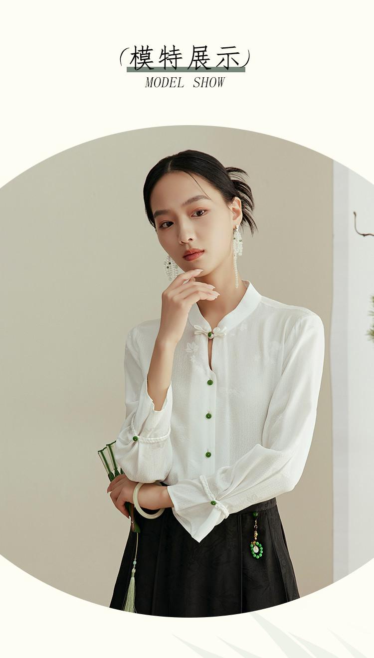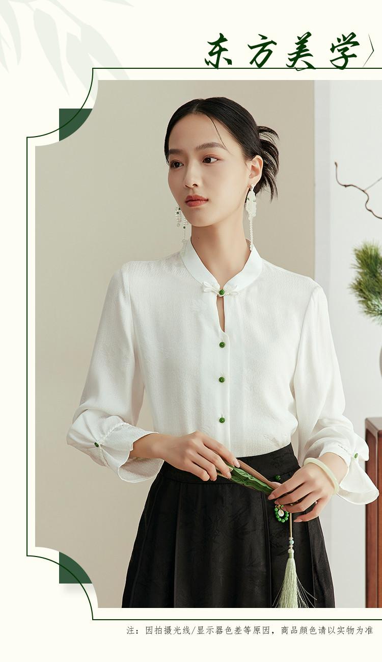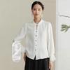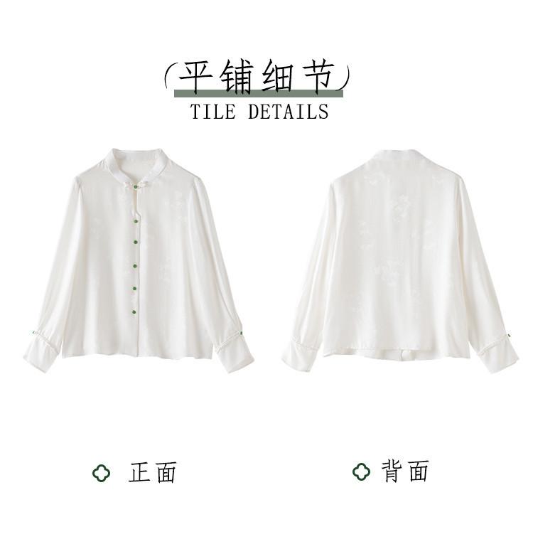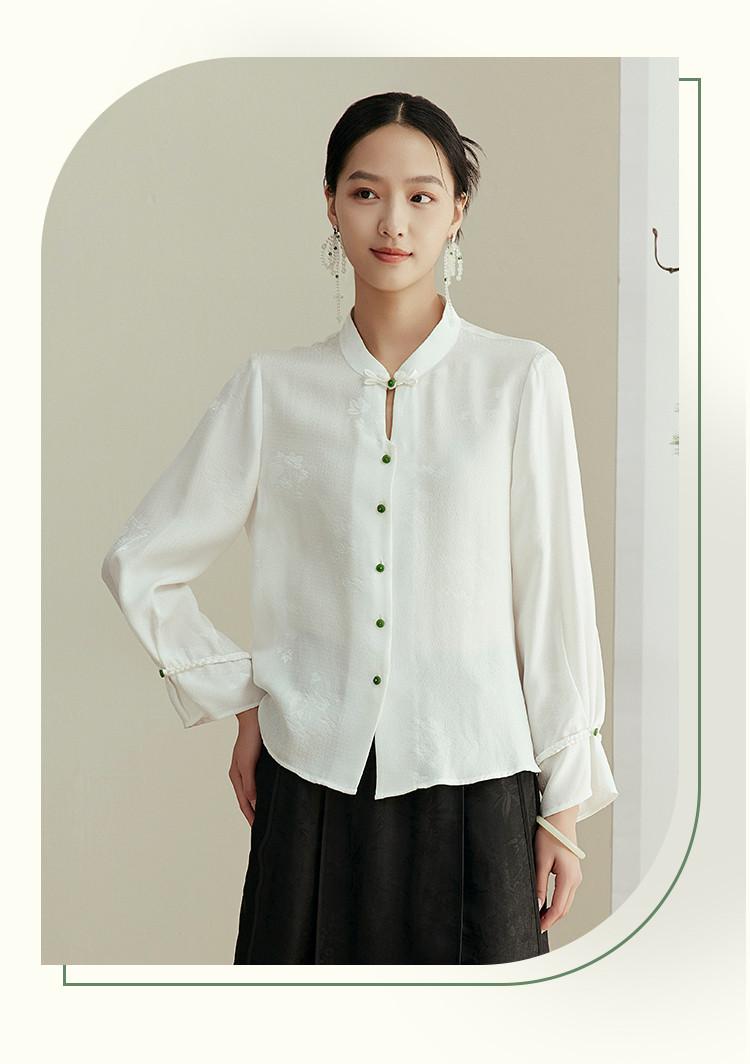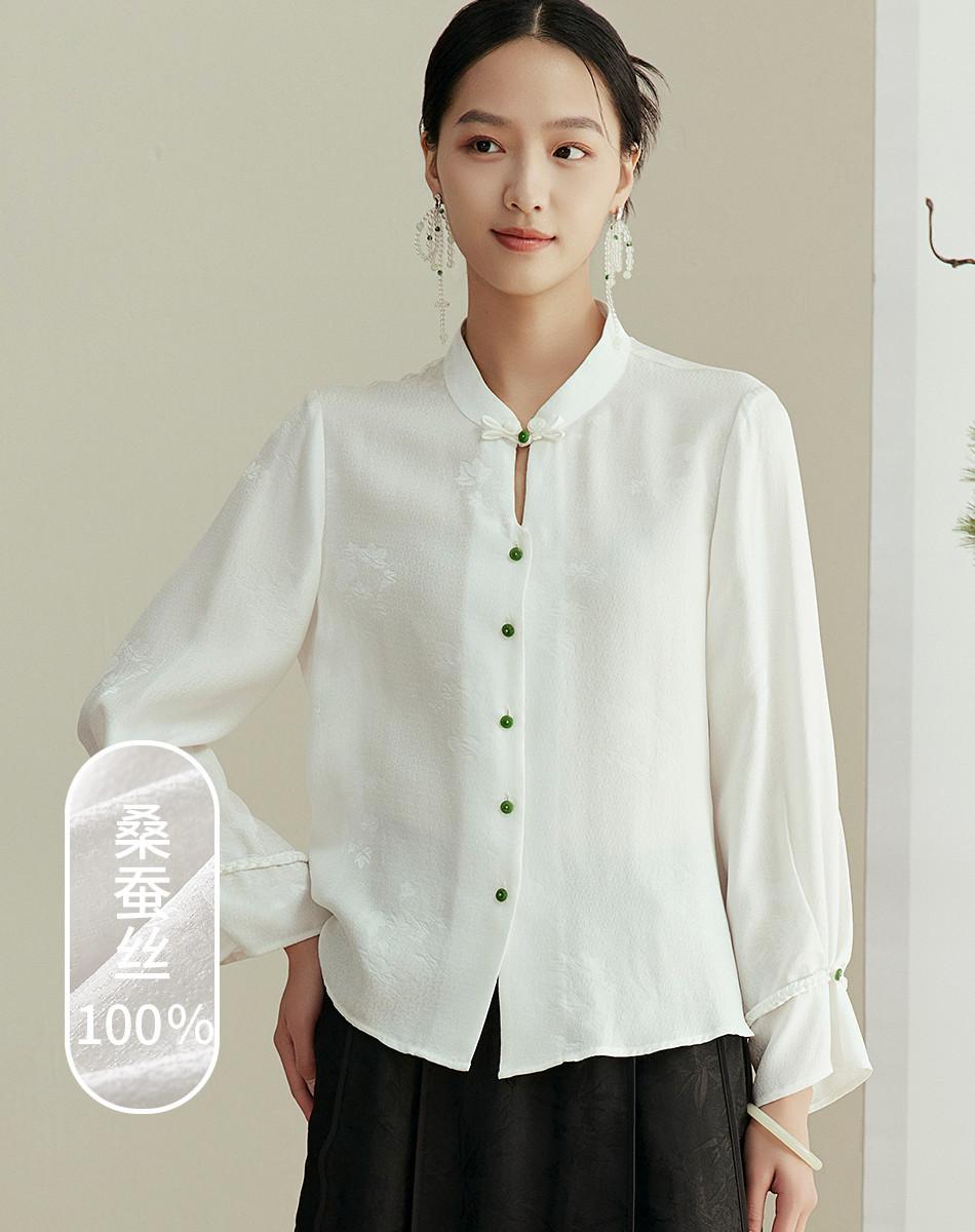 [Seda de Morera 100%] Primavera y Verano Nueva Seda Nuevo Estilo Chino Elegante Estilo Nacional Cuello Mao Abotonada Seda Camisa de Mujer