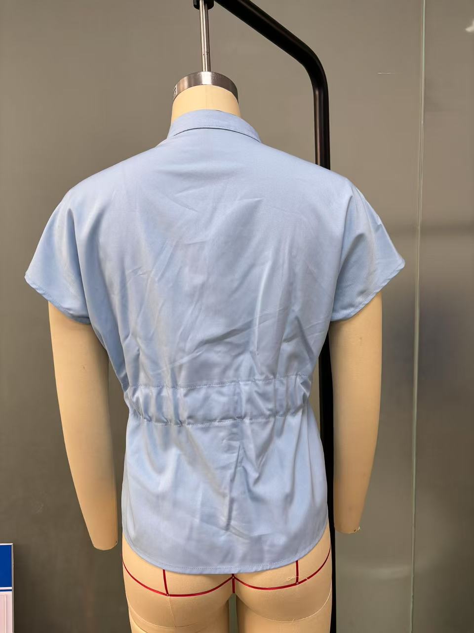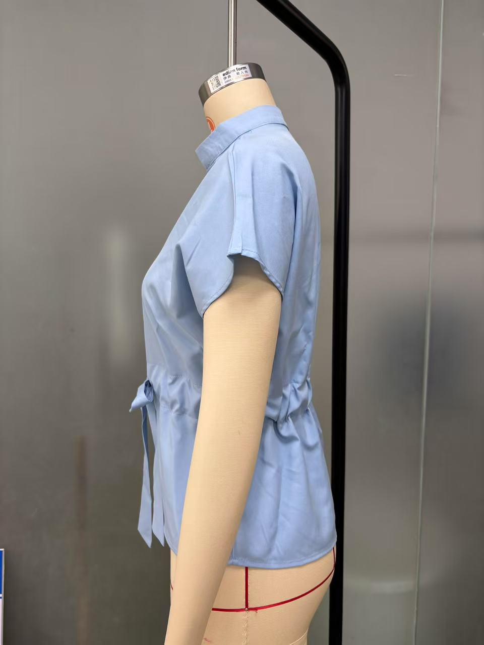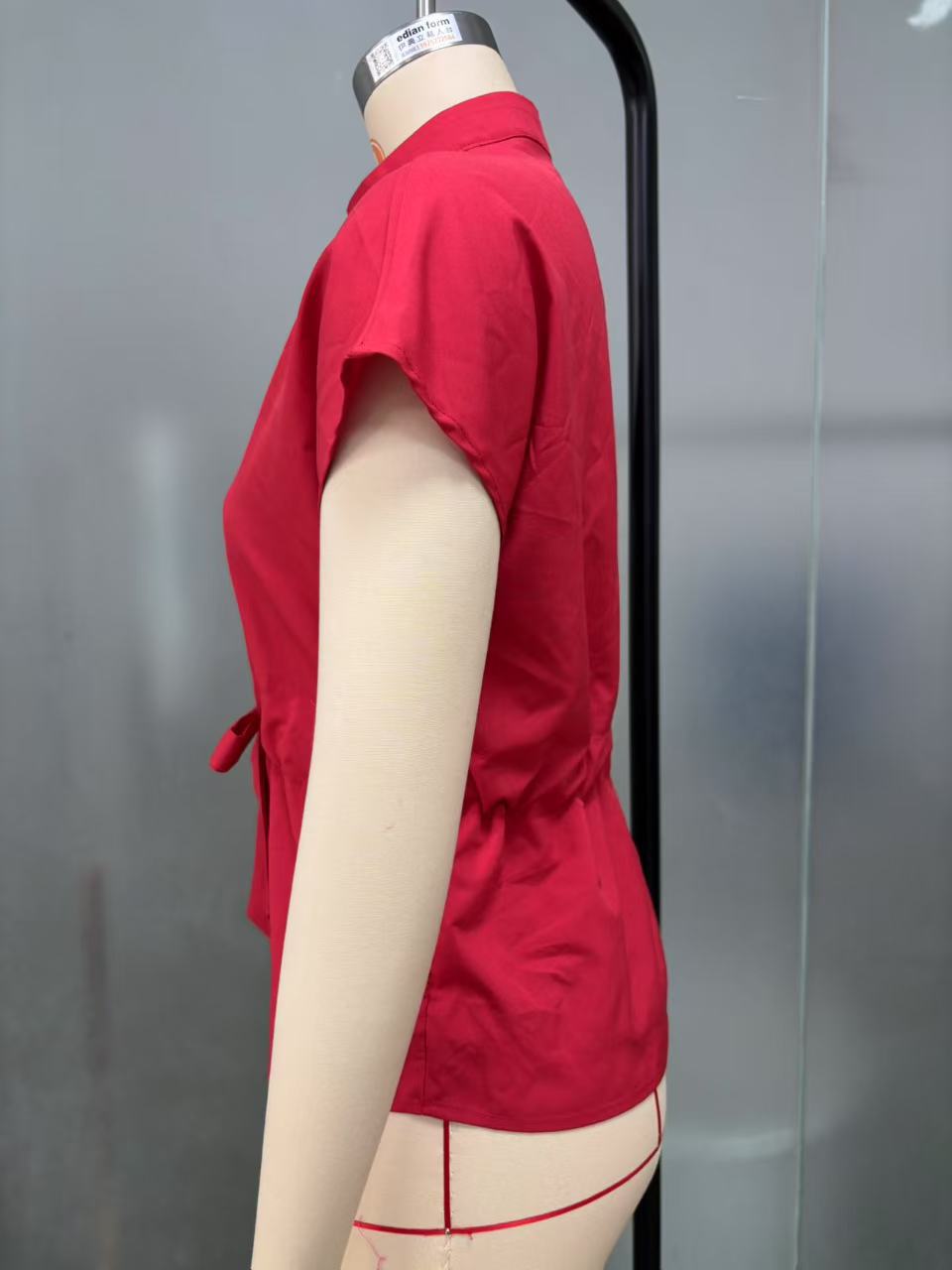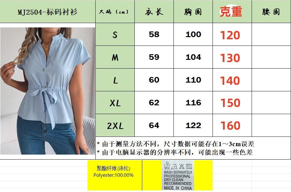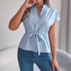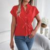 Verano 2025 Amazon Transfronterizo Camisa Manga Corta Chifón Cuello V Abotonada Camisa Elegante Estilo Cinturón Ropa de Mujer