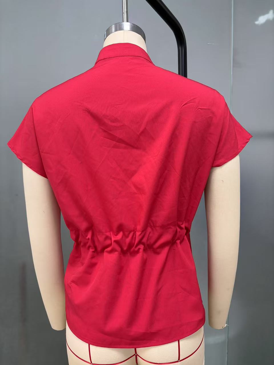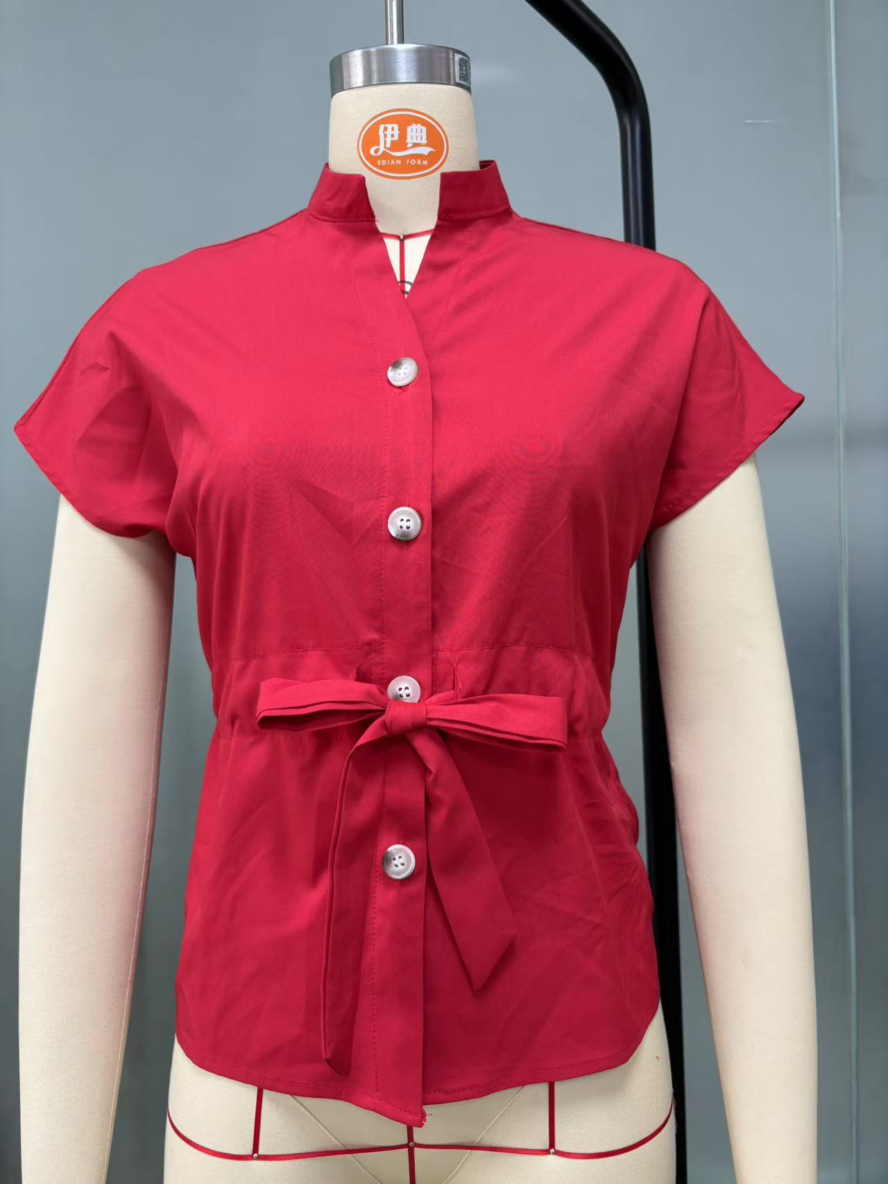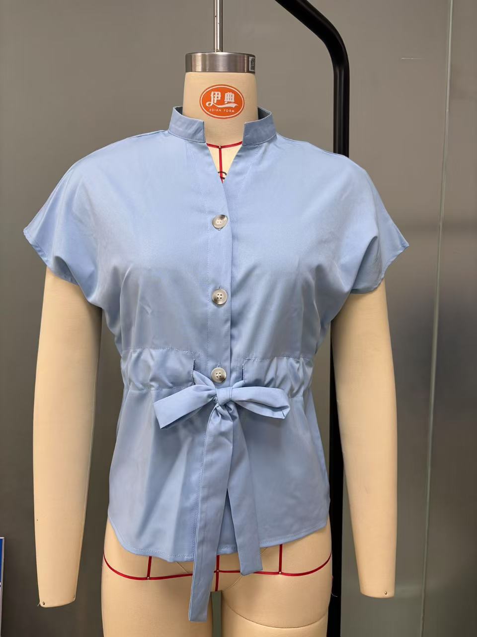 Verano 2025 Amazon Transfronterizo Camisa Manga Corta Chifón Cuello V Abotonada Camisa Elegante Estilo Cinturón Ropa de Mujer