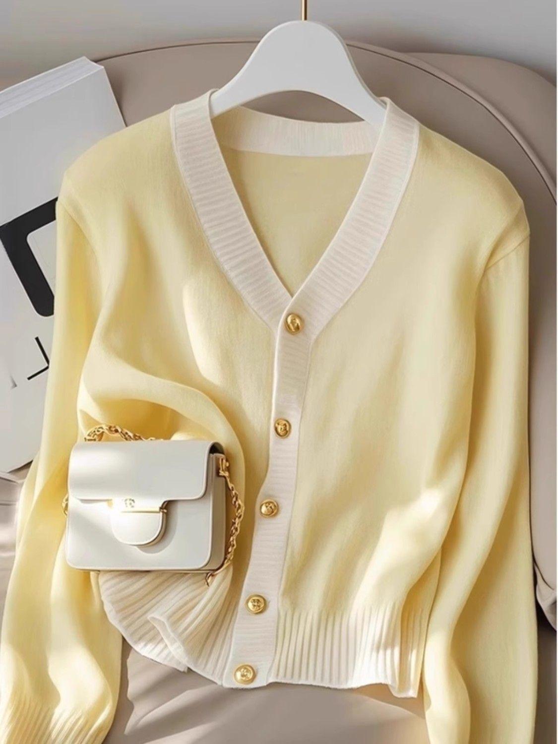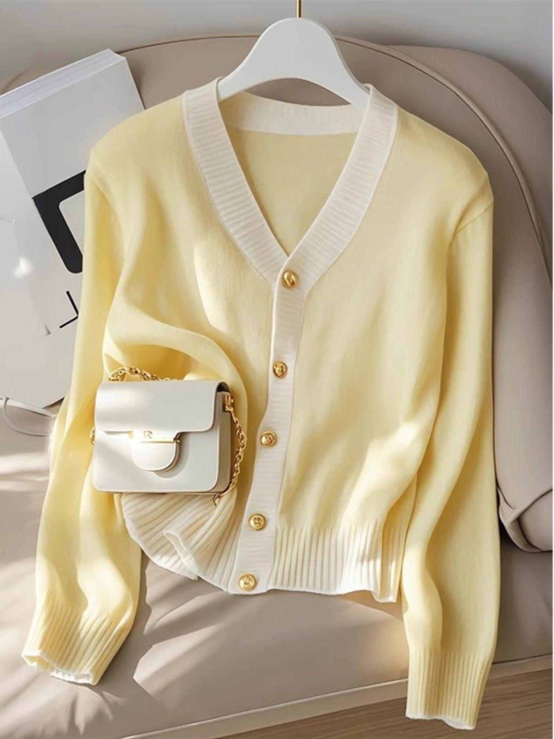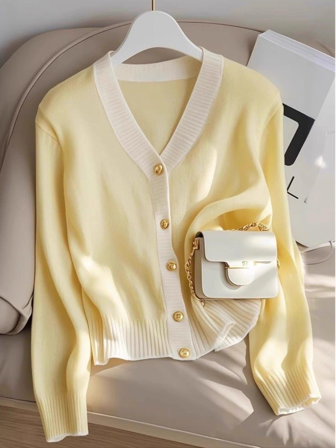 [Mismo Estilo en el Mostrador] Primavera y Otoño 2025 Nuevo Estilo Cuello en V Fragante Pequeño Manga Larga Amarillo Claro Elegante Estilo Occidental Prendas de Punto para Mujer