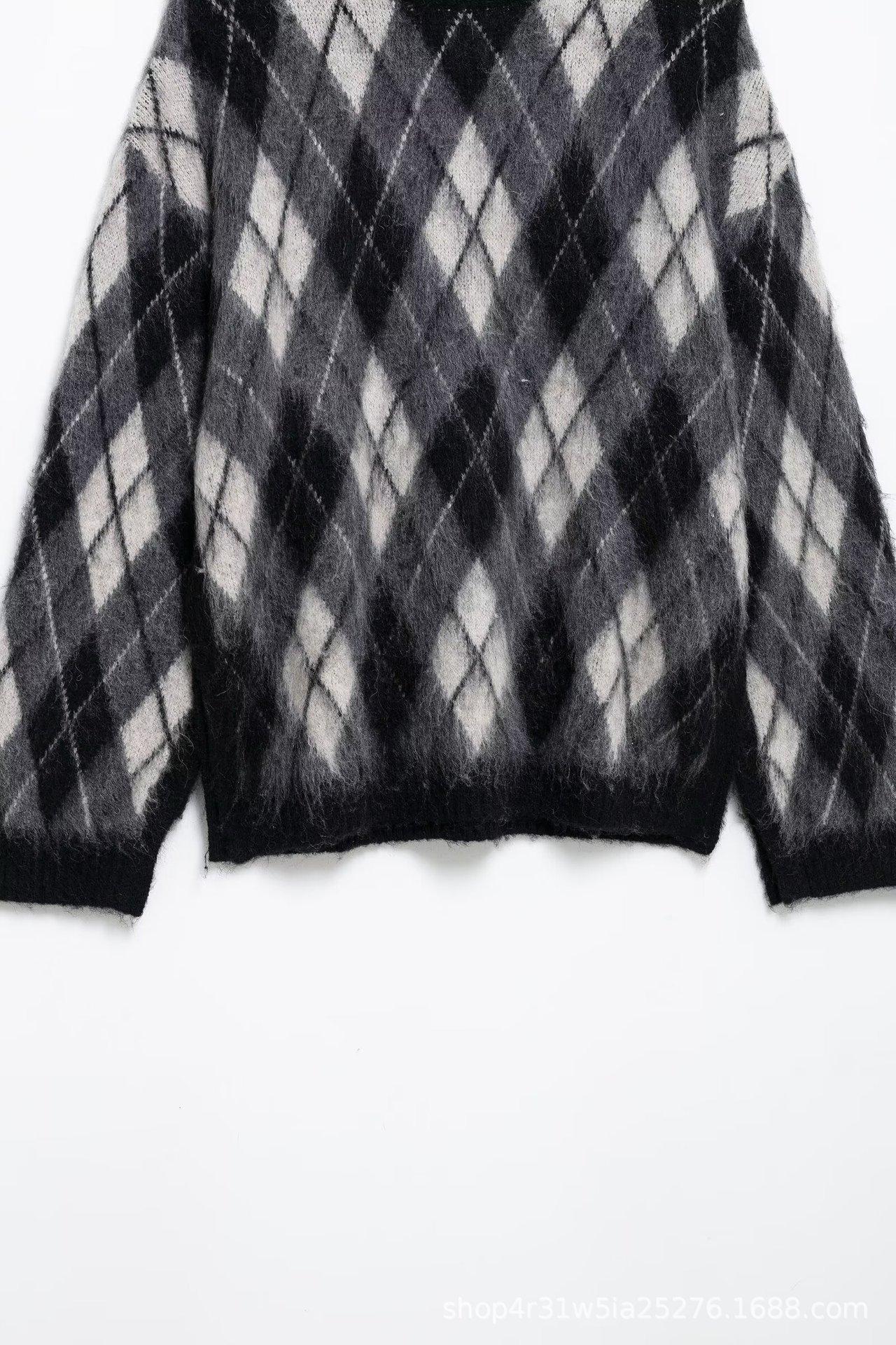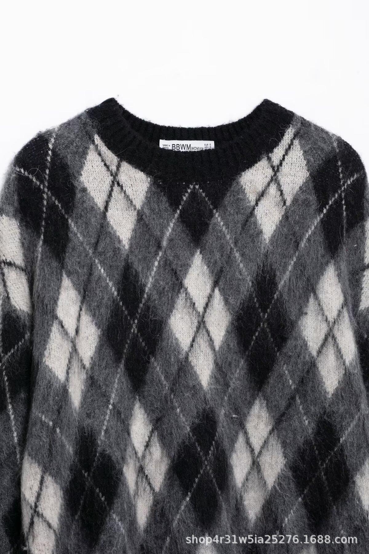 Venta al por mayor transfronteriza europea y americana 2024 Invierno Nuevo Street Fashion para mujer Cuello redondo Patrón de rombos Suéter Tejido