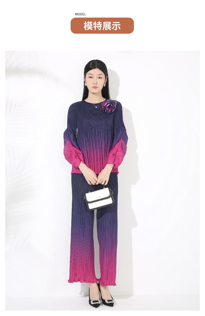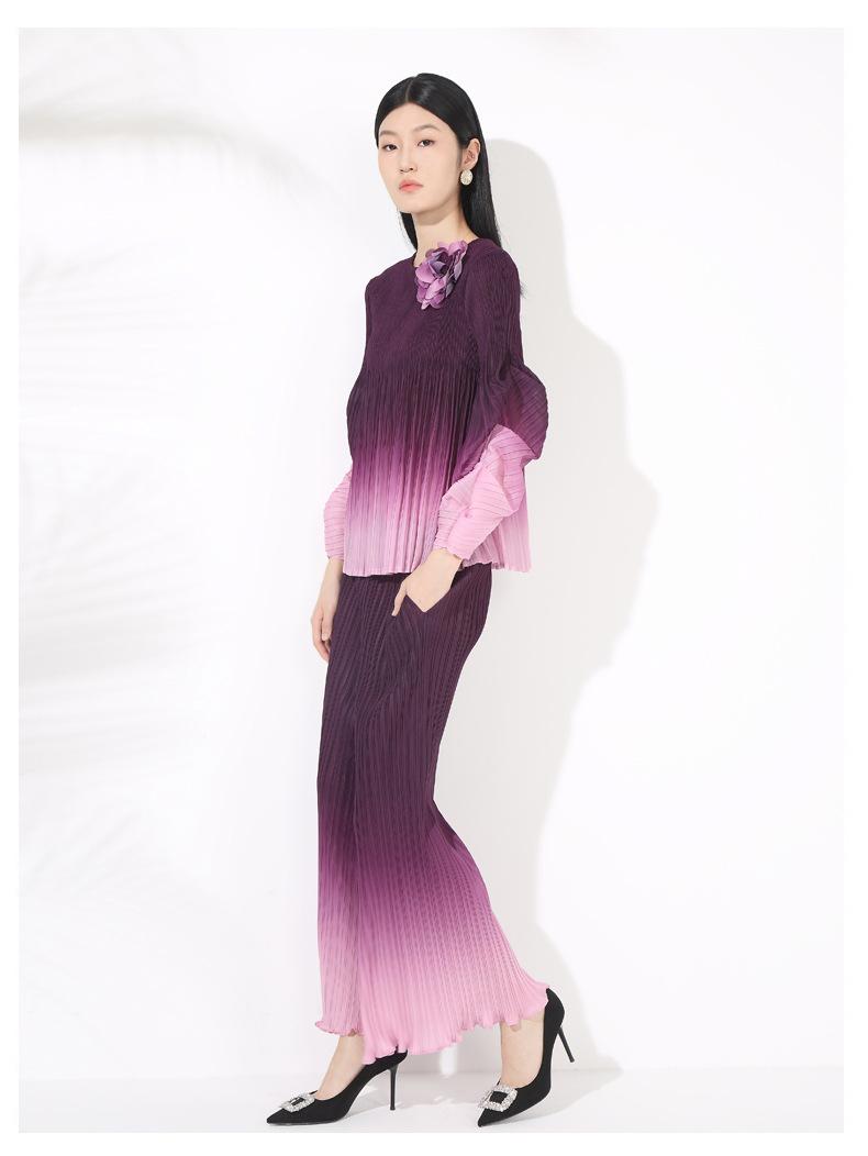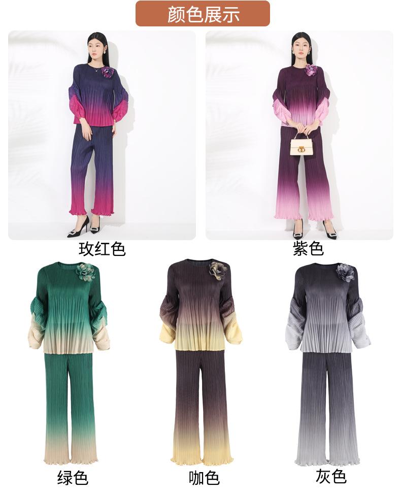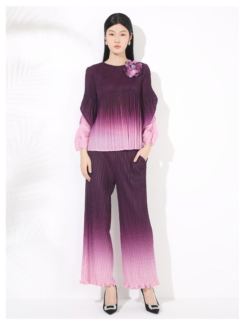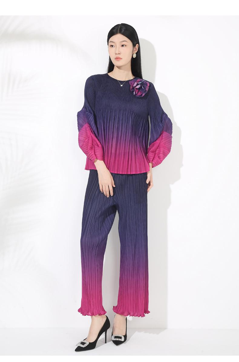 Traje plisado de moda degradado para mujer con sentido del diseño, flor decorativa, top plisado, pantalones de pierna ancha de cintura alta, conjunto de dos piezas