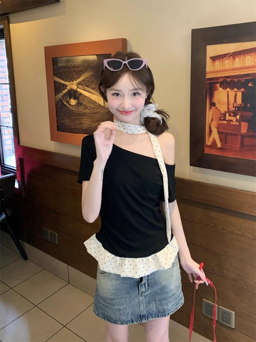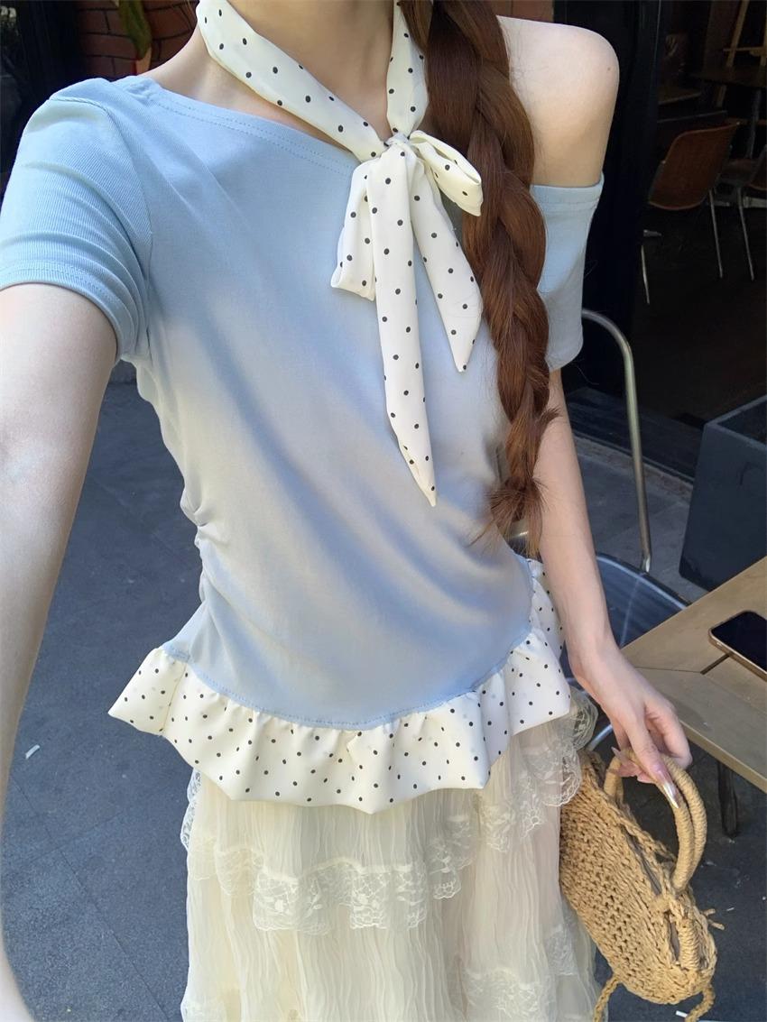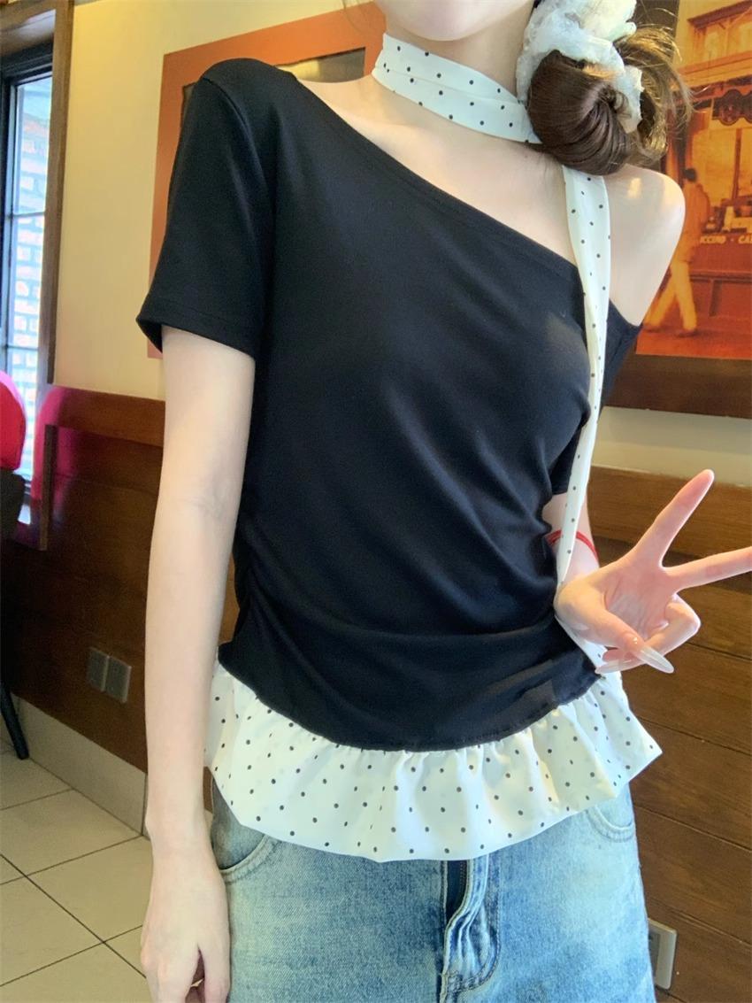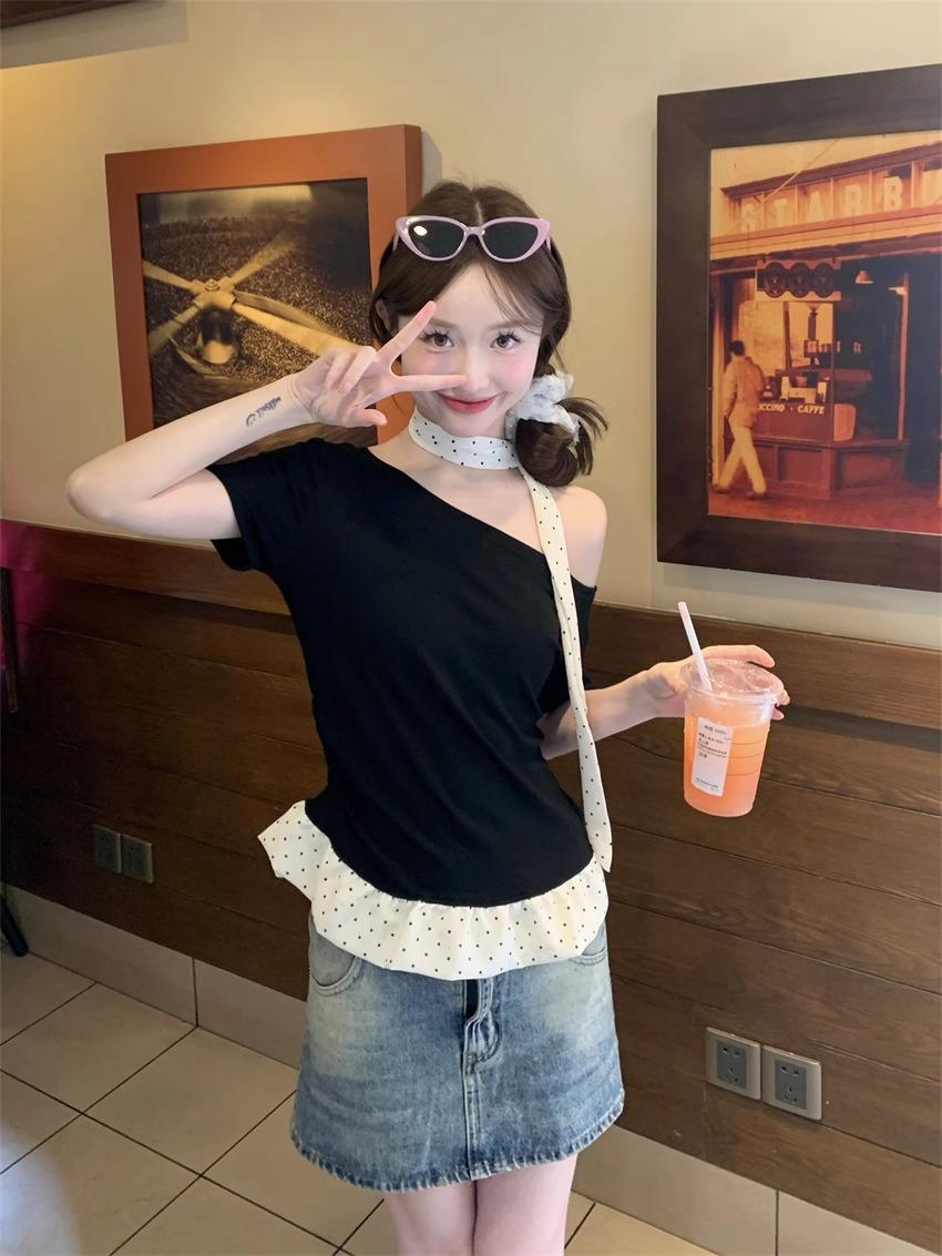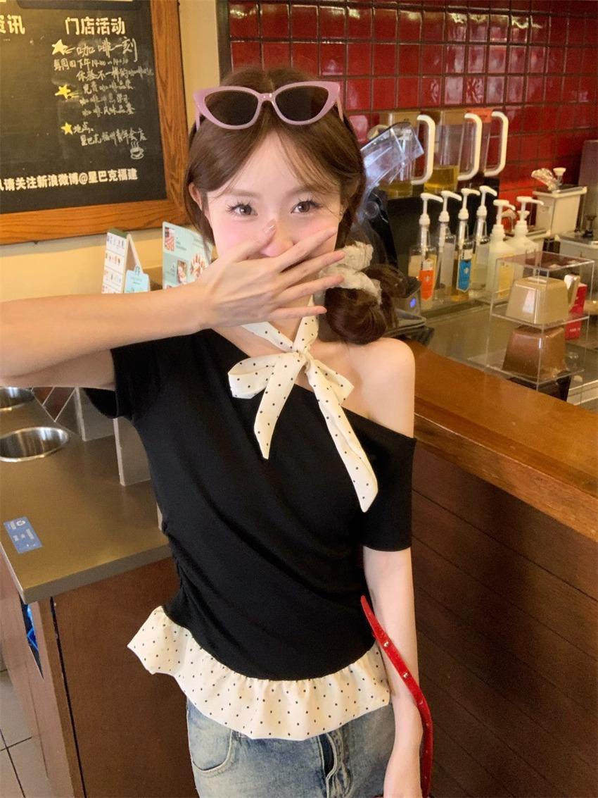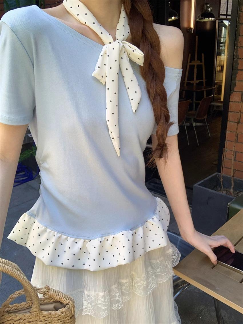 Verano Hombro Inclinado Manga Corta Hombro Derecho Versátil Look Adelgazante Top para Mujer Dulce y Fresco Dobladillo Lunares Diseño de Volantes Camiseta