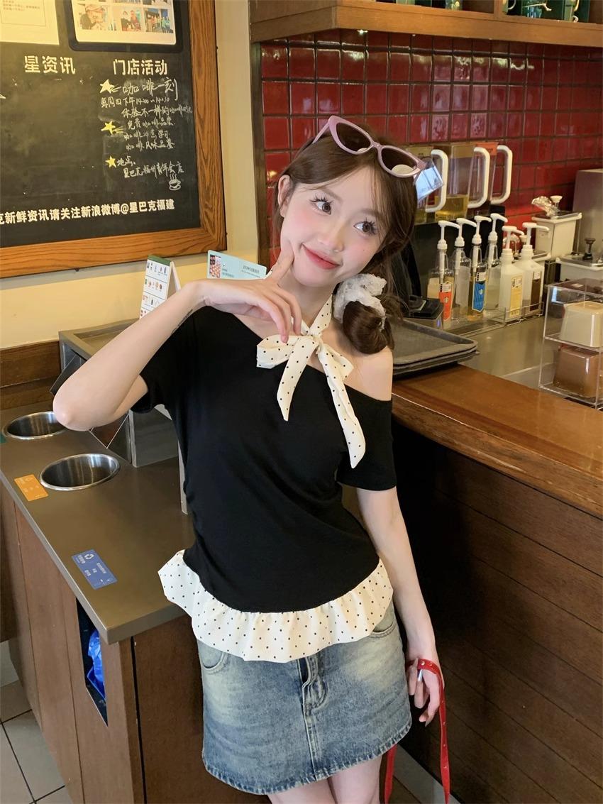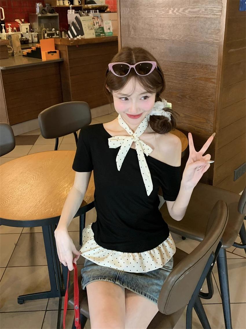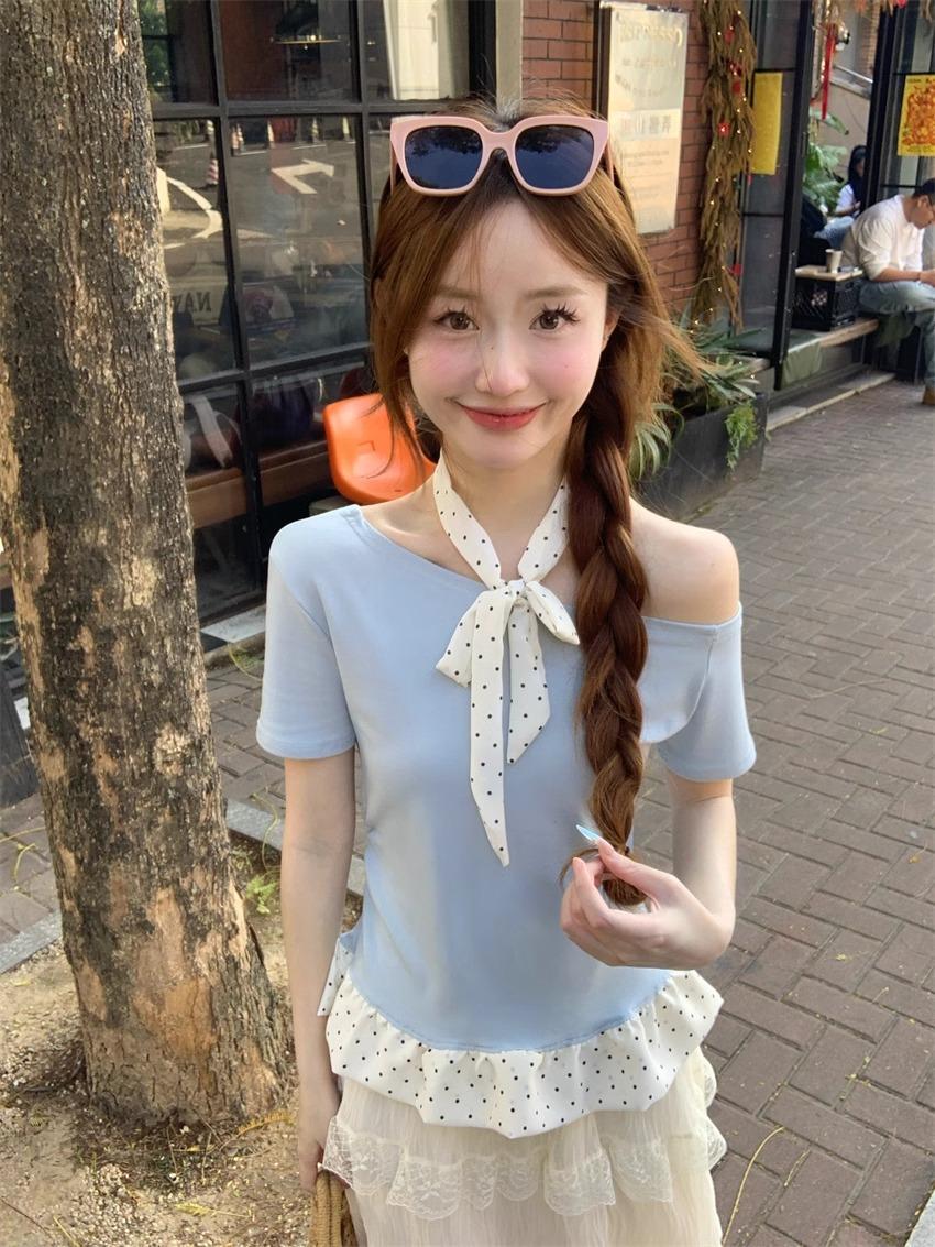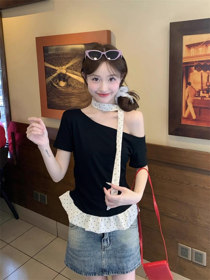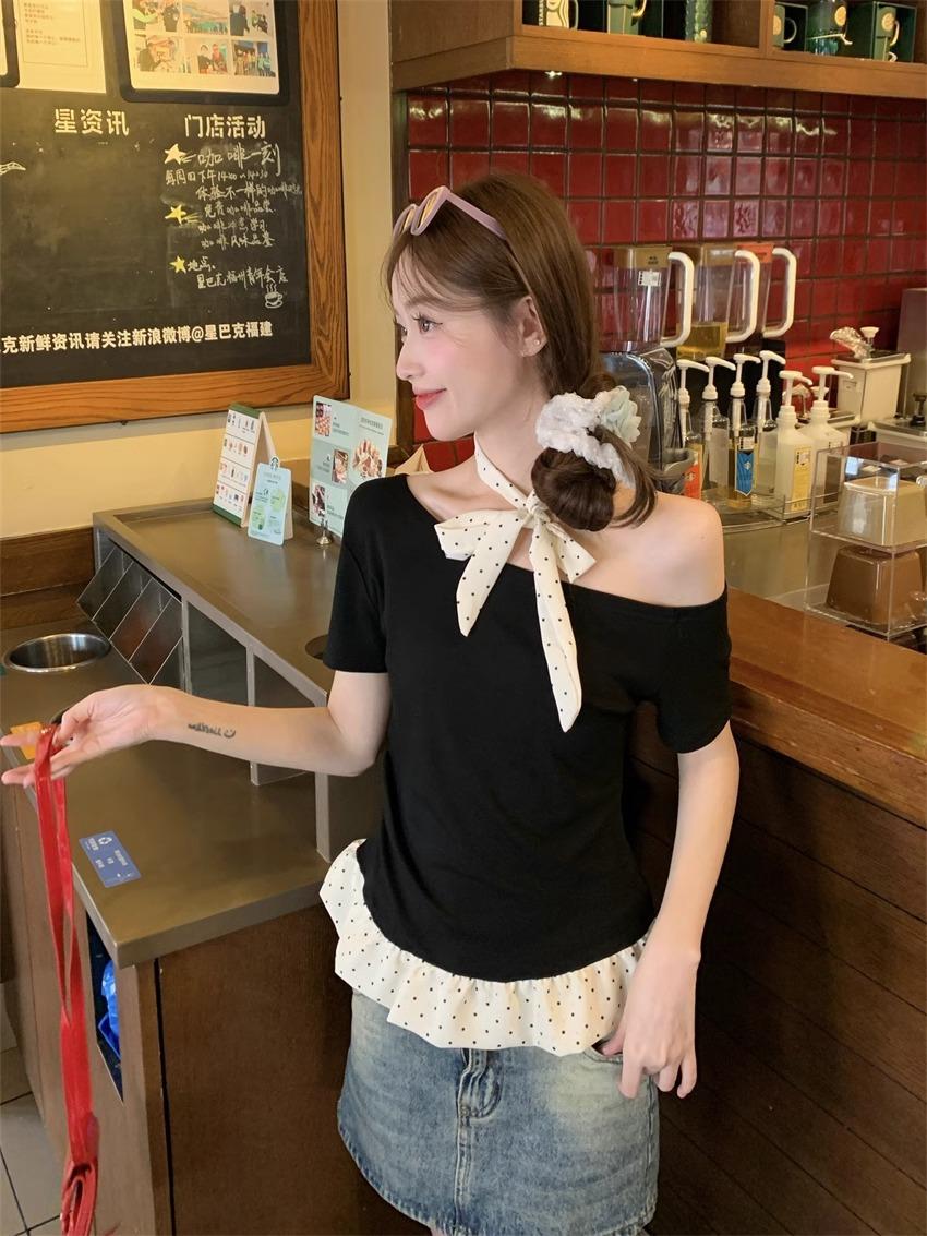 Verano Hombro Inclinado Manga Corta Hombro Derecho Versátil Look Adelgazante Top para Mujer Dulce y Fresco Dobladillo Lunares Diseño de Volantes Camiseta