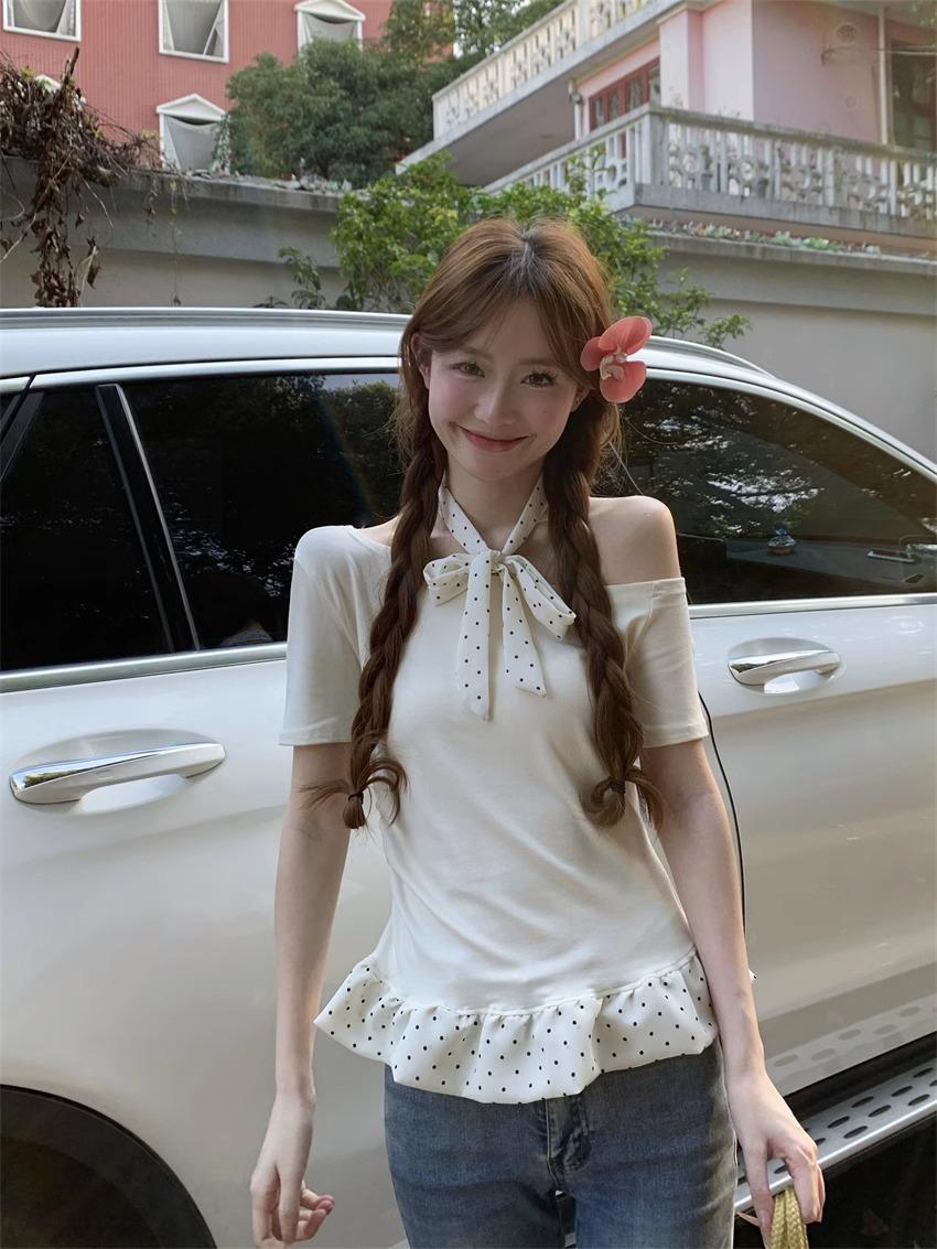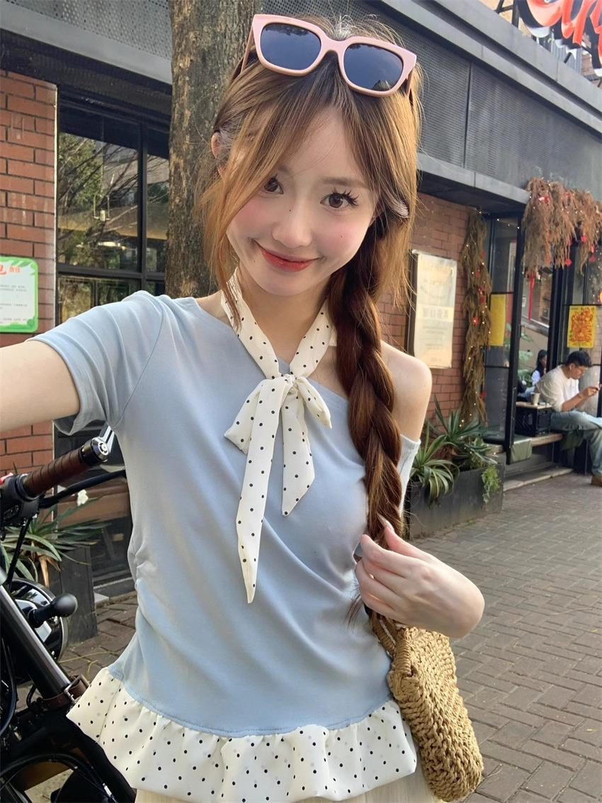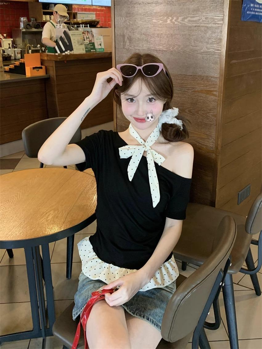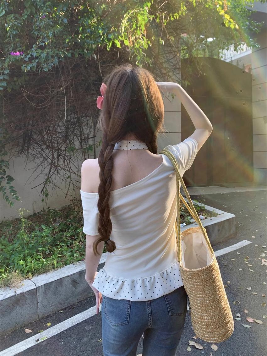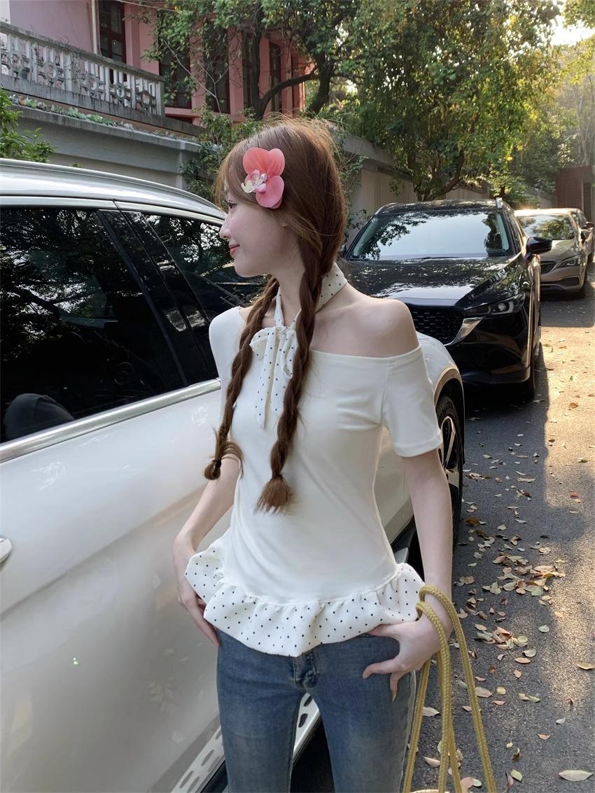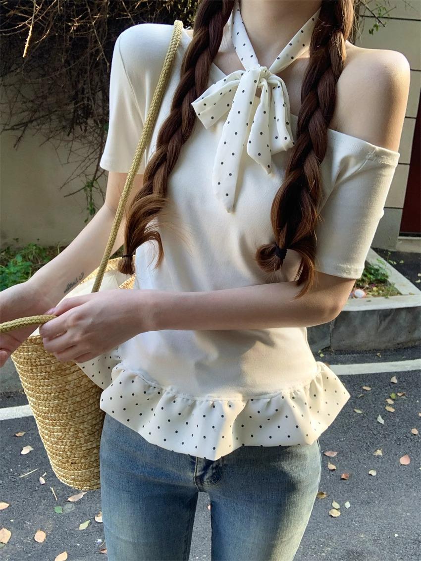 Verano Hombro Inclinado Manga Corta Hombro Derecho Versátil Look Adelgazante Top para Mujer Dulce y Fresco Dobladillo Lunares Diseño de Volantes Camiseta