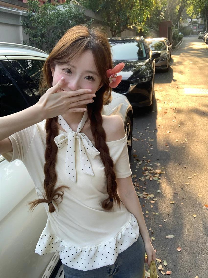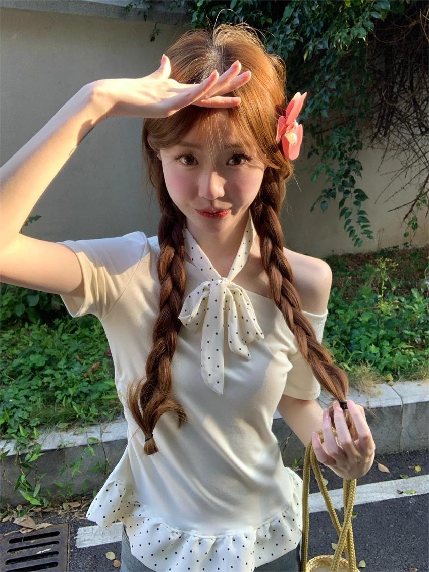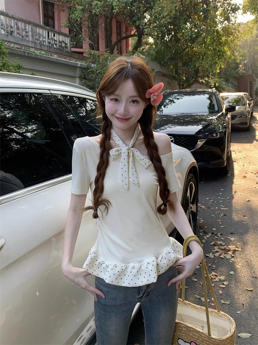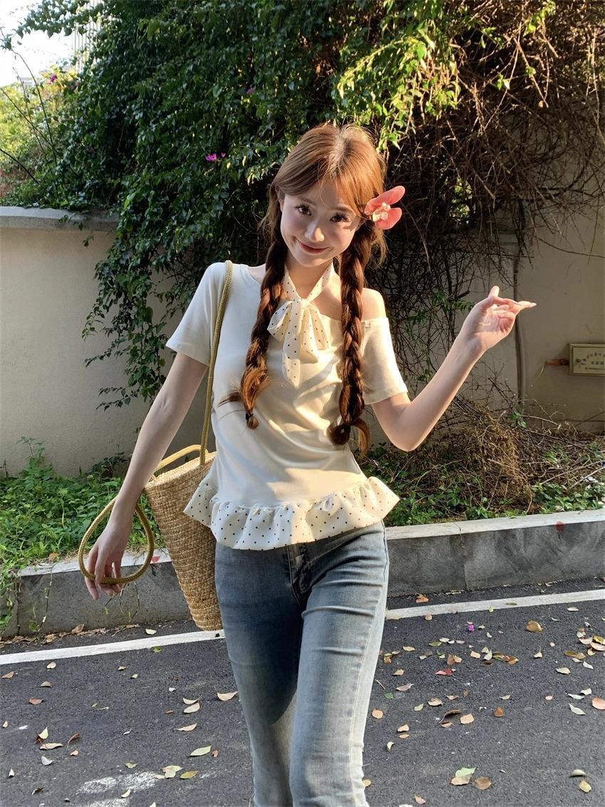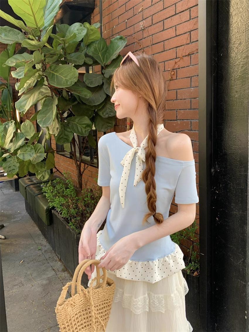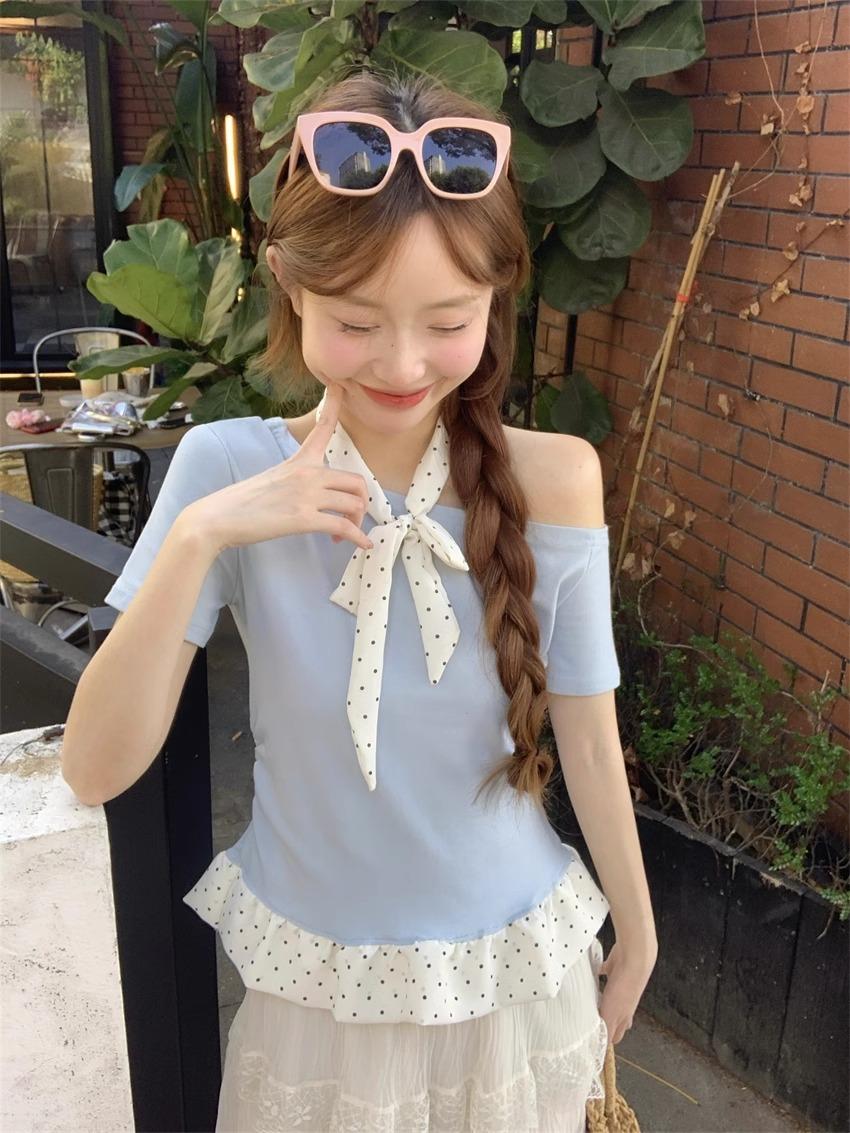 Verano Hombro Inclinado Manga Corta Hombro Derecho Versátil Look Adelgazante Top para Mujer Dulce y Fresco Dobladillo Lunares Diseño de Volantes Camiseta