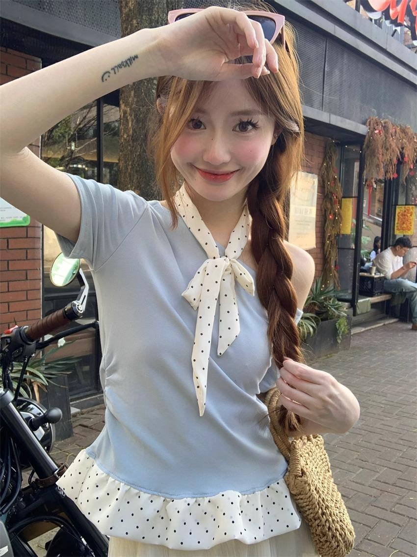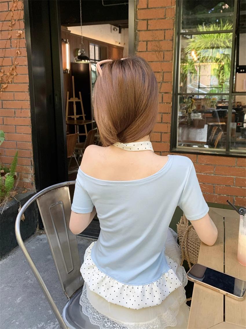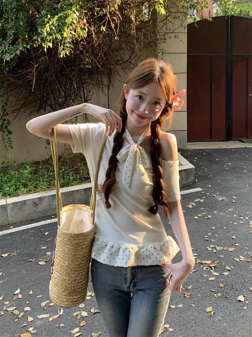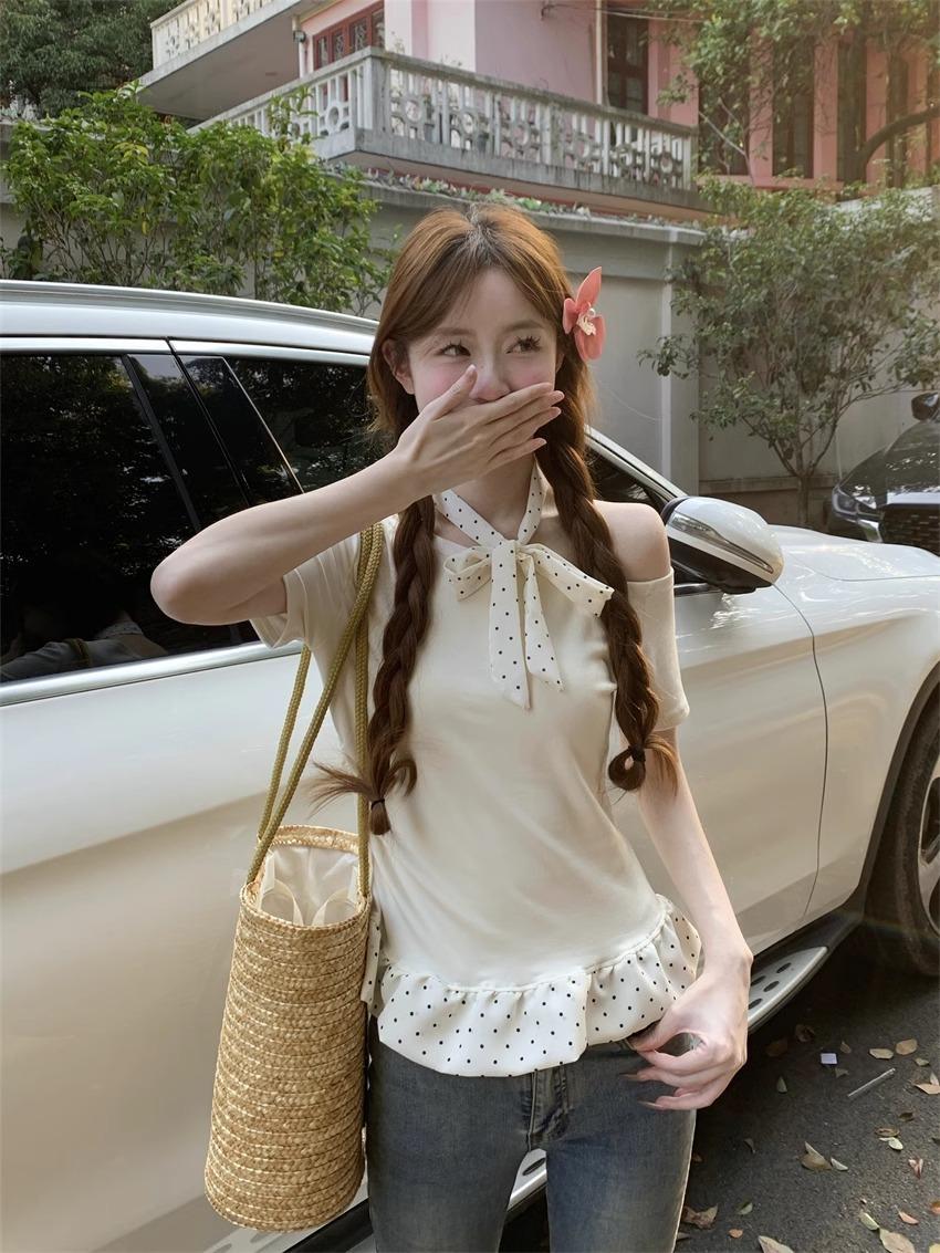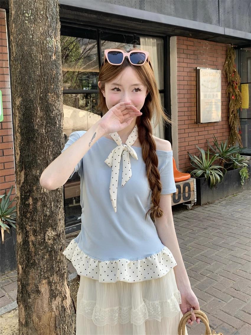 Verano Hombro Inclinado Manga Corta Hombro Derecho Versátil Look Adelgazante Top para Mujer Dulce y Fresco Dobladillo Lunares Diseño de Volantes Camiseta