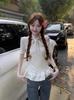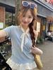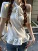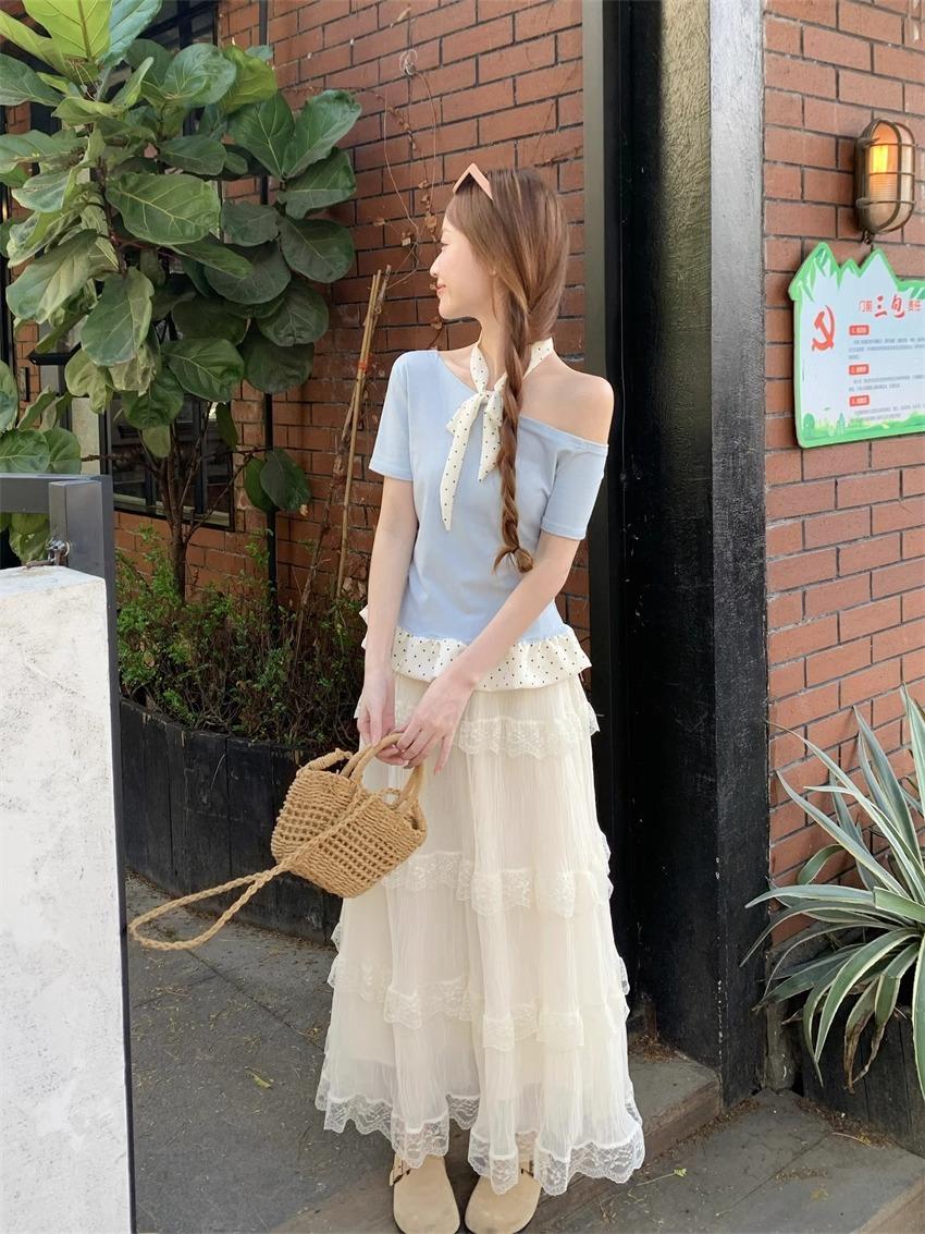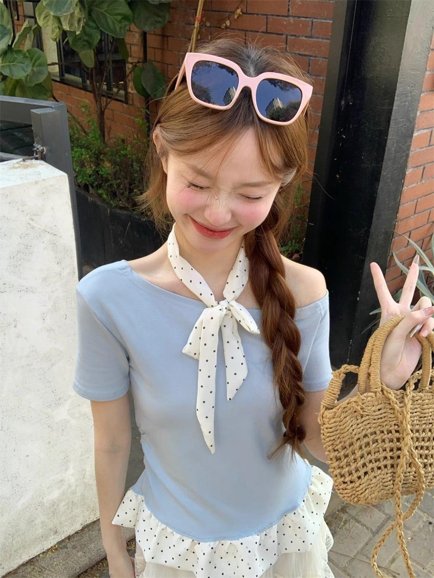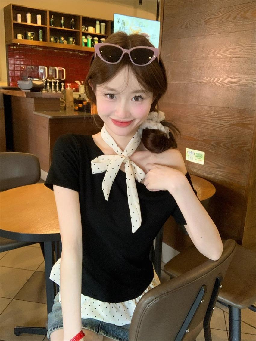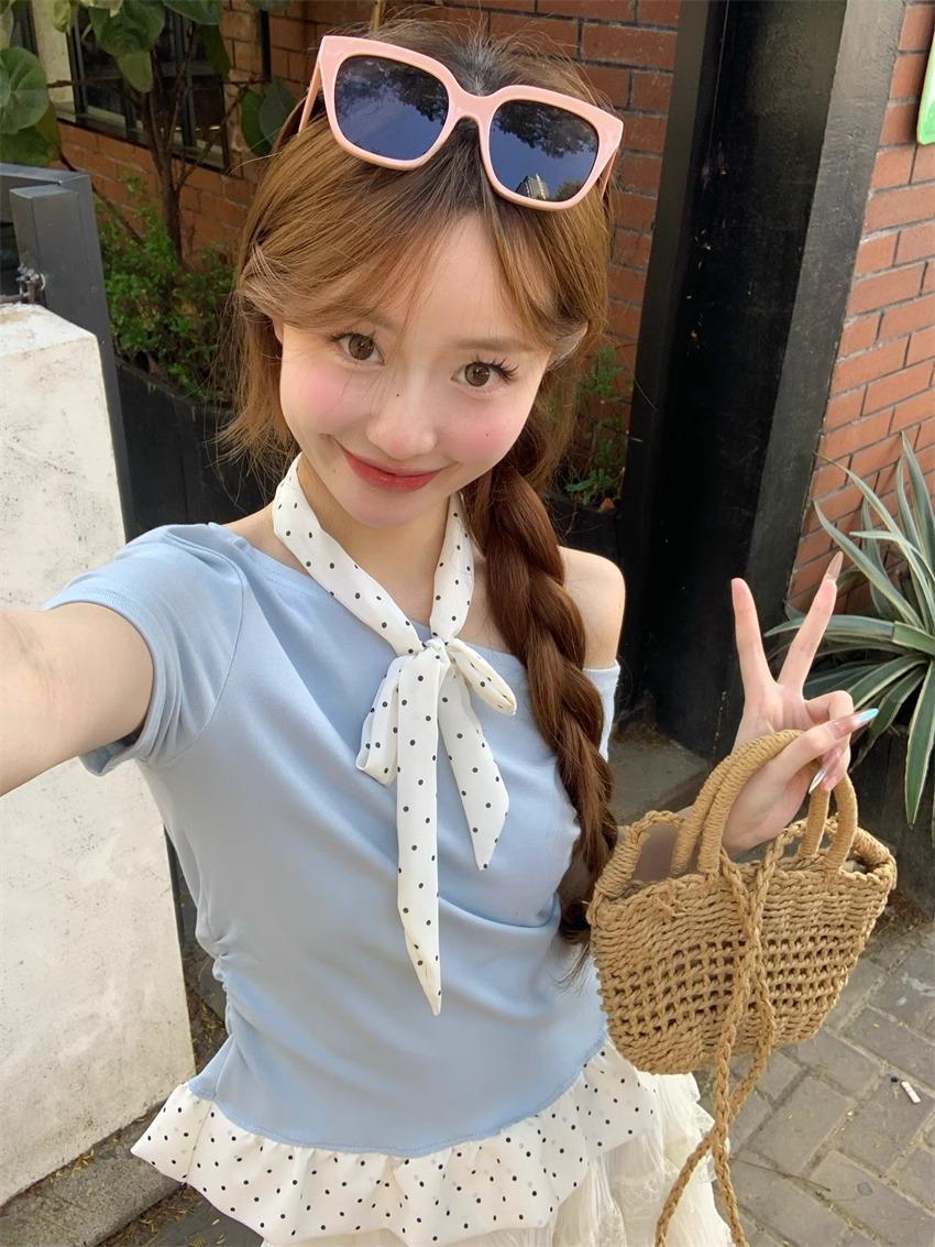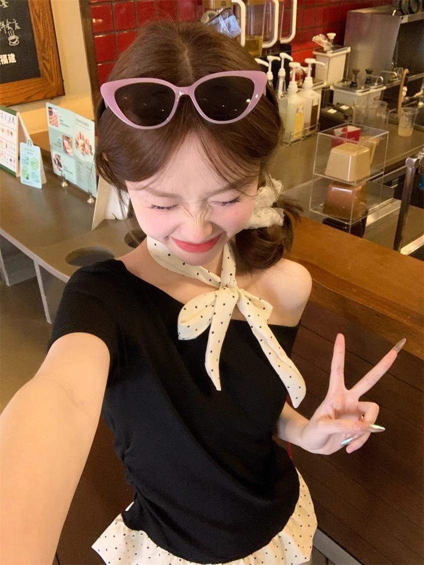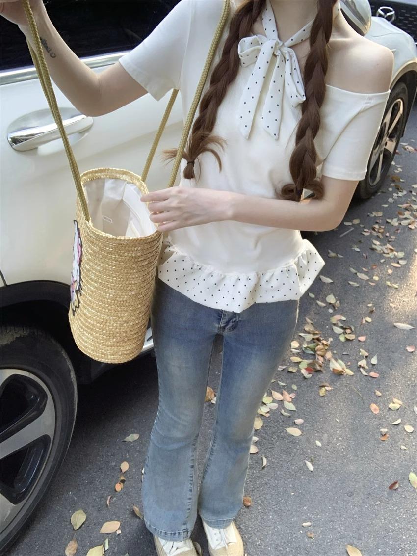 Verano Hombro Inclinado Manga Corta Hombro Derecho Versátil Look Adelgazante Top para Mujer Dulce y Fresco Dobladillo Lunares Diseño de Volantes Camiseta