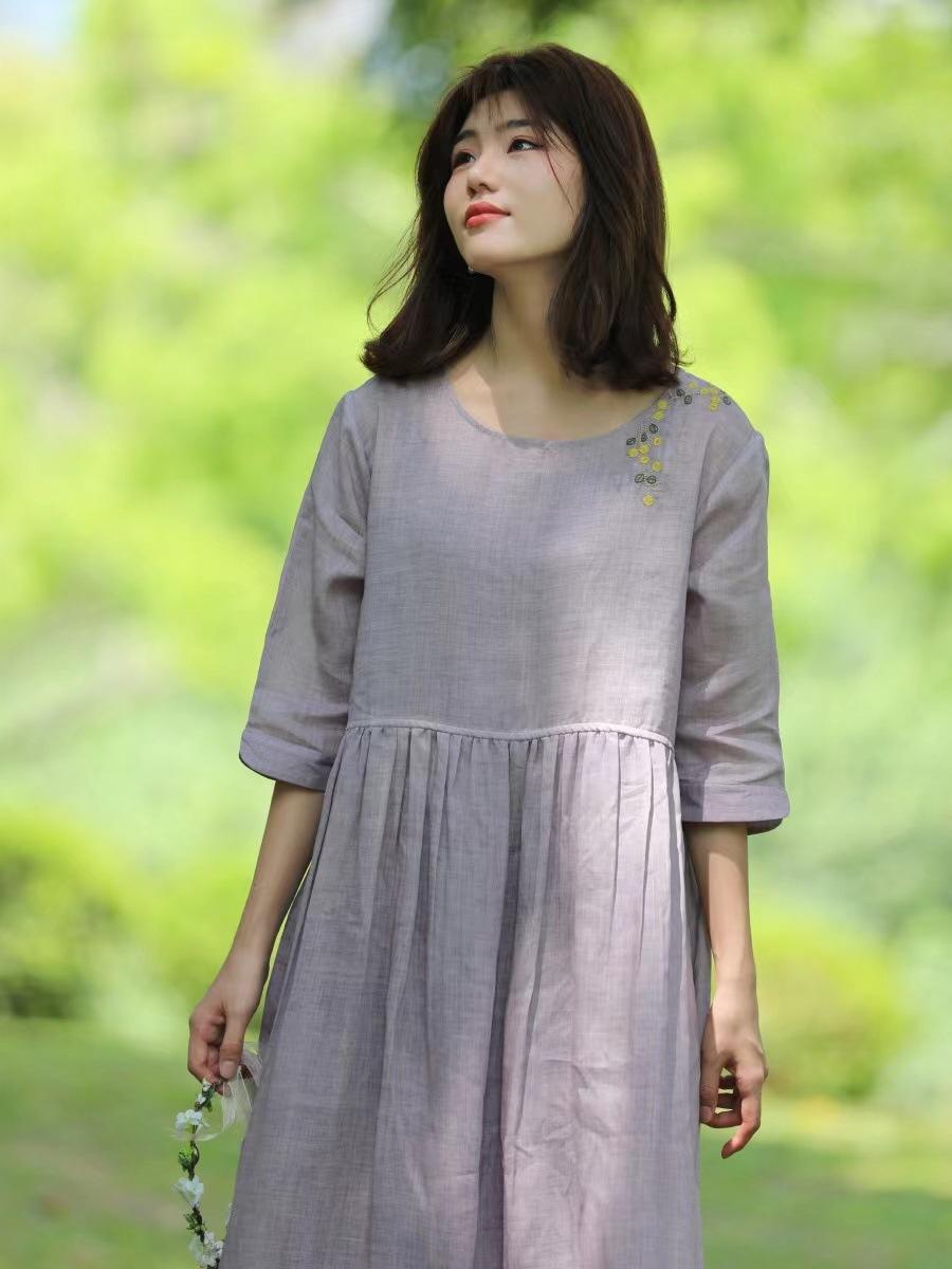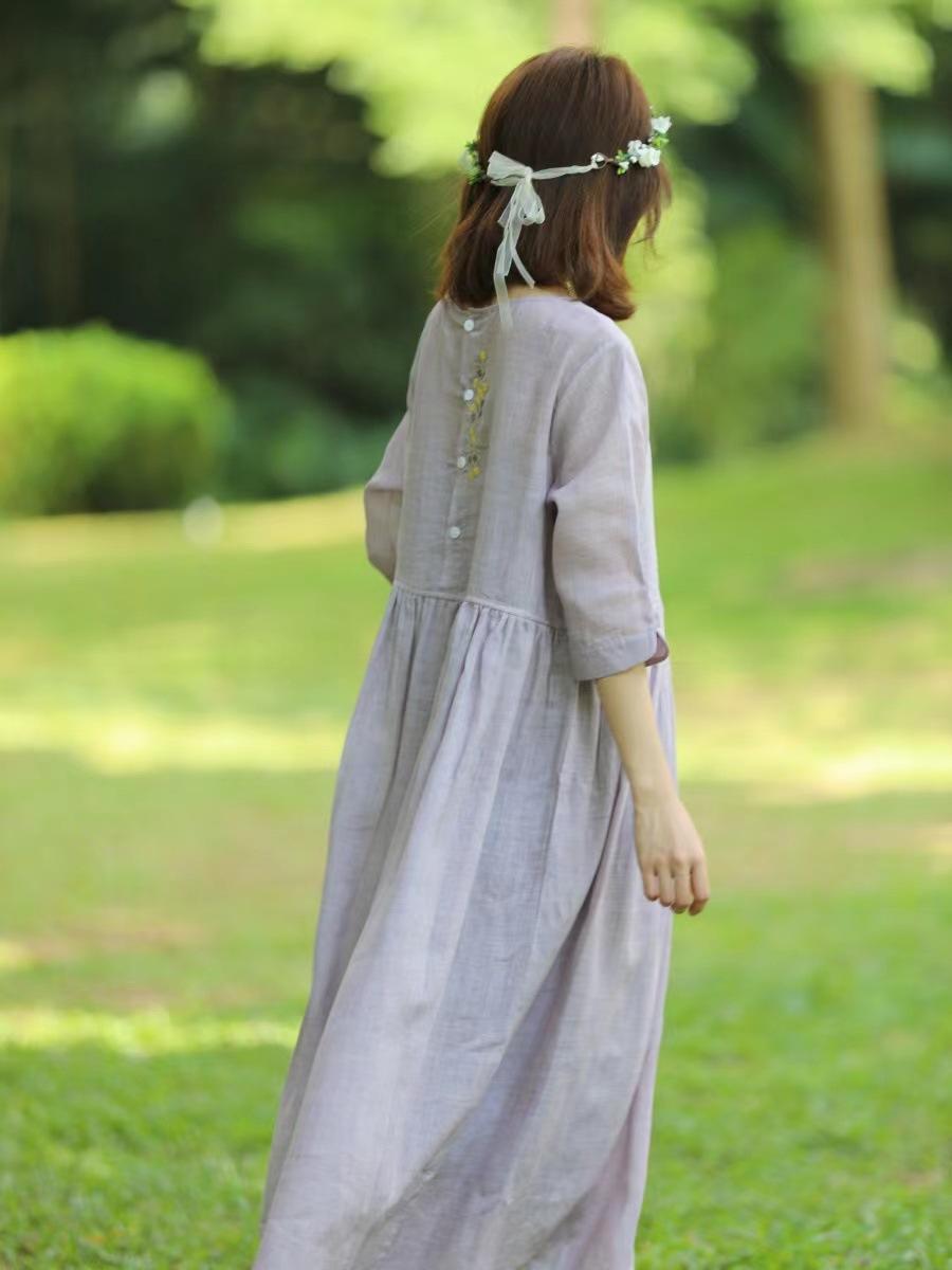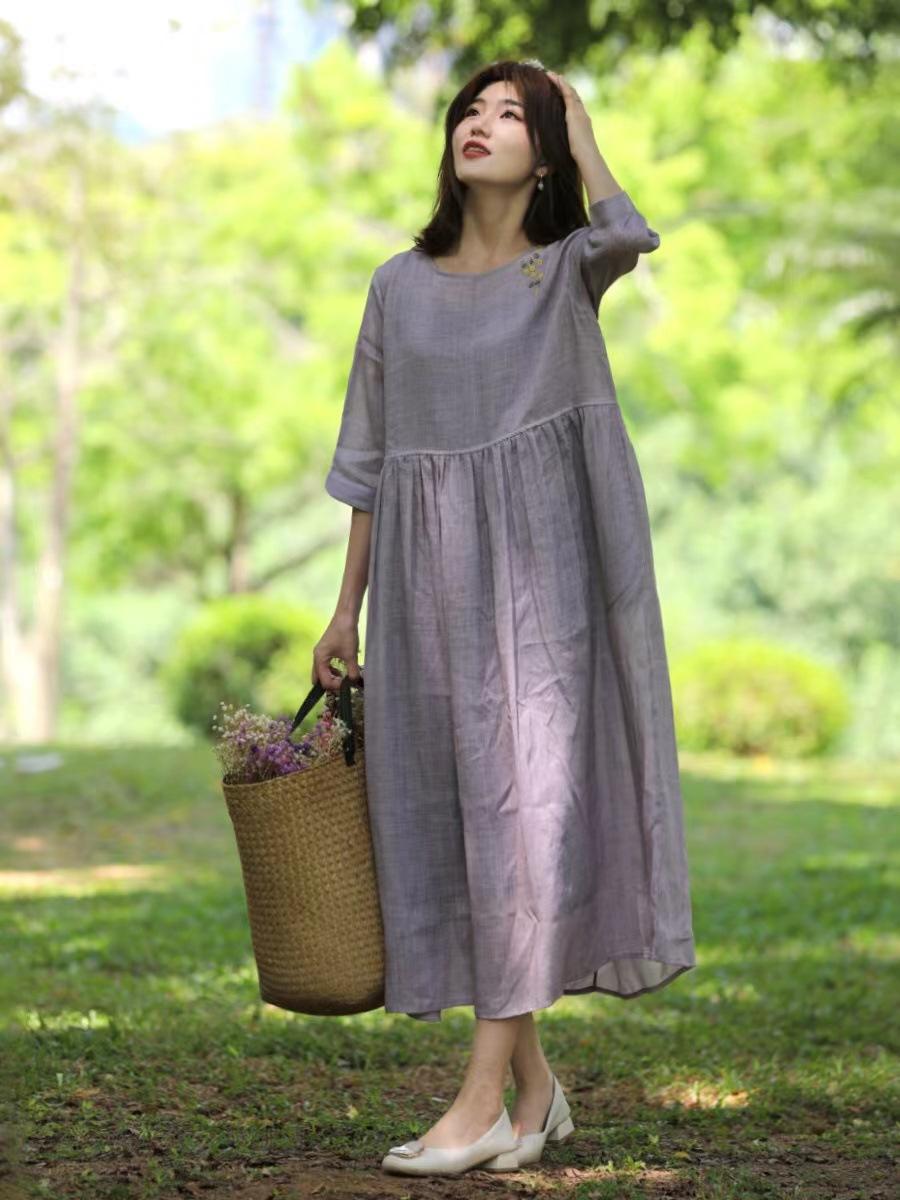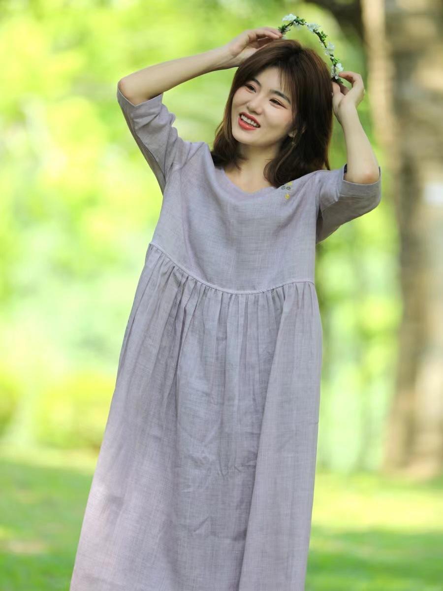 Primavera y verano 2025 Nuevo vestido holgado de longitud media con bordado y vuelo grande Vestido largo informal sencillo