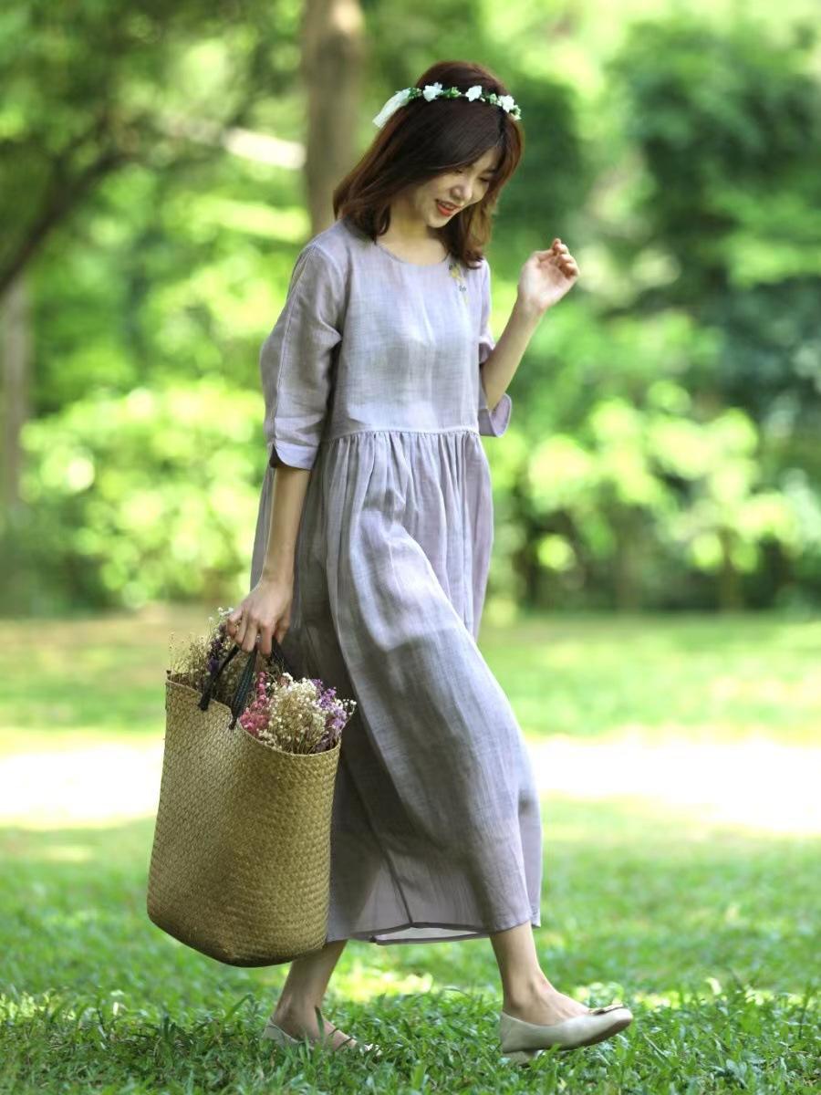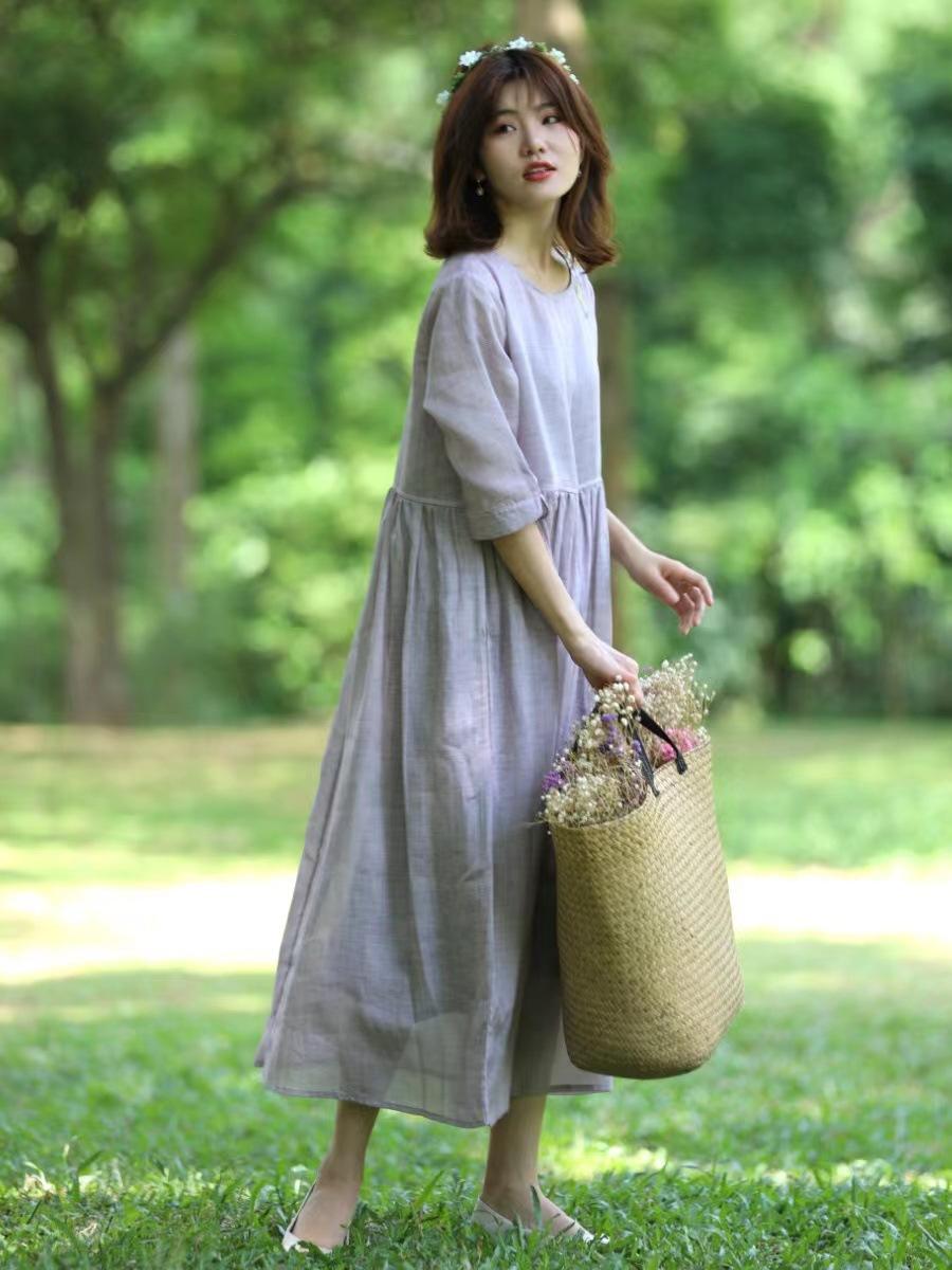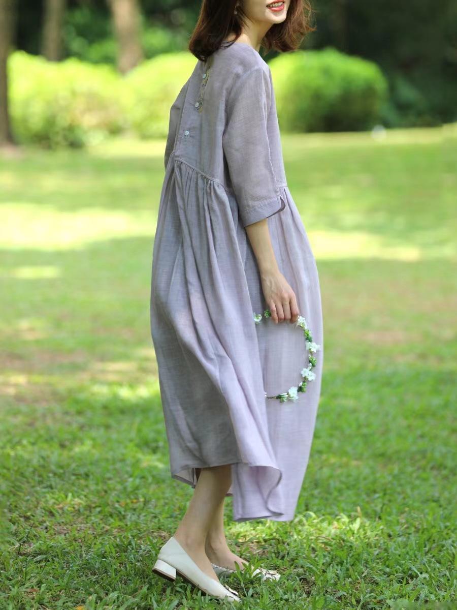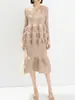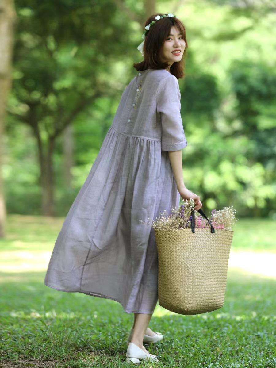 Primavera y verano 2025 Nuevo vestido holgado de longitud media con bordado y vuelo grande Vestido largo informal sencillo