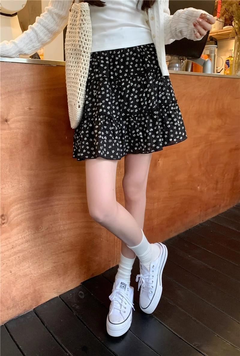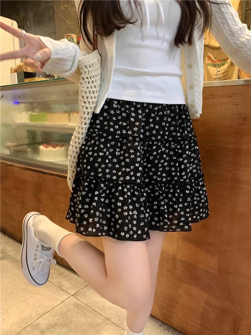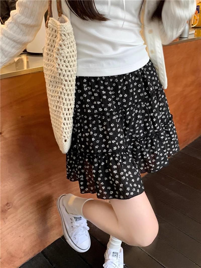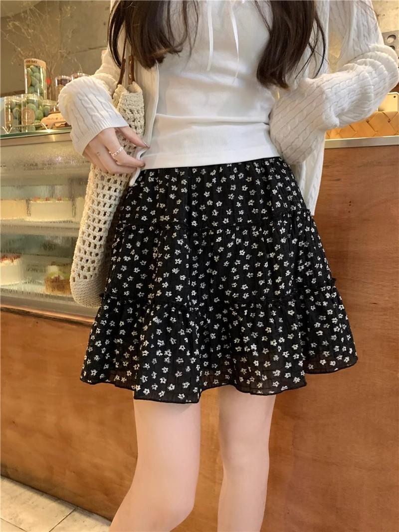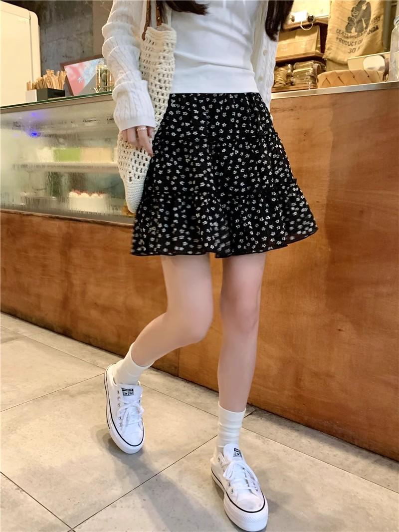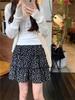 Falda Corta Floral Negra Coreana para Mujer Verano 2025 Nueva Falda Pastel Media Falda Falda A-Line Petite Media Falda