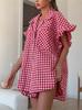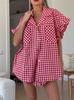 Sentido del Diseño Volantes Moda Casual Camisa a Cuadros Traje de Shorts de Cintura Alta para Mujer 2025 Verano Nuevo Estilo Europeo y Americano