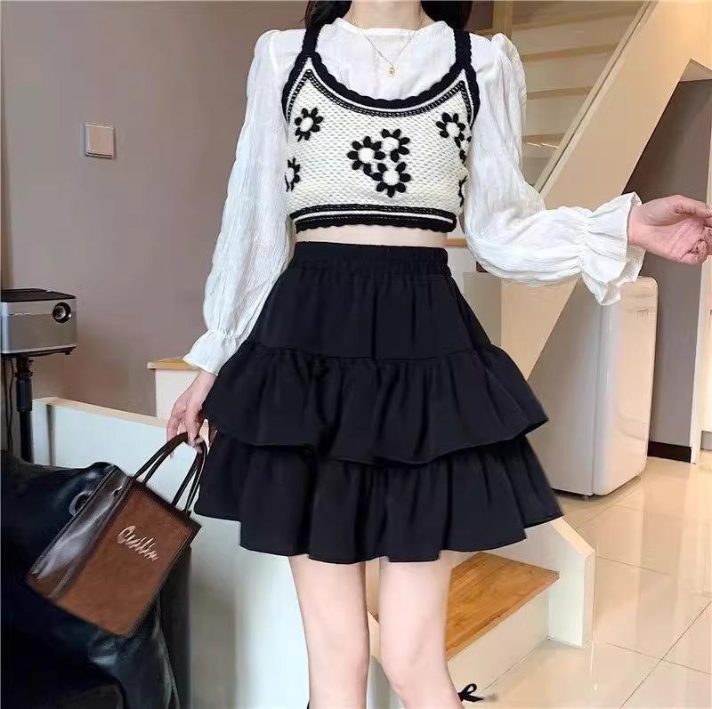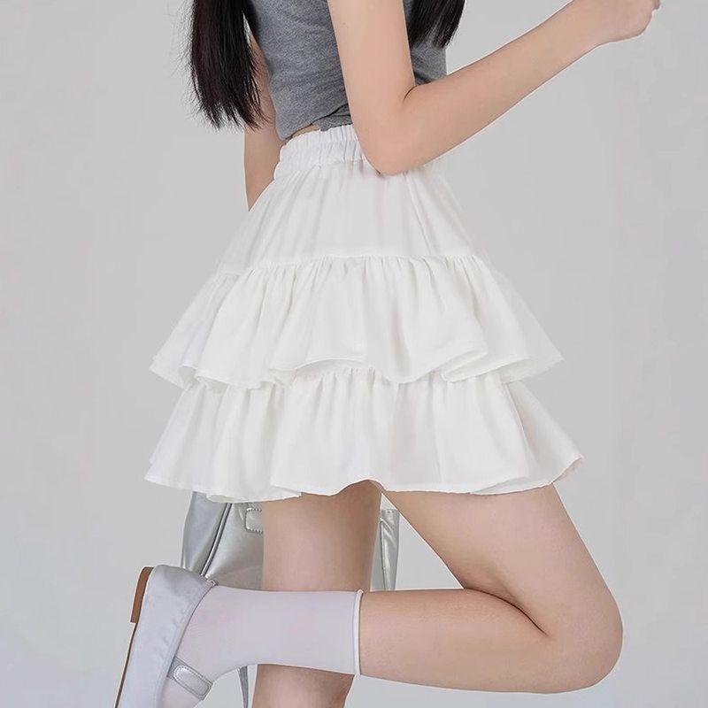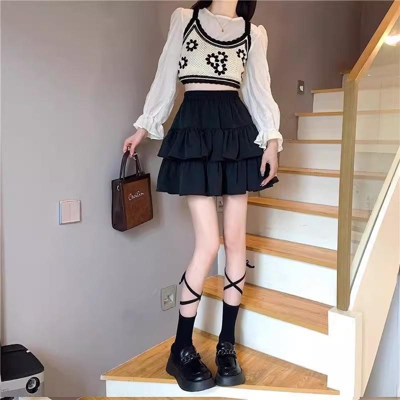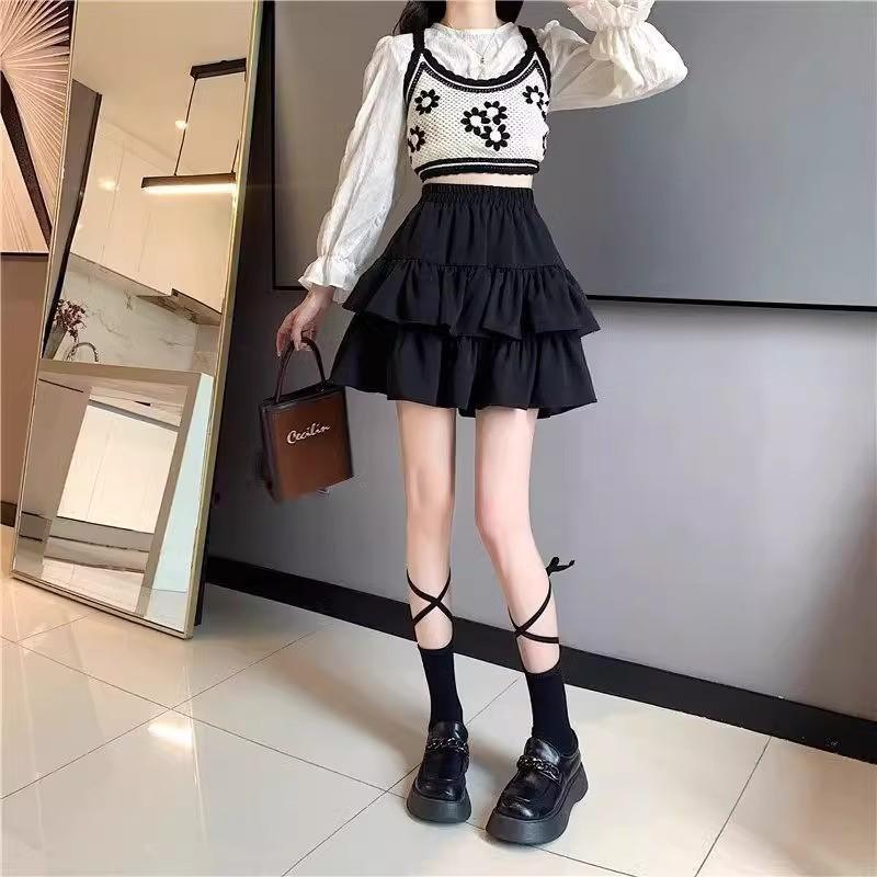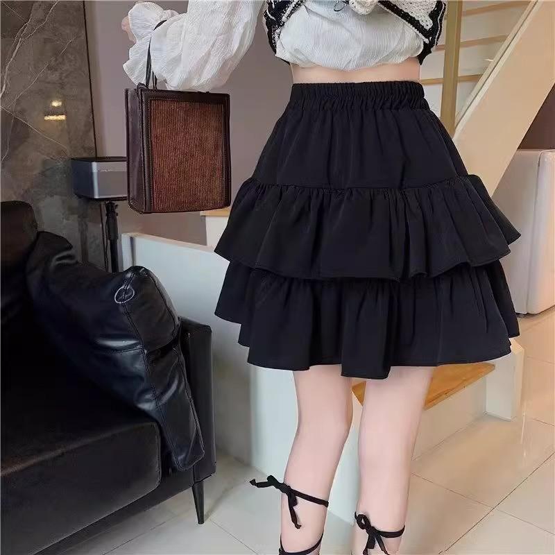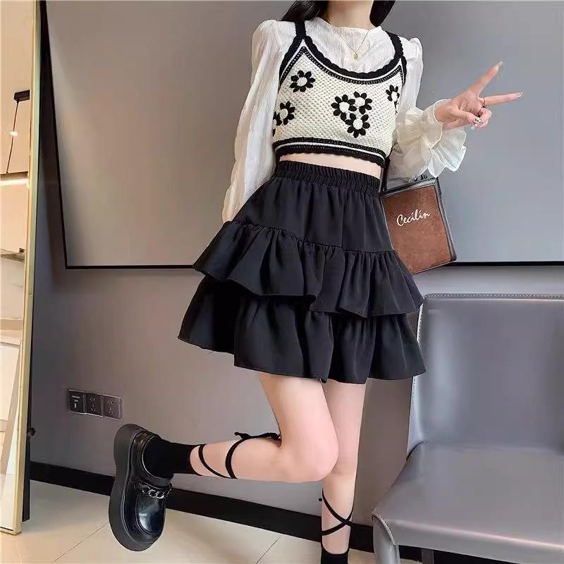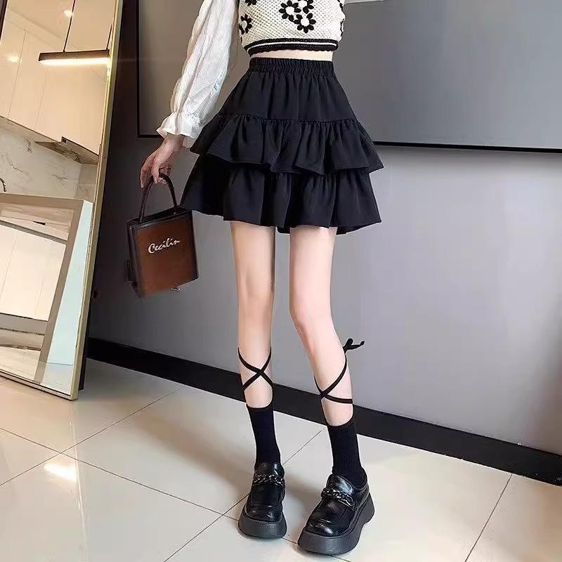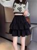 Falda Negra Abullonada para Mujer Verano Nuevo Estilo Cintura Alta Adelgazante Antitransparente Línea A Falda Corta