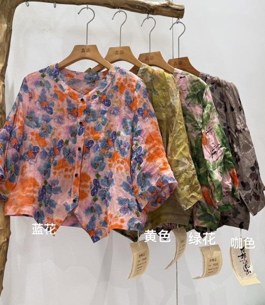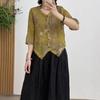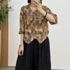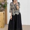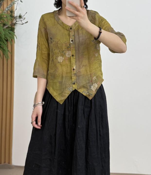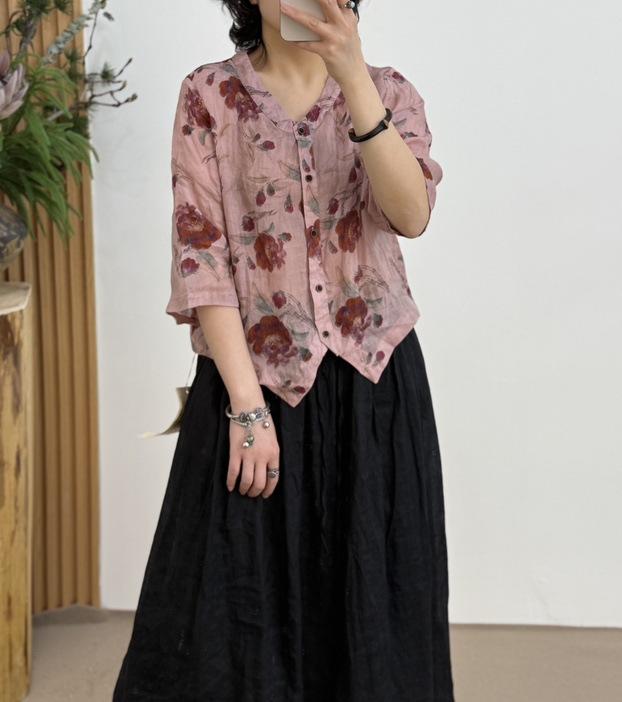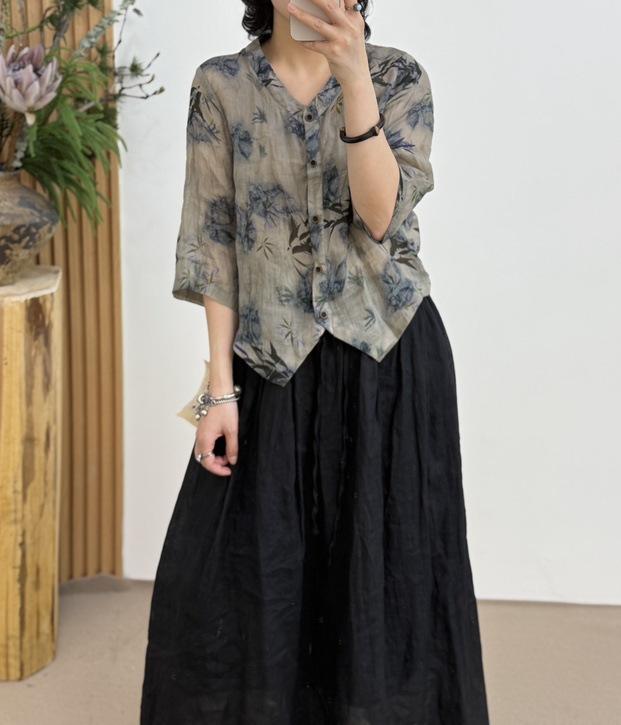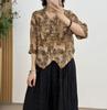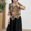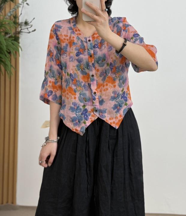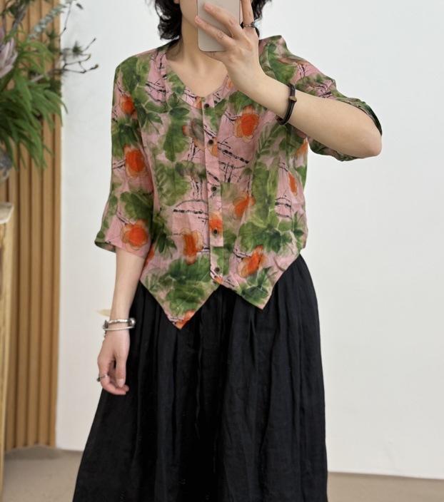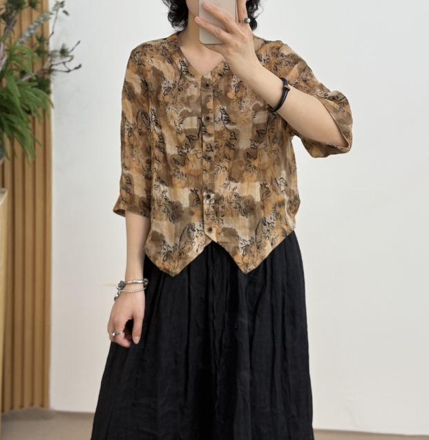 Verano 2025 Nueva Camisa Artística de Ramio Estampada con Cuello en V Cárdigan Camisero de Moda Irregular
