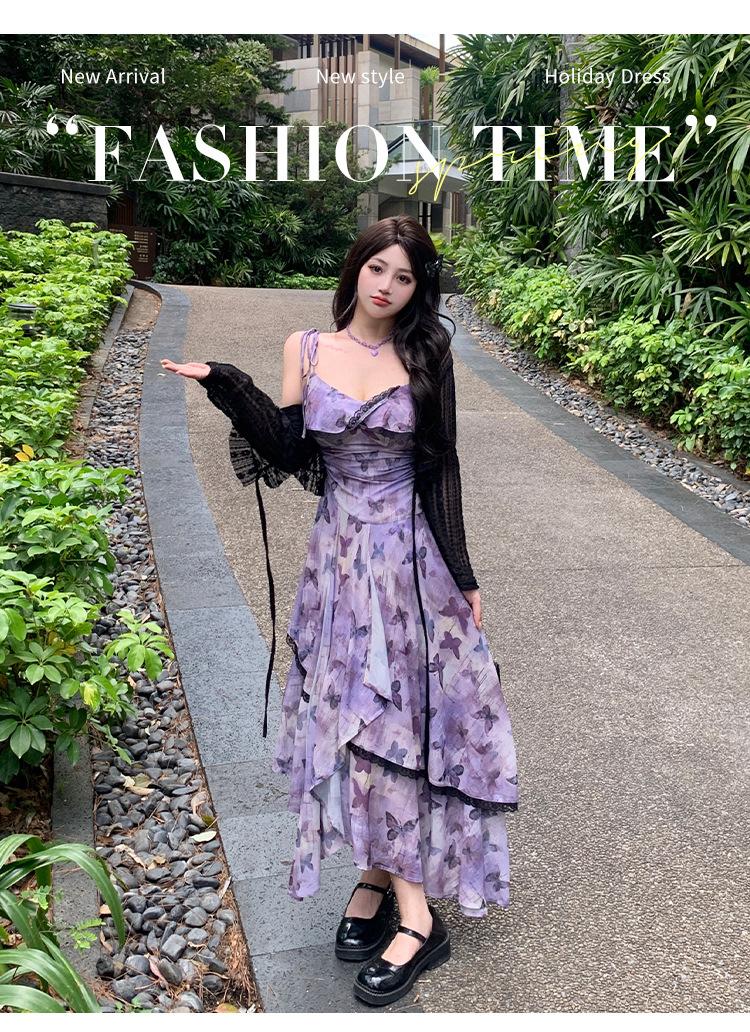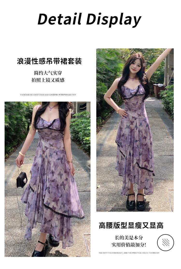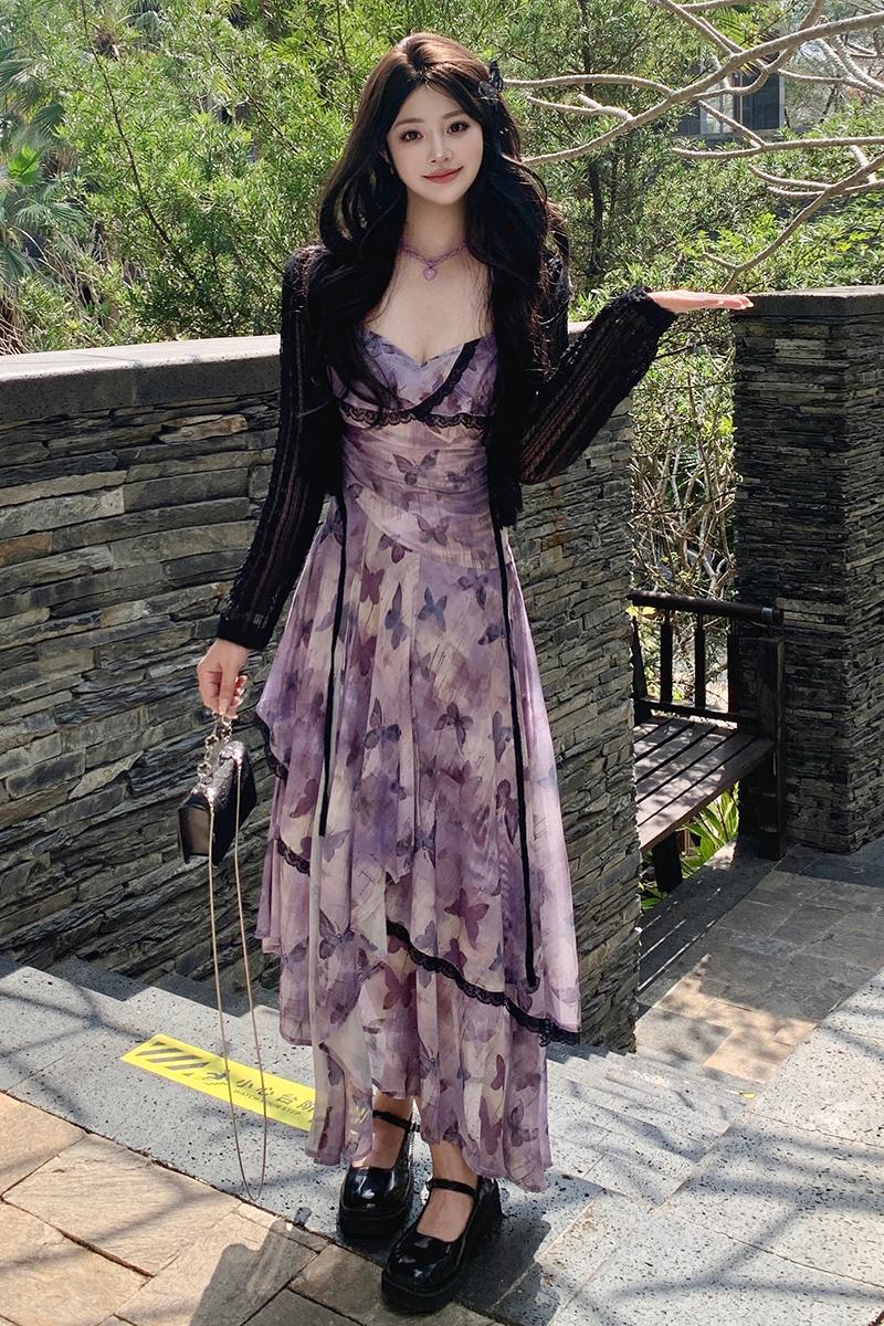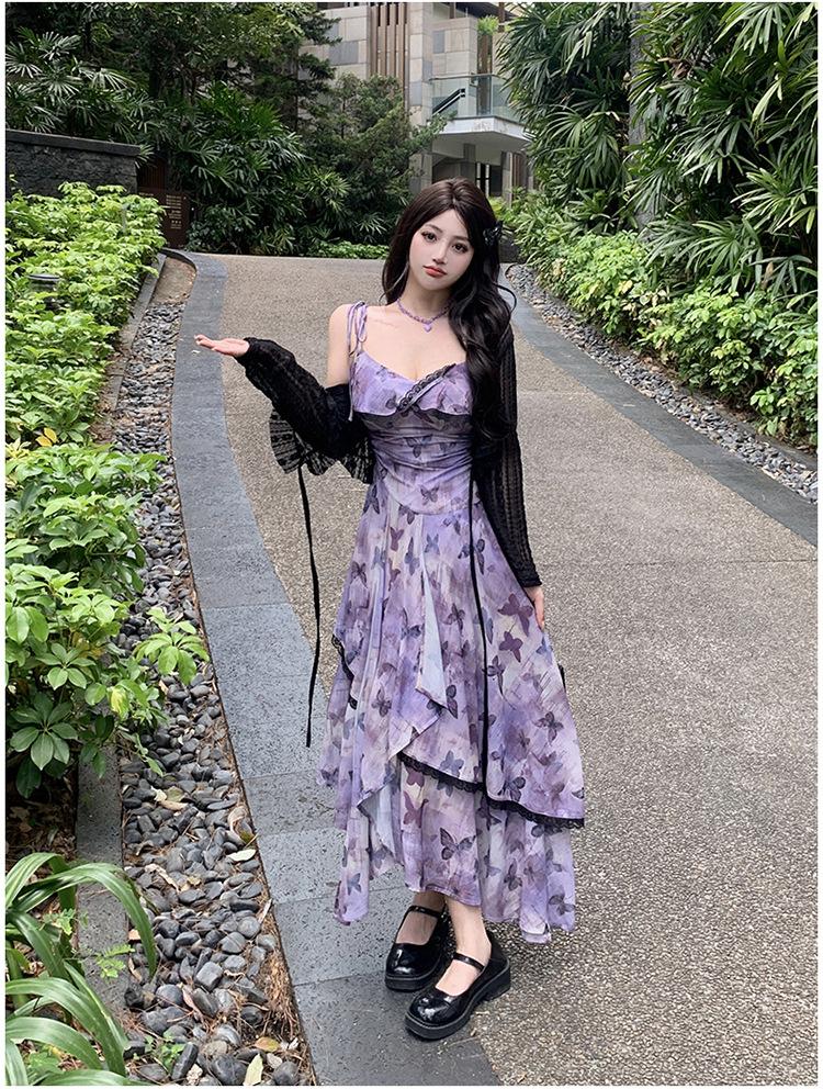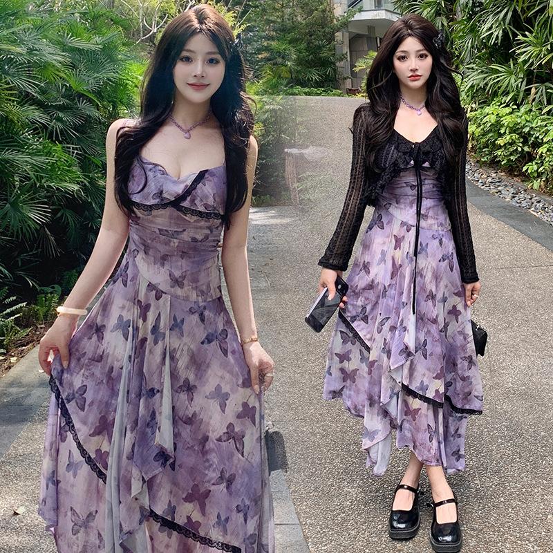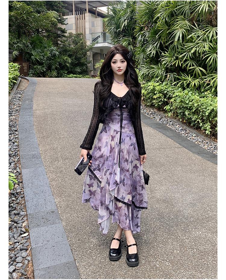 Talla grande chica gordita Estilo francés Mariposa Sling Encaje irregular Vestido de hada Cárdigan fino de verano para mujer Conjunto de dos piezas