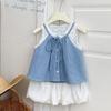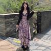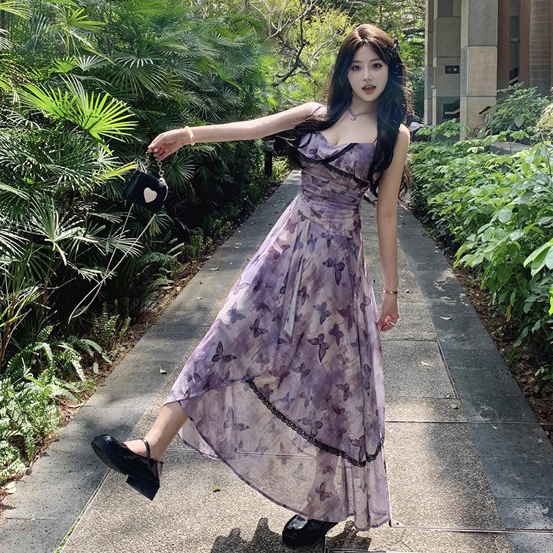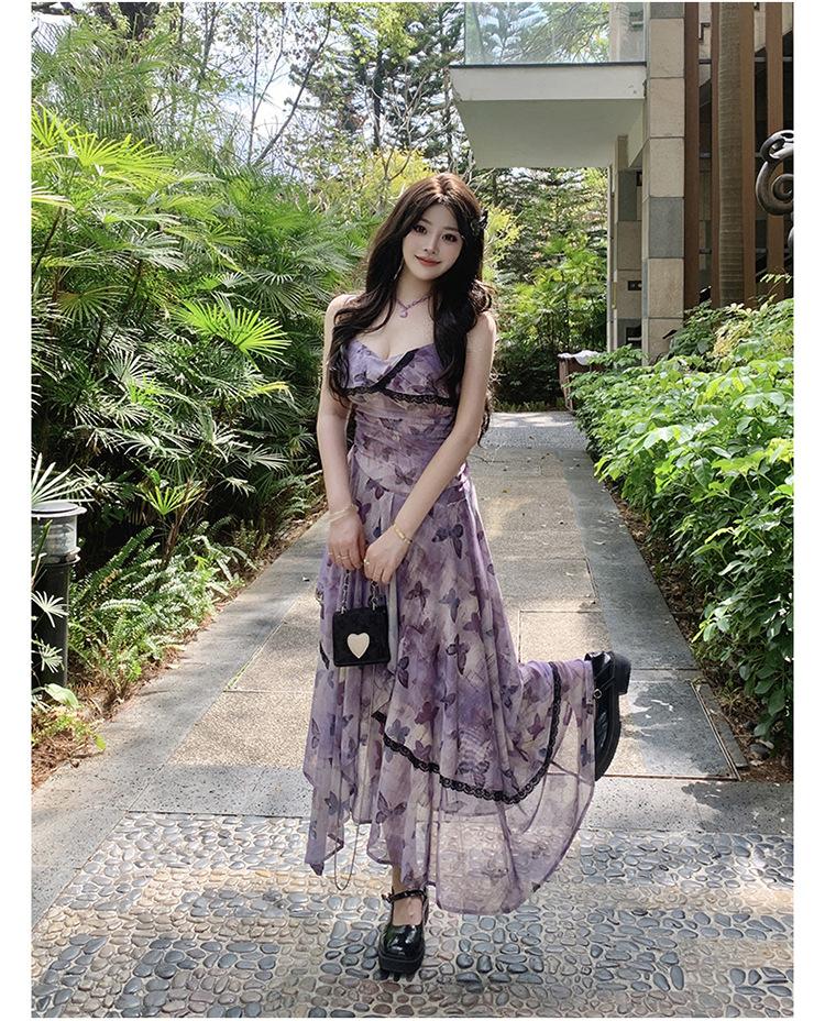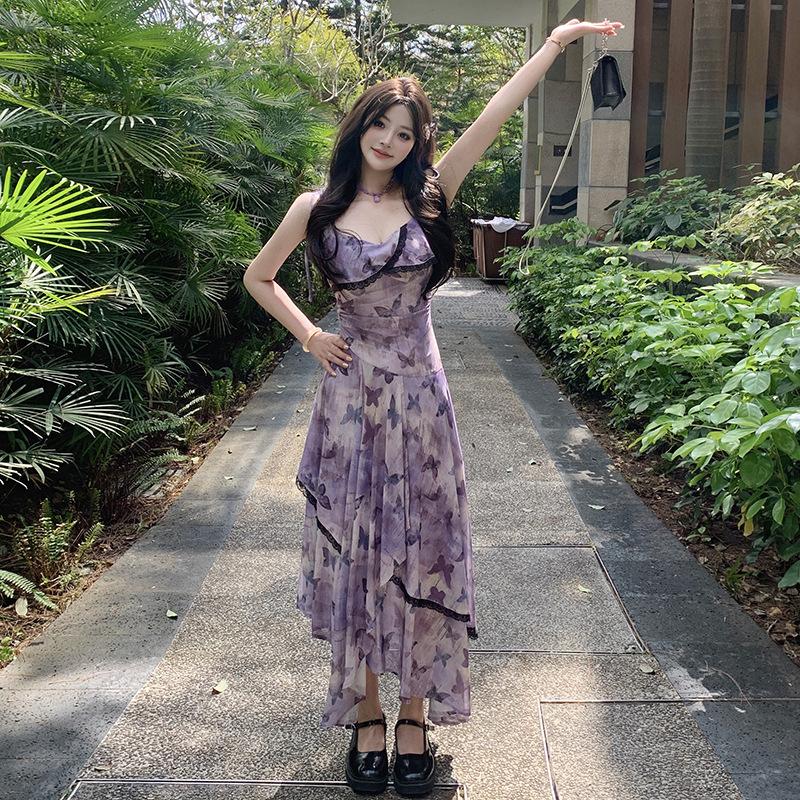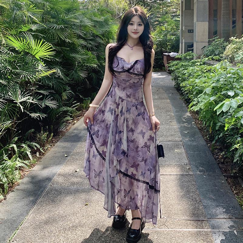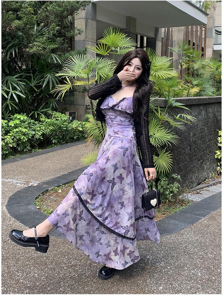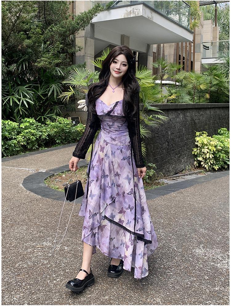 Talla grande chica gordita Estilo francés Mariposa Sling Encaje irregular Vestido de hada Cárdigan fino de verano para mujer Conjunto de dos piezas