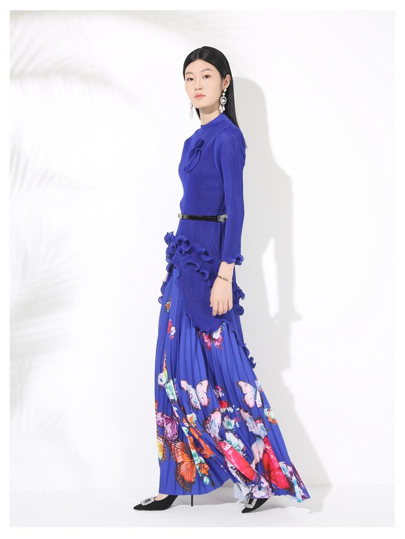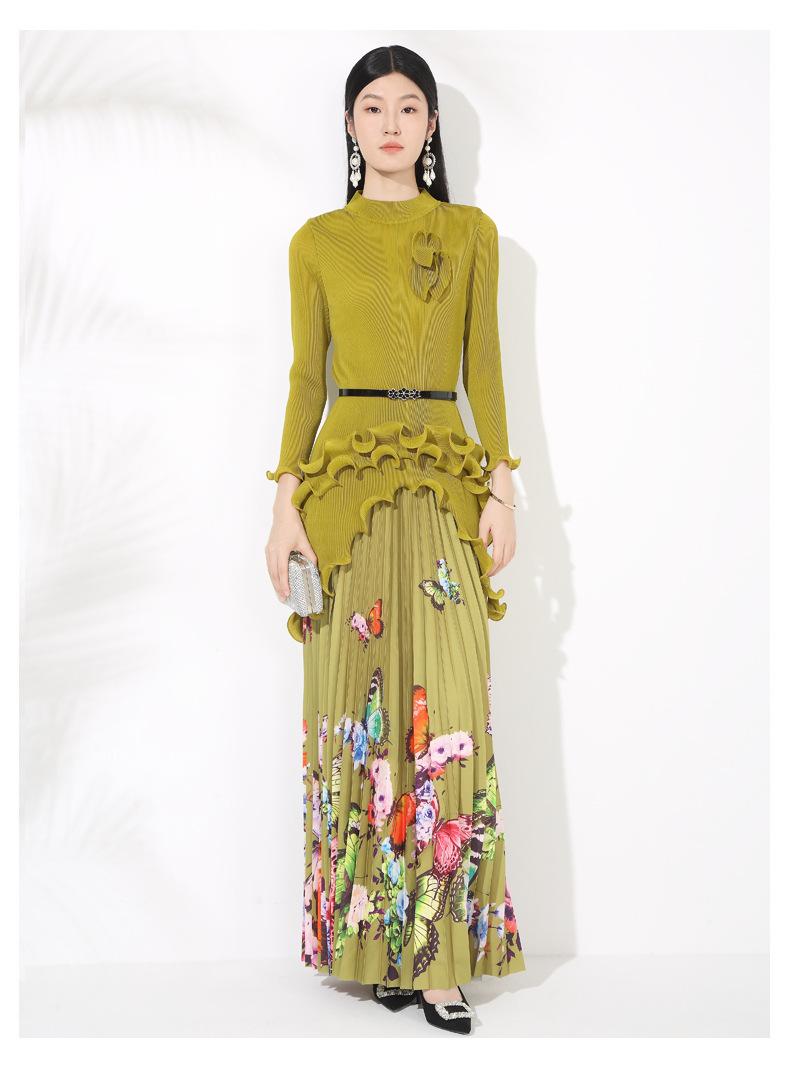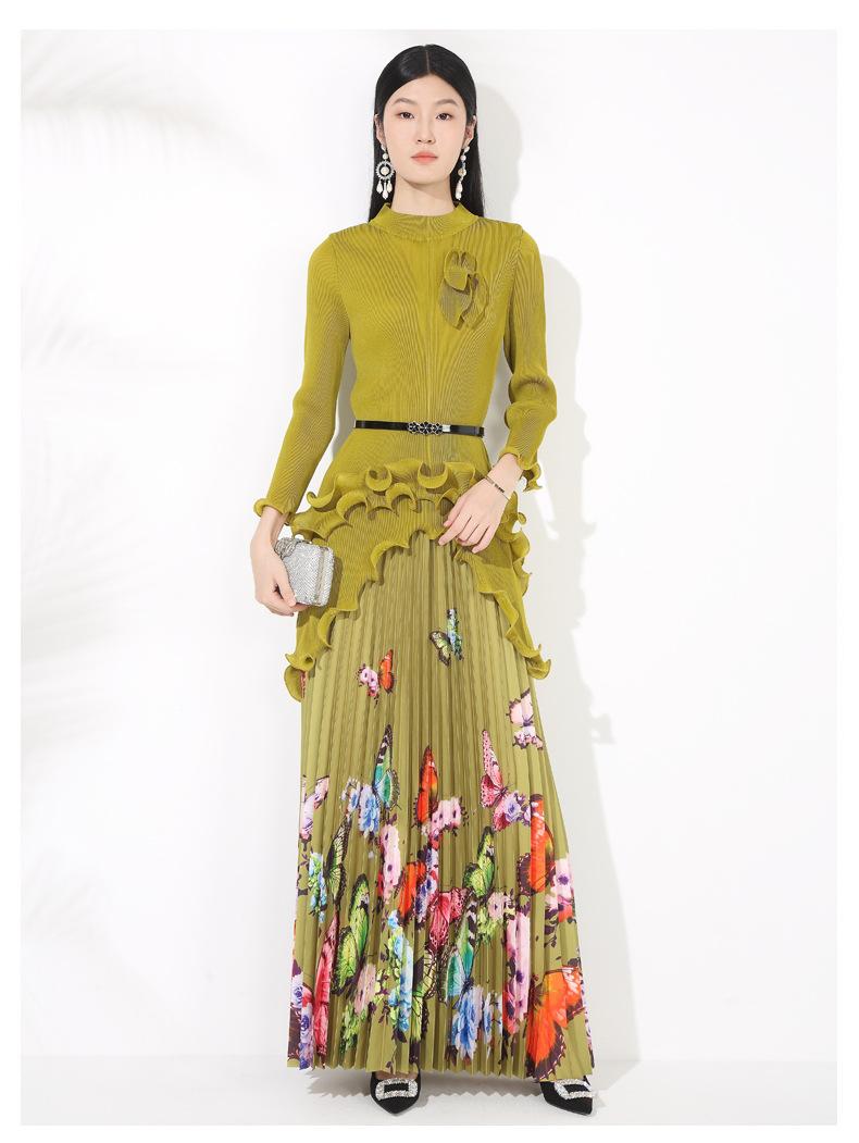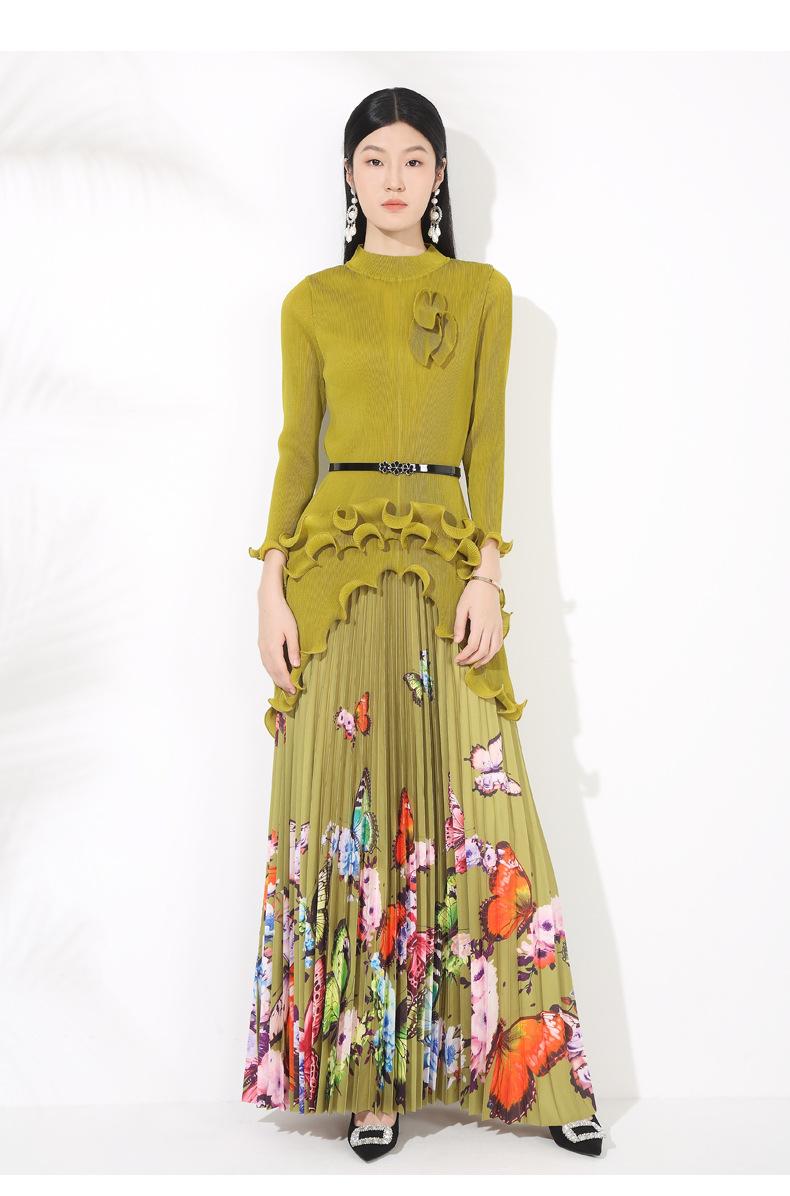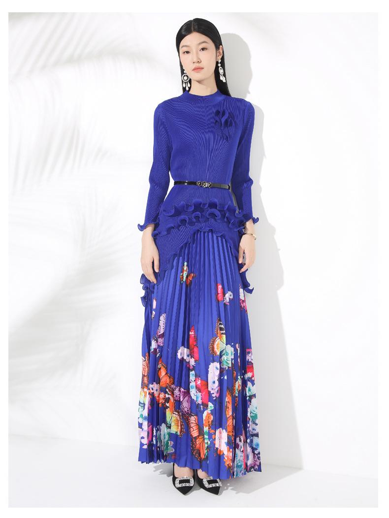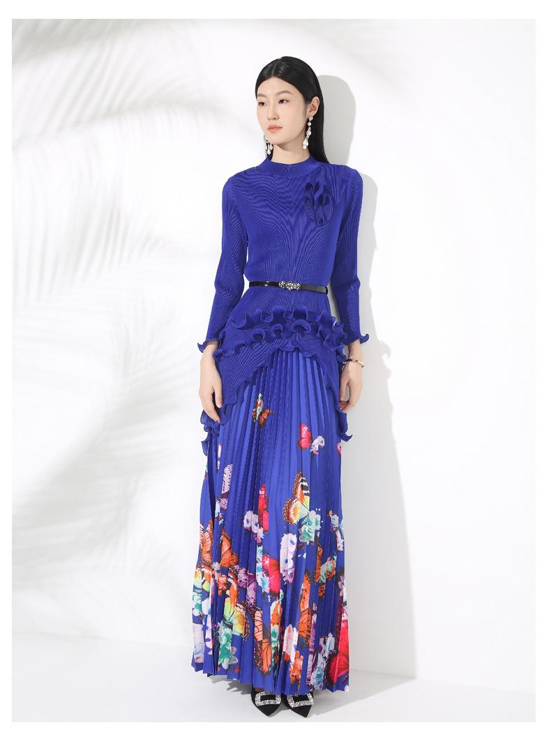 Top Irregular de Punto Plisado de Alta Calidad con Cuello Redondo Traje para Mujer Estampado de Mariposas Falda Larga Conjunto de Dos Piezas