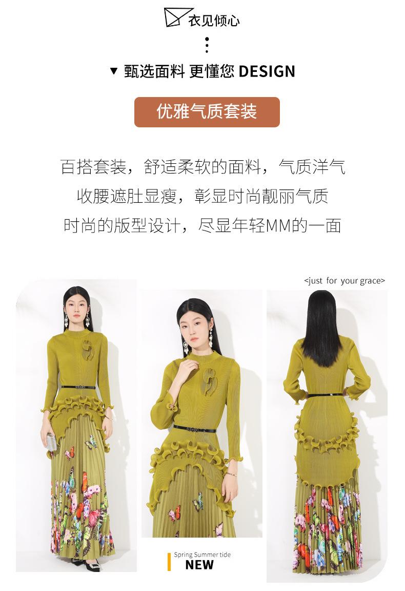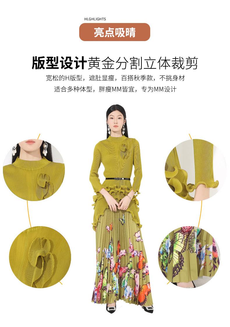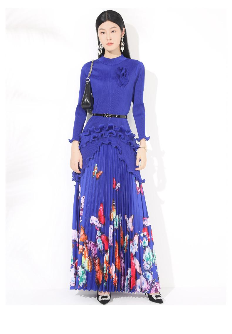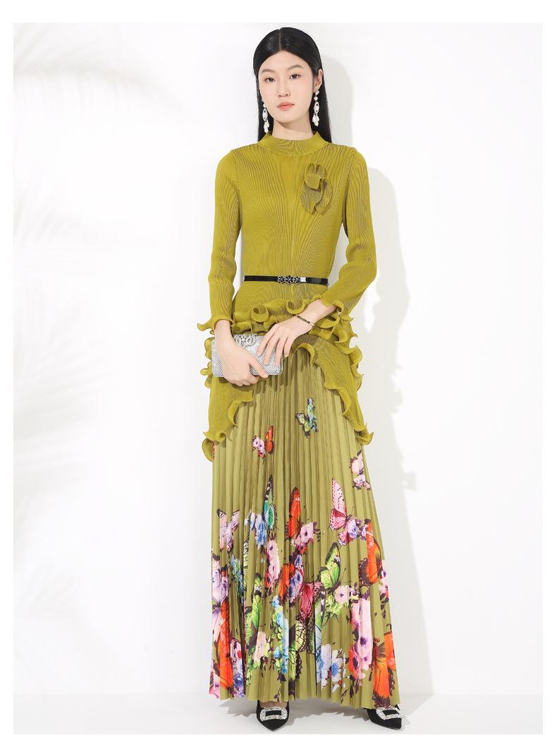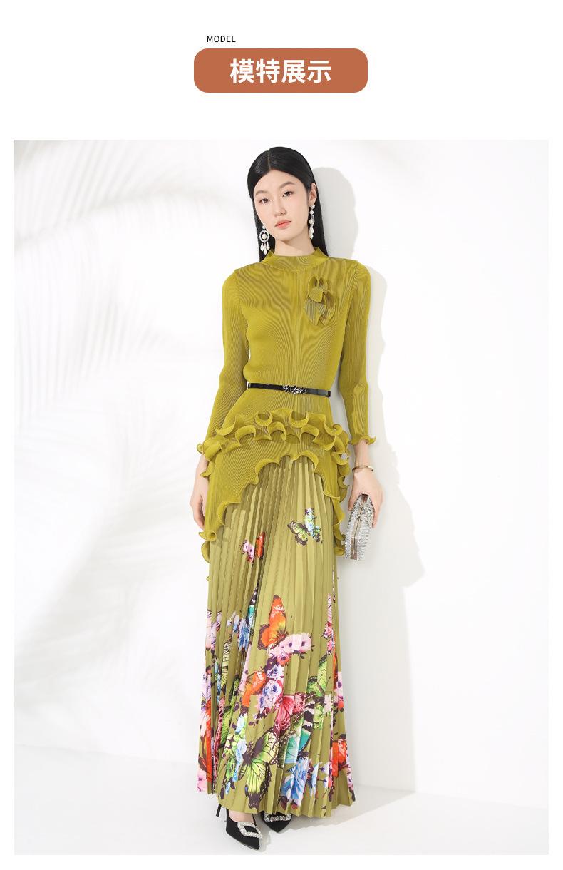 Top Irregular de Punto Plisado de Alta Calidad con Cuello Redondo Traje para Mujer Estampado de Mariposas Falda Larga Conjunto de Dos Piezas