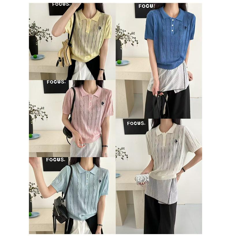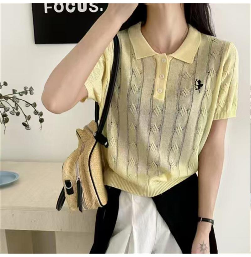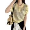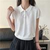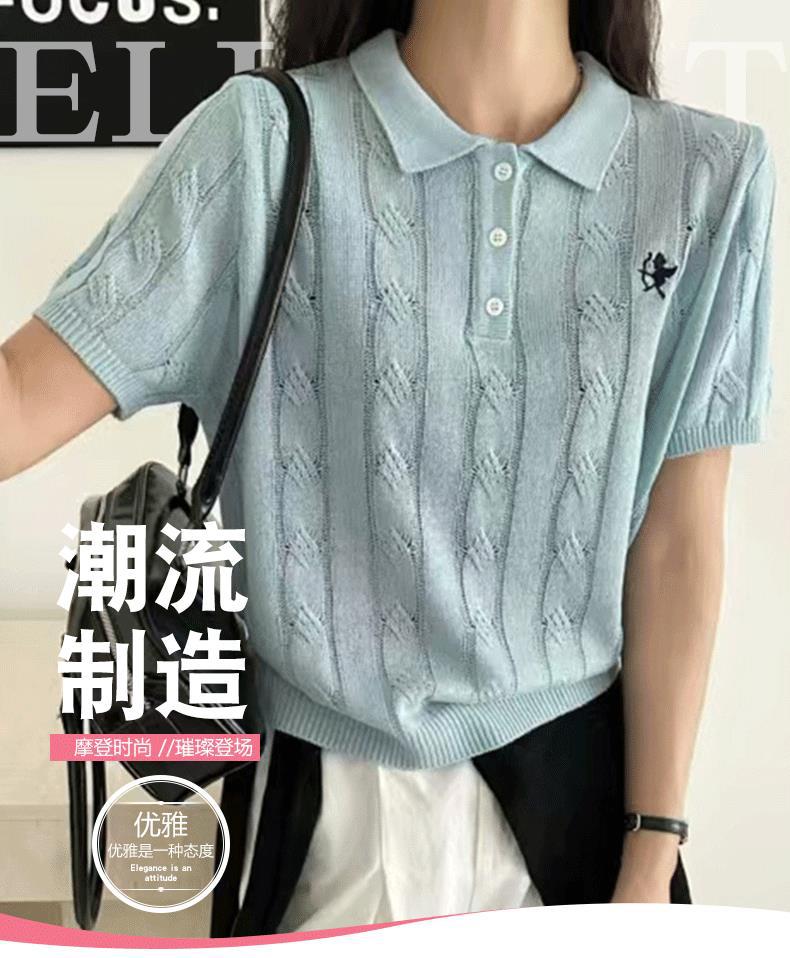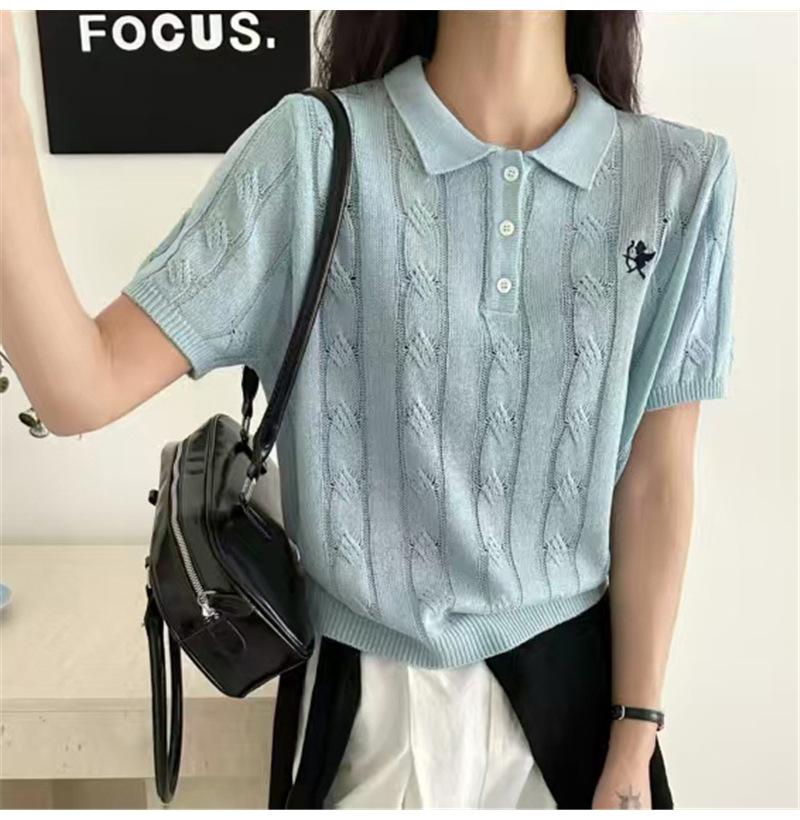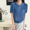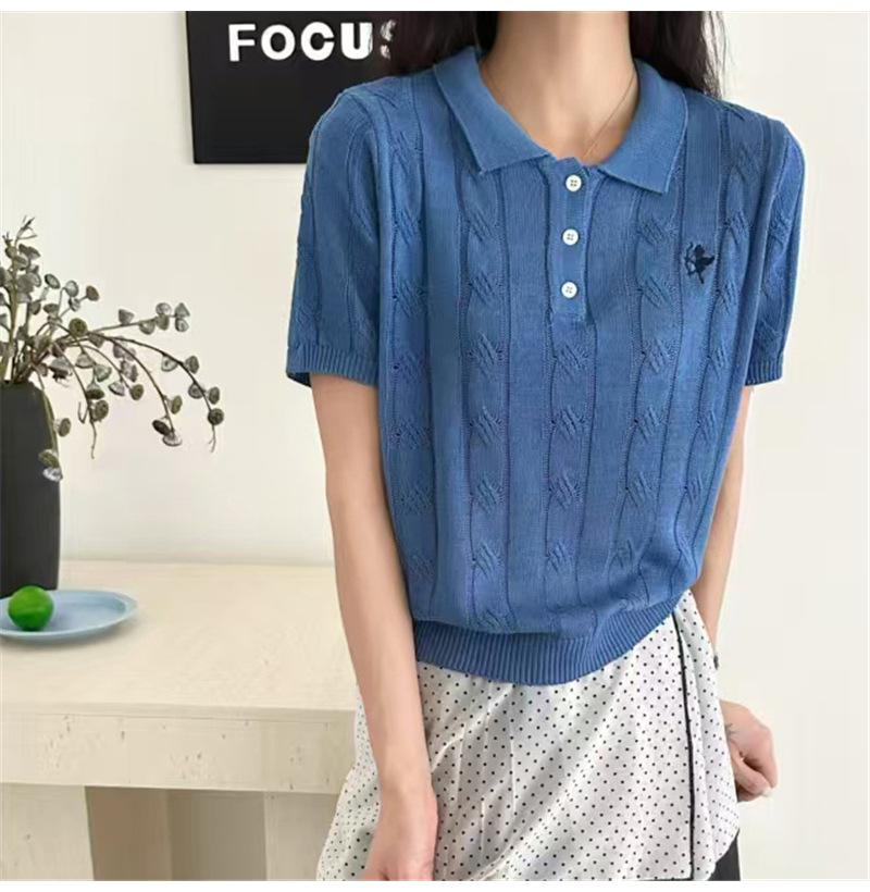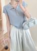 Camiseta de Manga Corta de Punto Fino de Verano para Mujer con Cuello Polo Azul de Seda Helada para Mujer 2025 Nuevo Estilo Caliente Top Corto