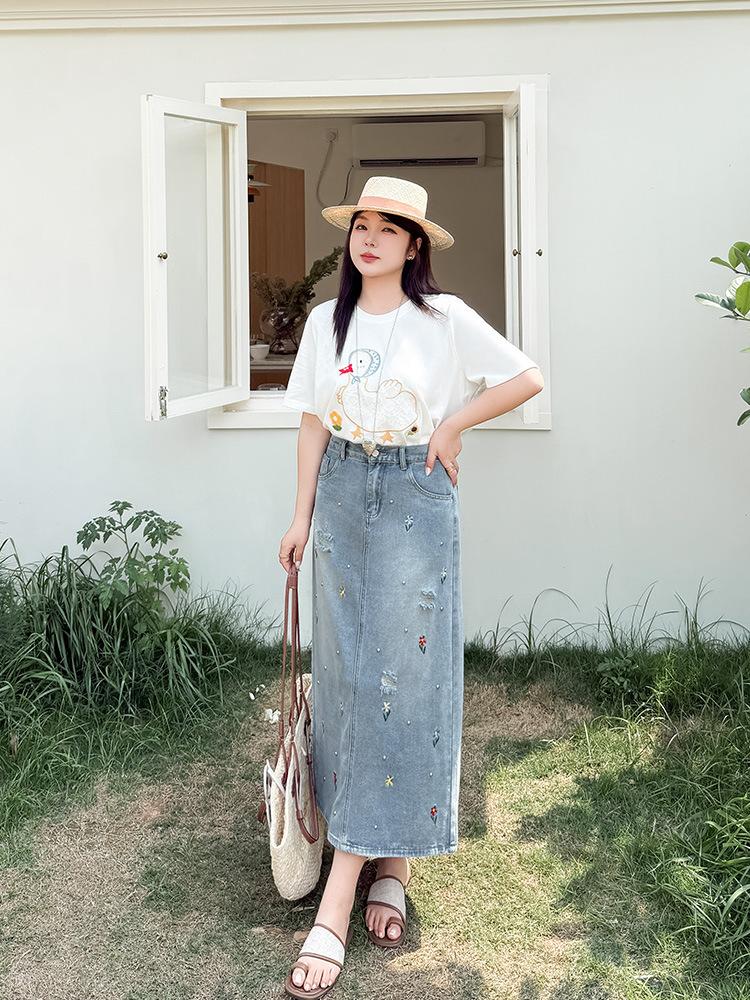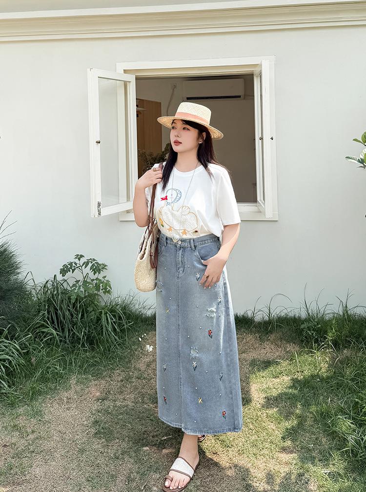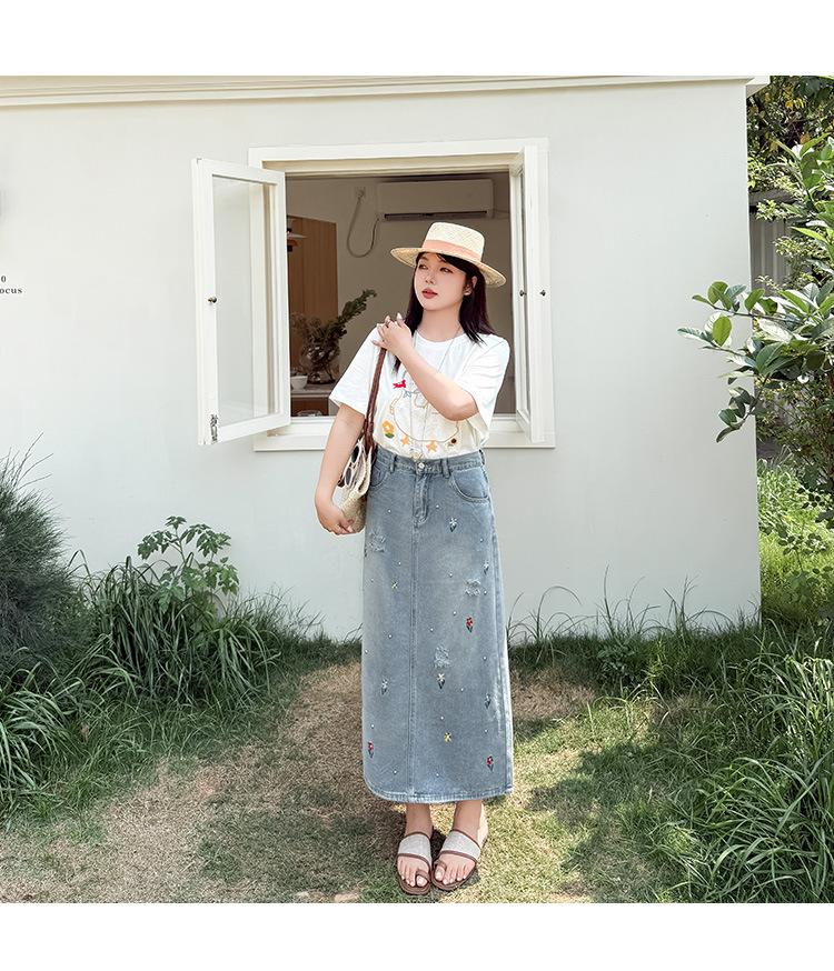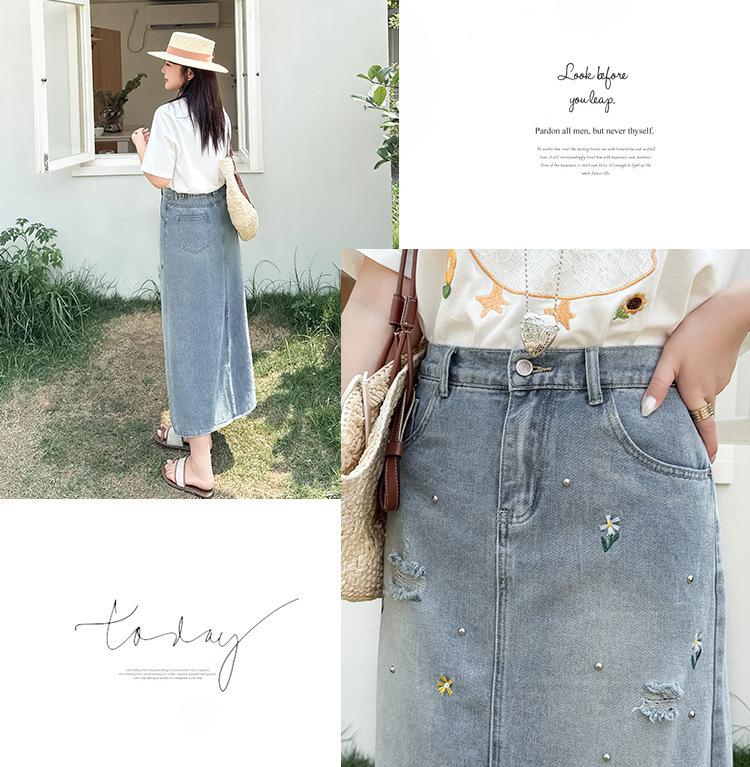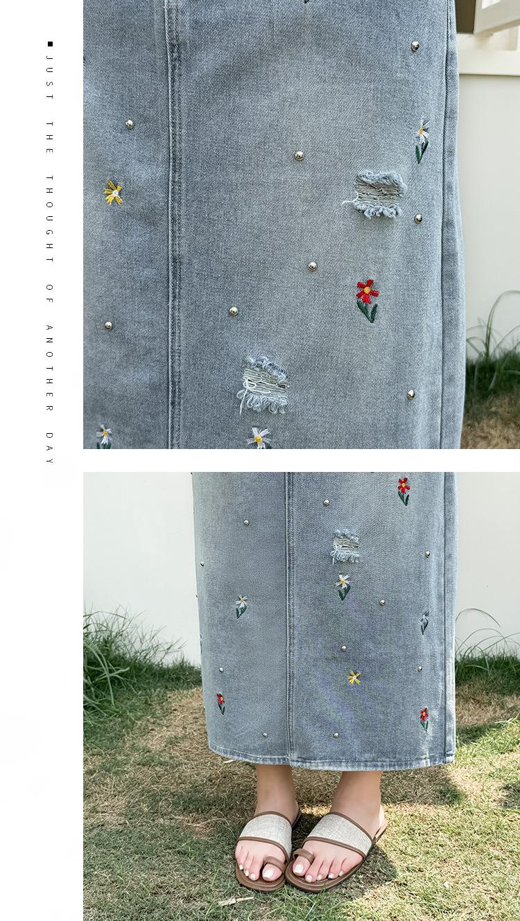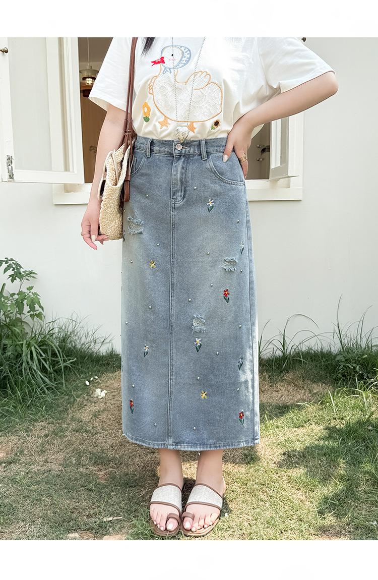 Exquisita y favorecedora falda midi de mezclilla rota con bordados florales y cuentas