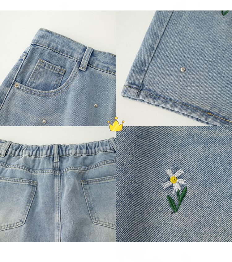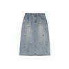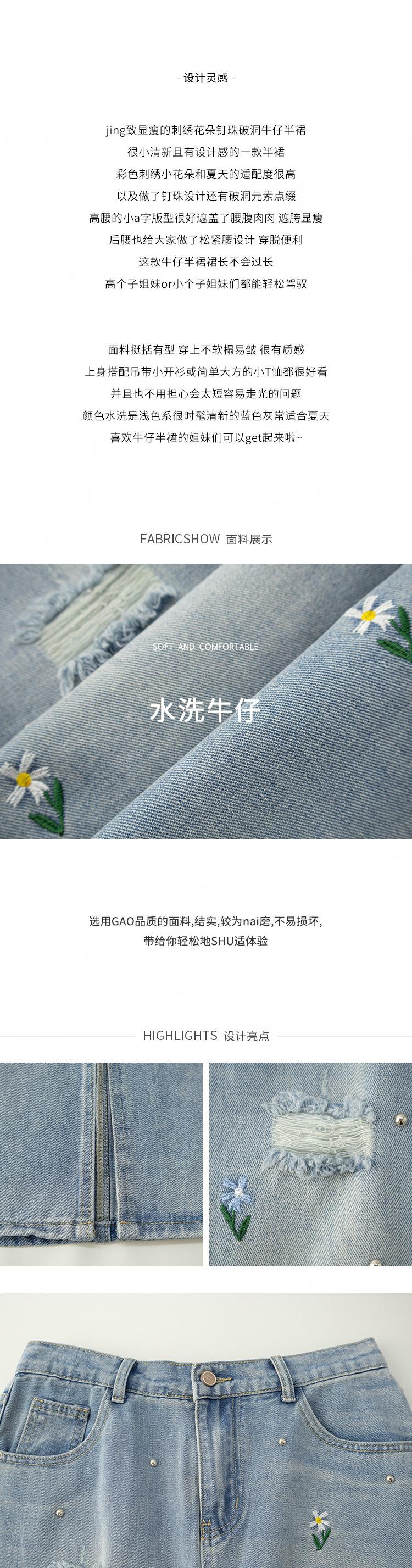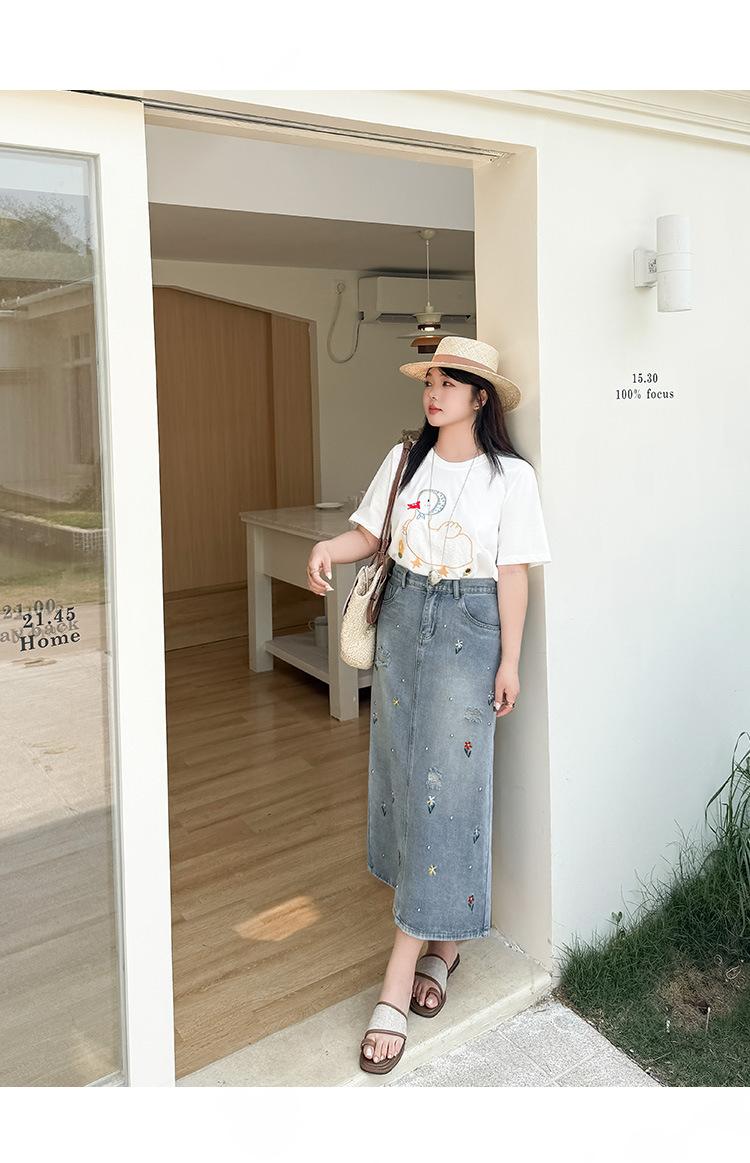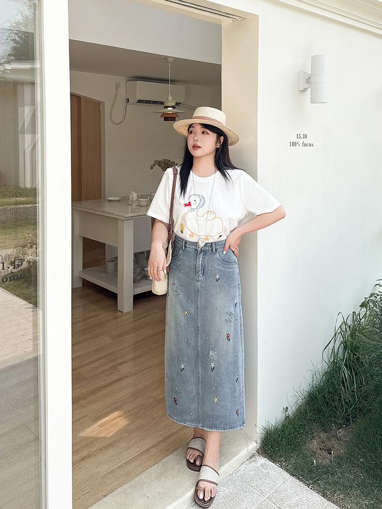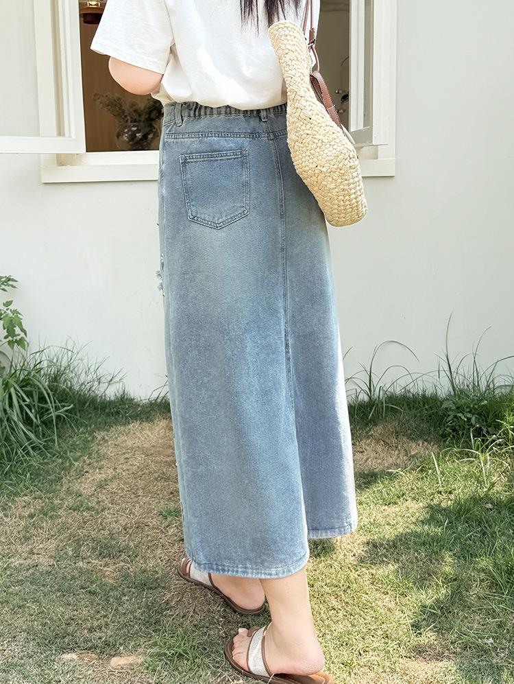 Exquisita y favorecedora falda midi de mezclilla rota con bordados florales y cuentas