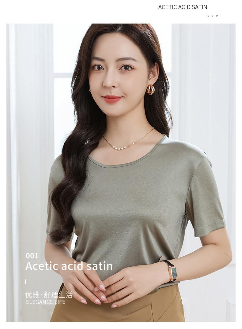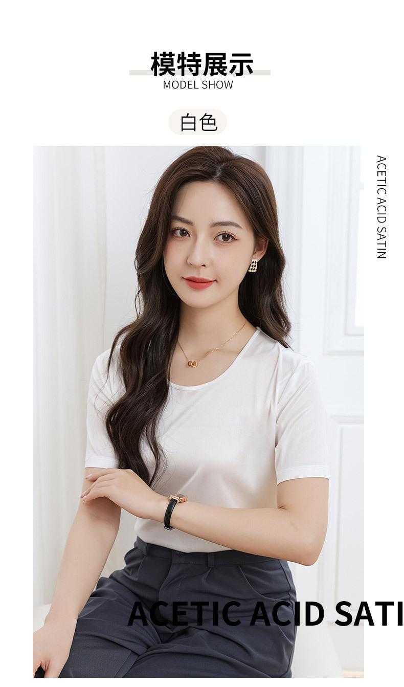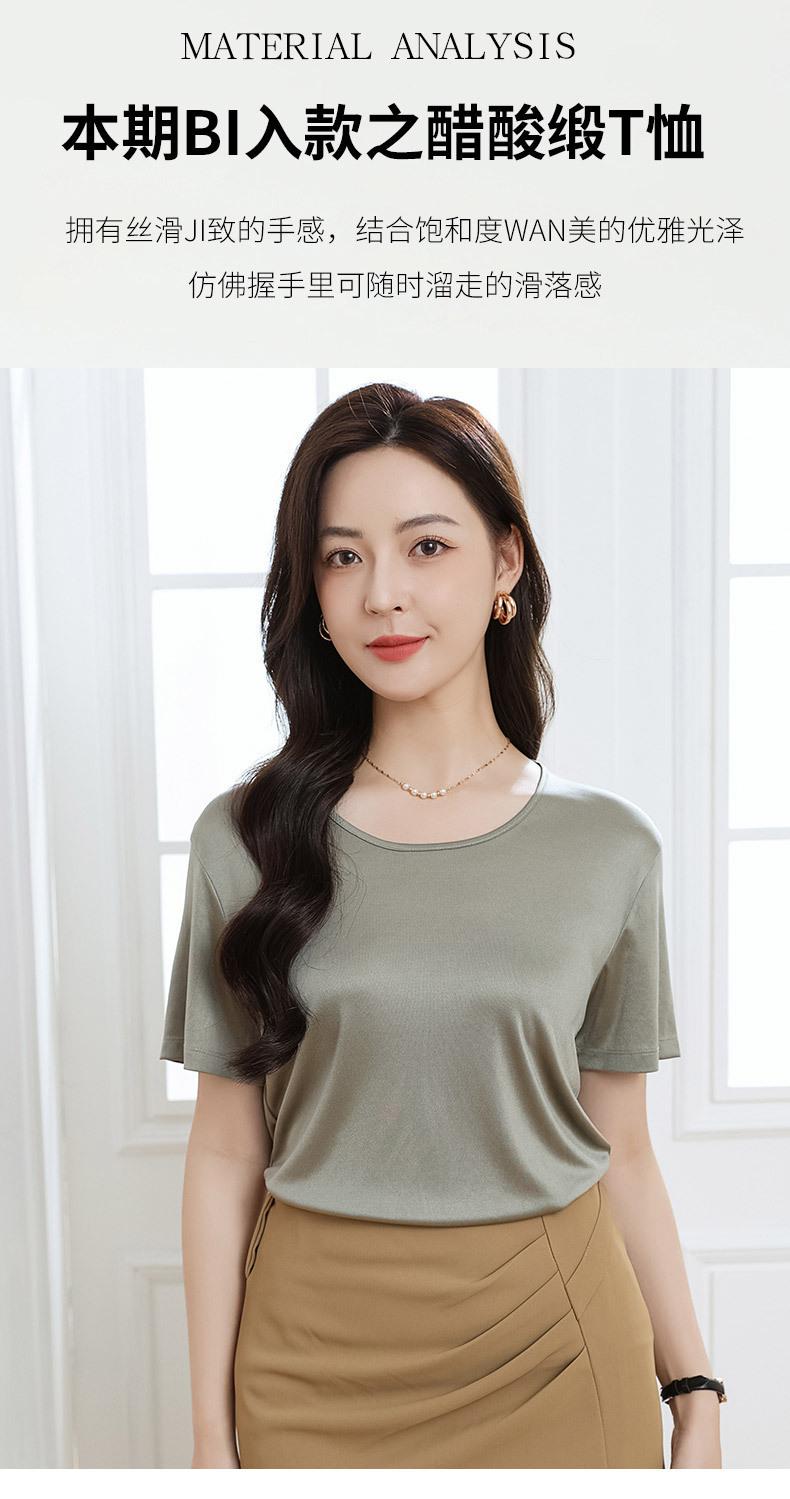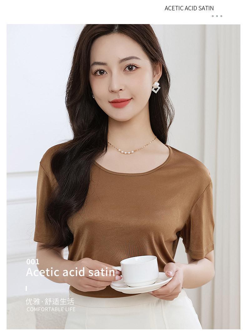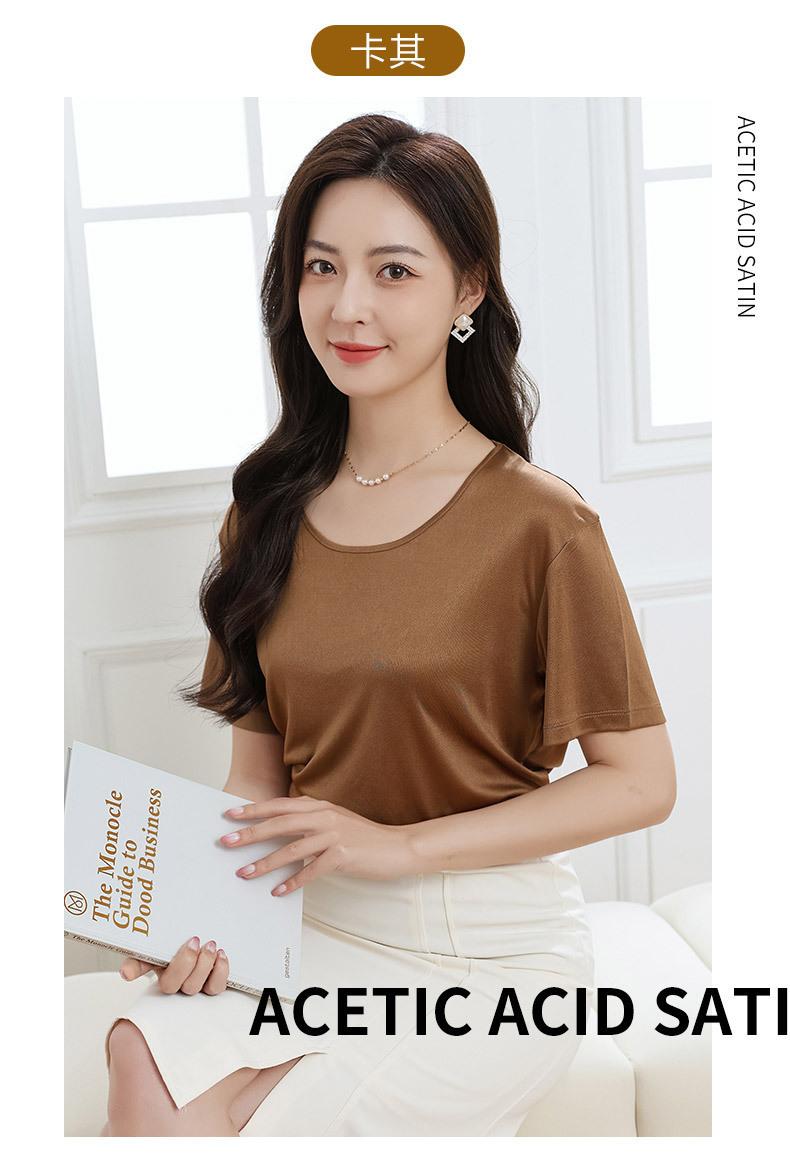 2025 Nuevo Jersey de Cuello U Manga Corta Satén de Triacetato Camiseta Verano Elegante Manga Corta Base Interior Color Sólido Top