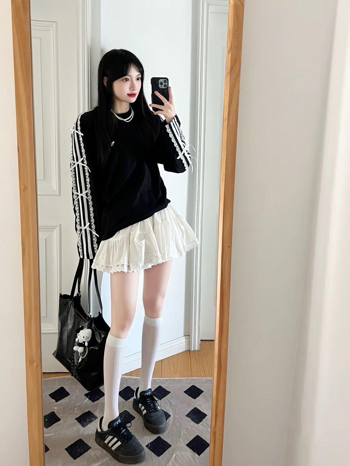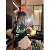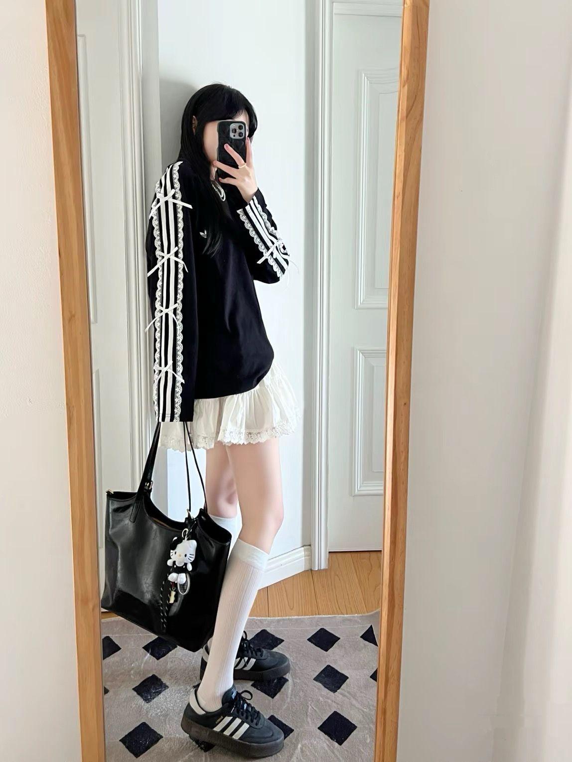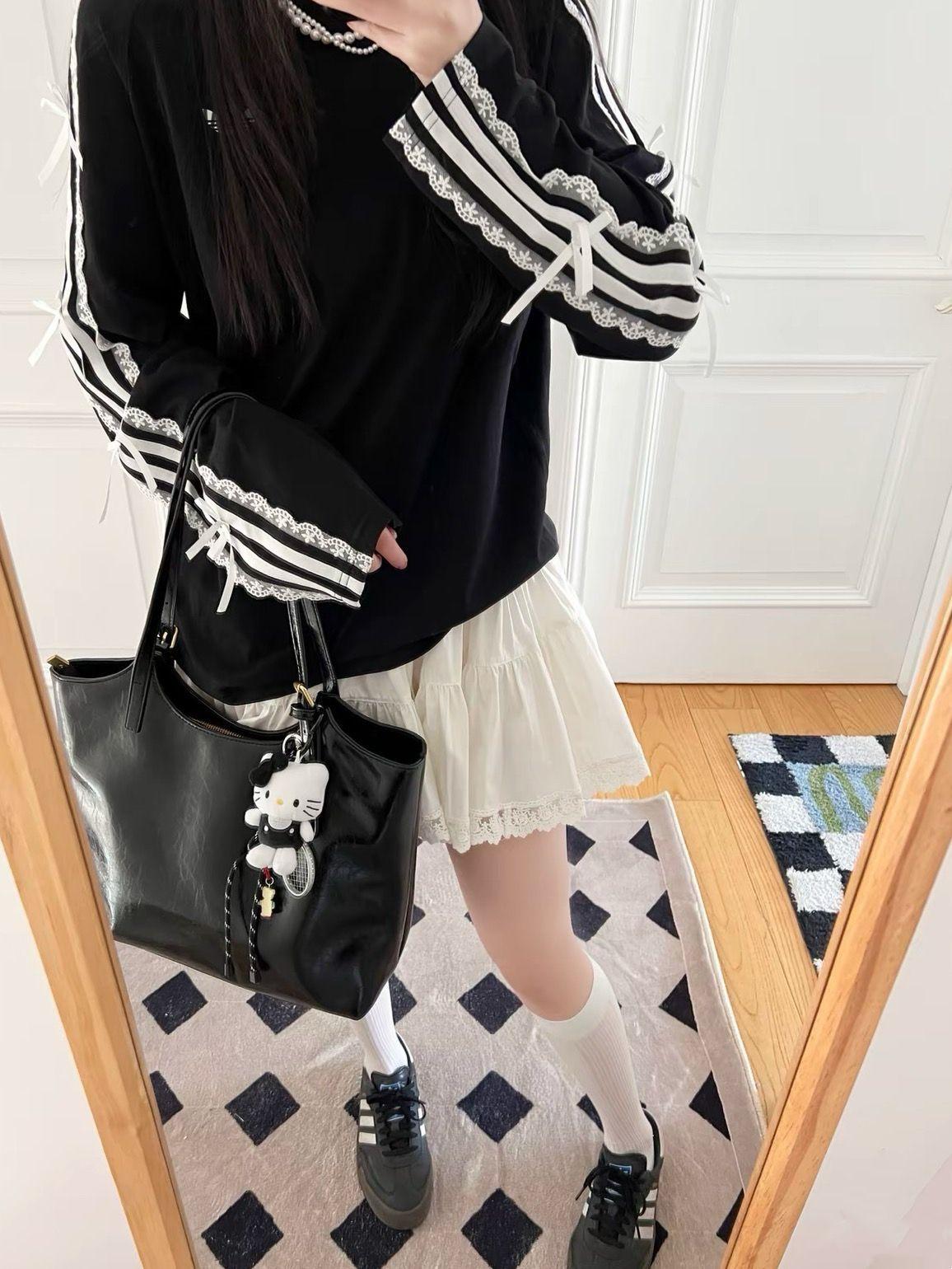 Camiseta holgada de manga larga estilo retro casual americano con sentido del diseño de lazo. Top de encaje a rayas de largo medio para mujer.