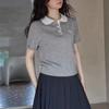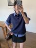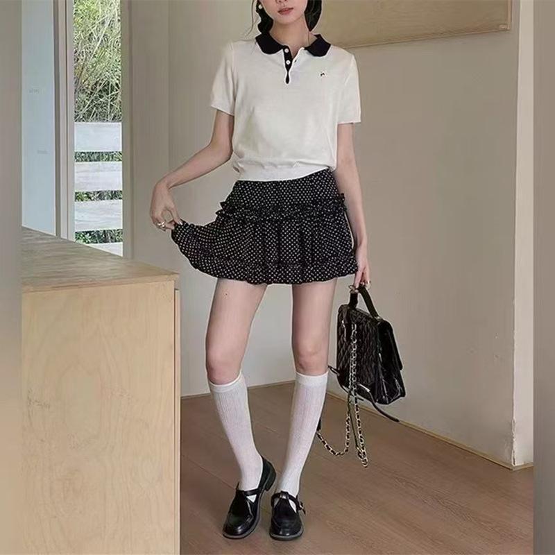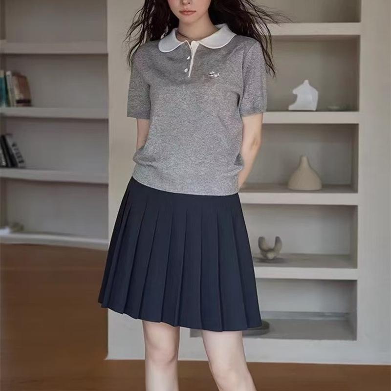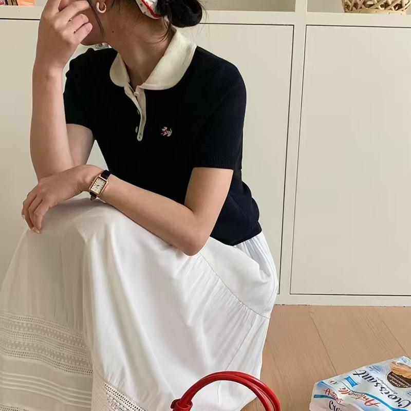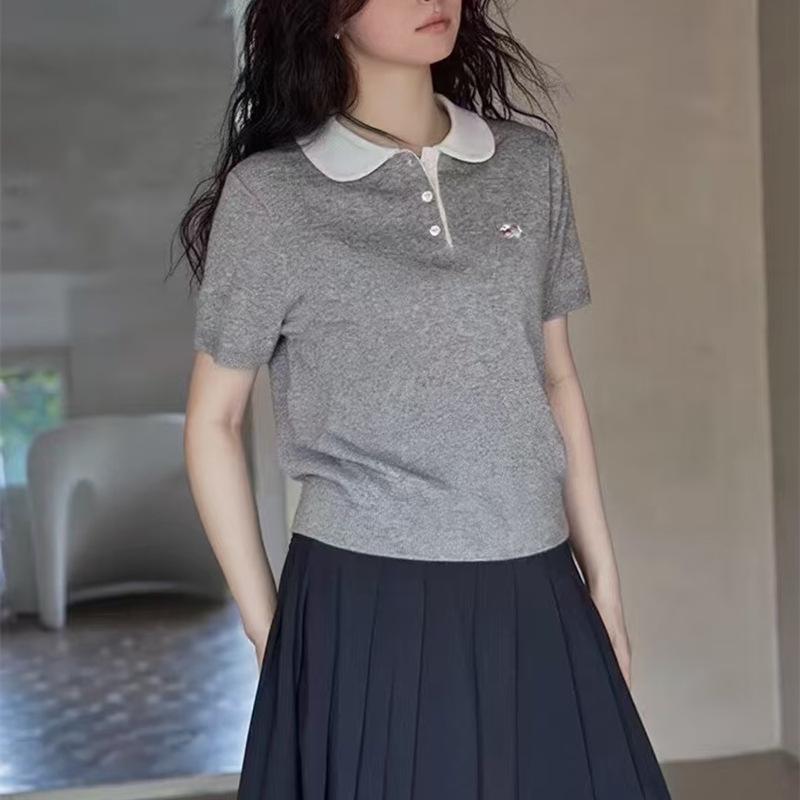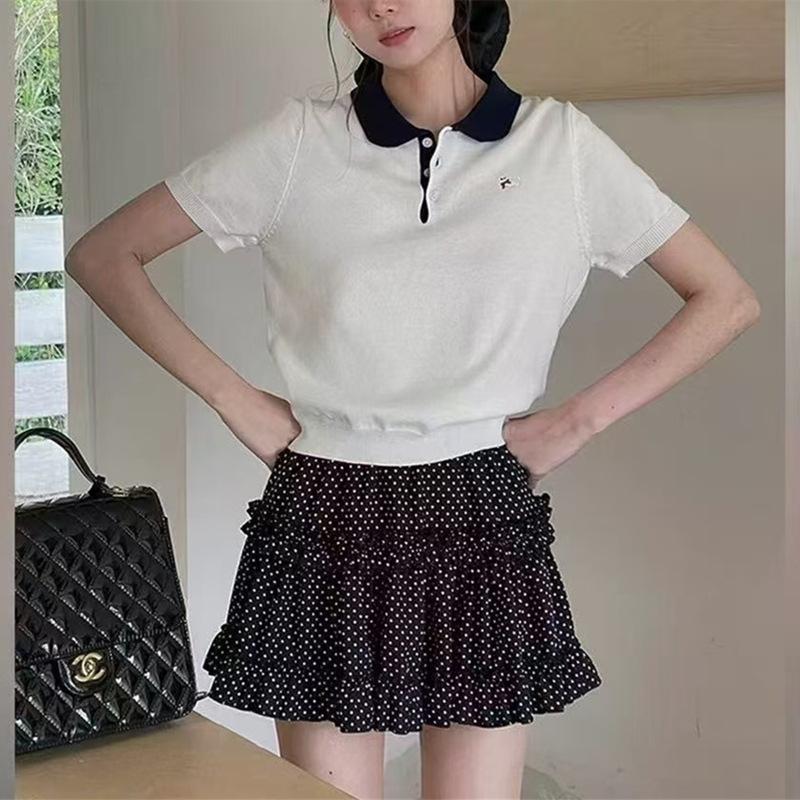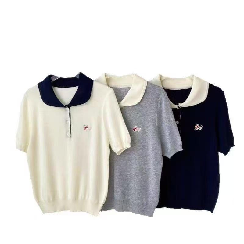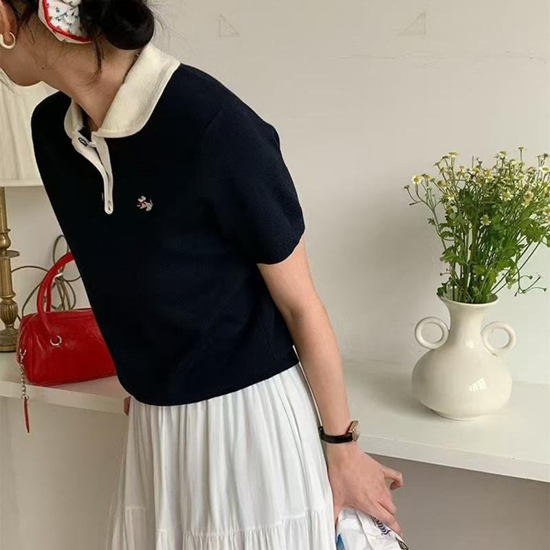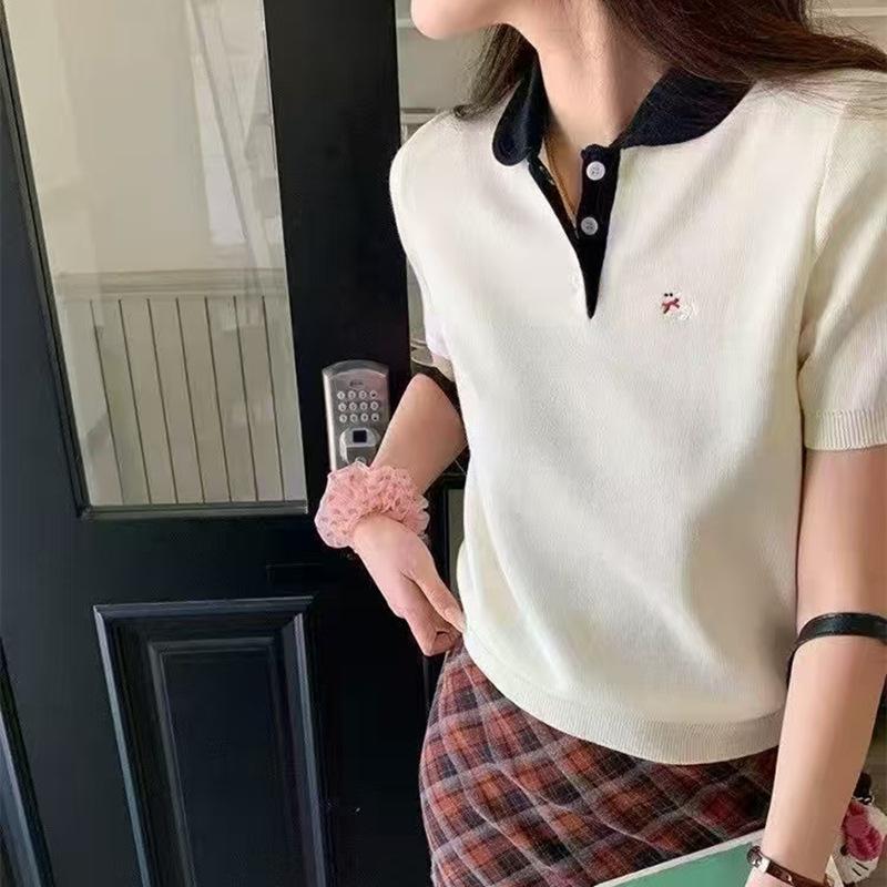 Suéter estilo universitario coreano con cuello polo bordado de cachorro de manga corta para mujer, nuevo verano, casual, combinable con todo, top de hombro