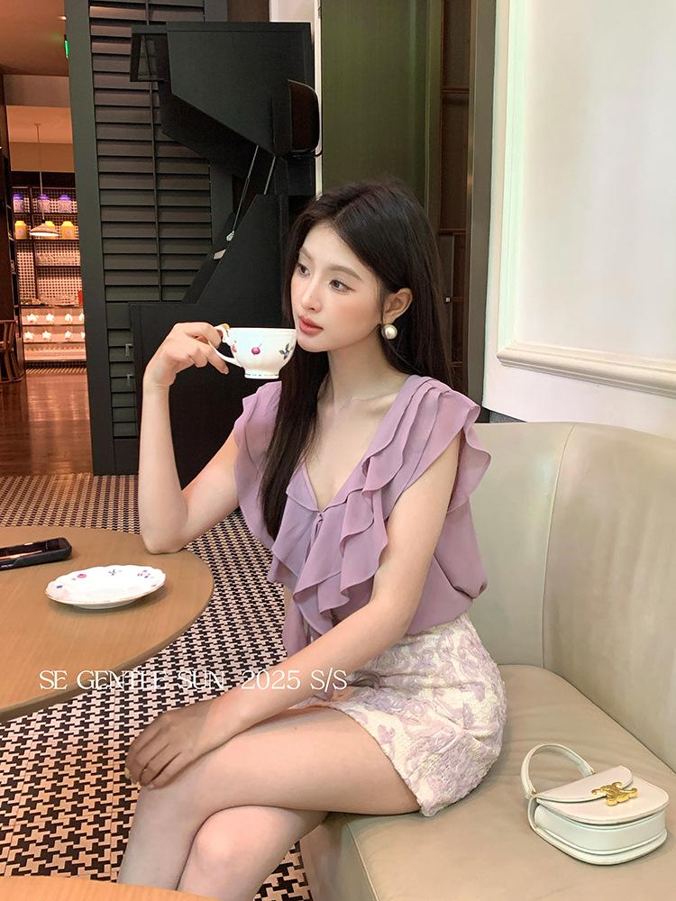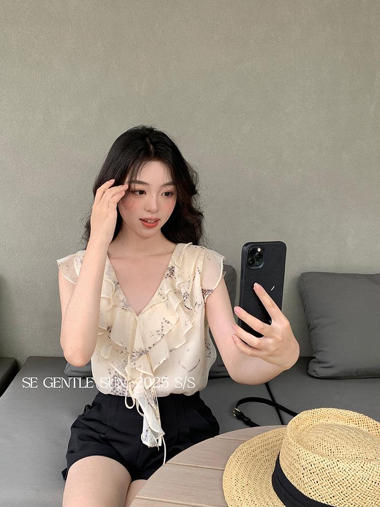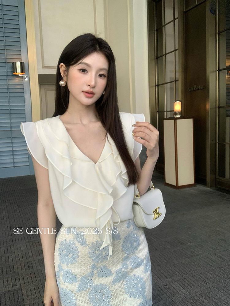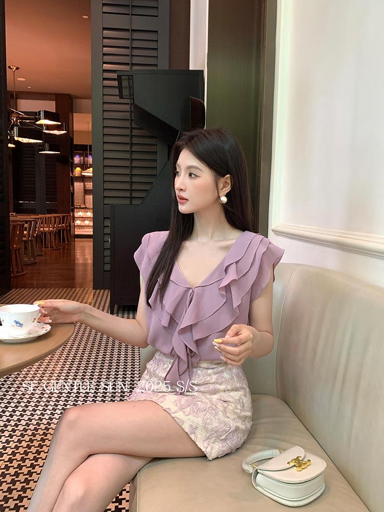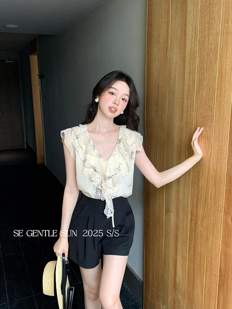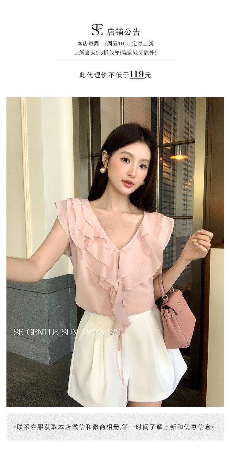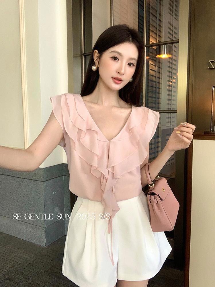 Xiuxi 2025 Verano Nuevo Adelgazante Elegante Combinable Hoja de Loto Cuello en V Chifón Top Camisa de Manga Corta para Mujer 89431
