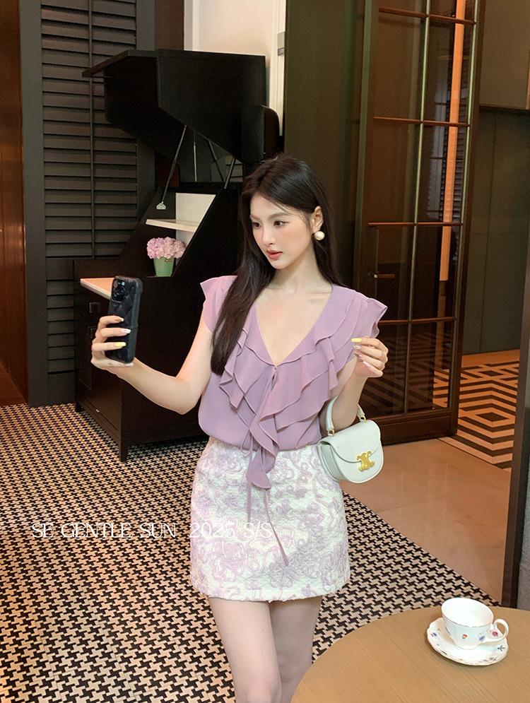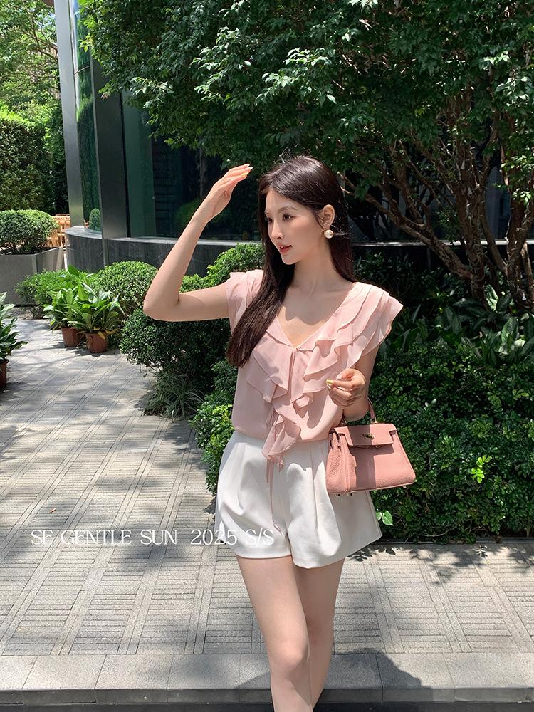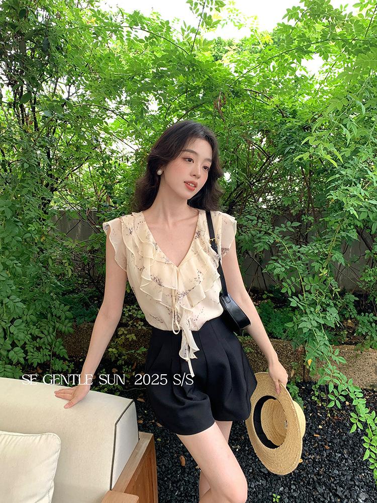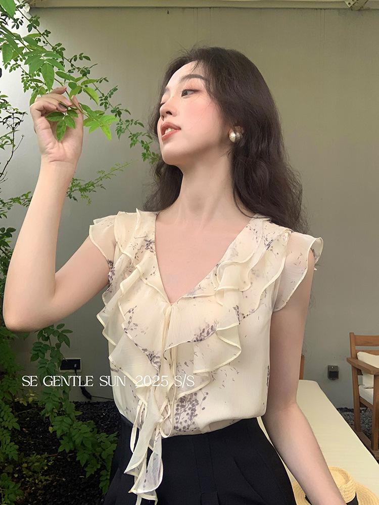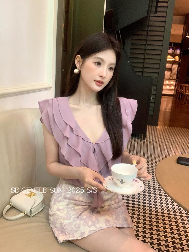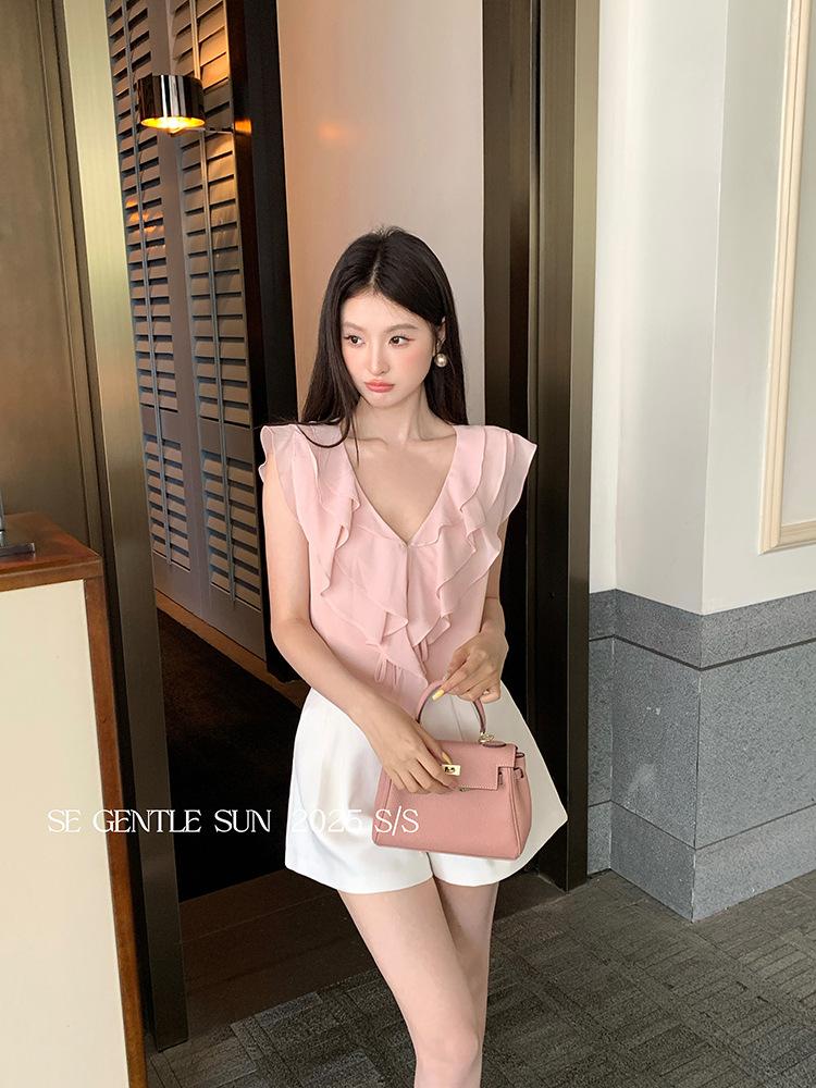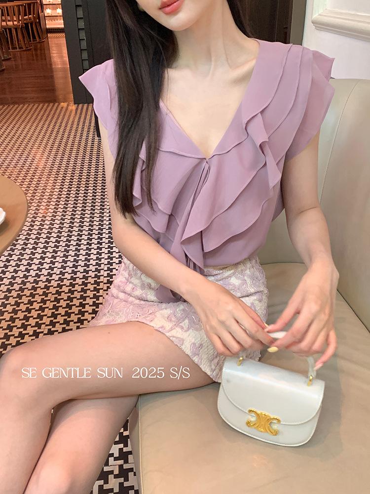 Xiuxi 2025 Verano Nuevo Adelgazante Elegante Combinable Hoja de Loto Cuello en V Chifón Top Camisa de Manga Corta para Mujer 89431