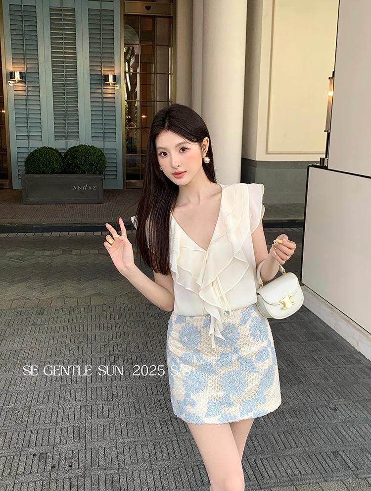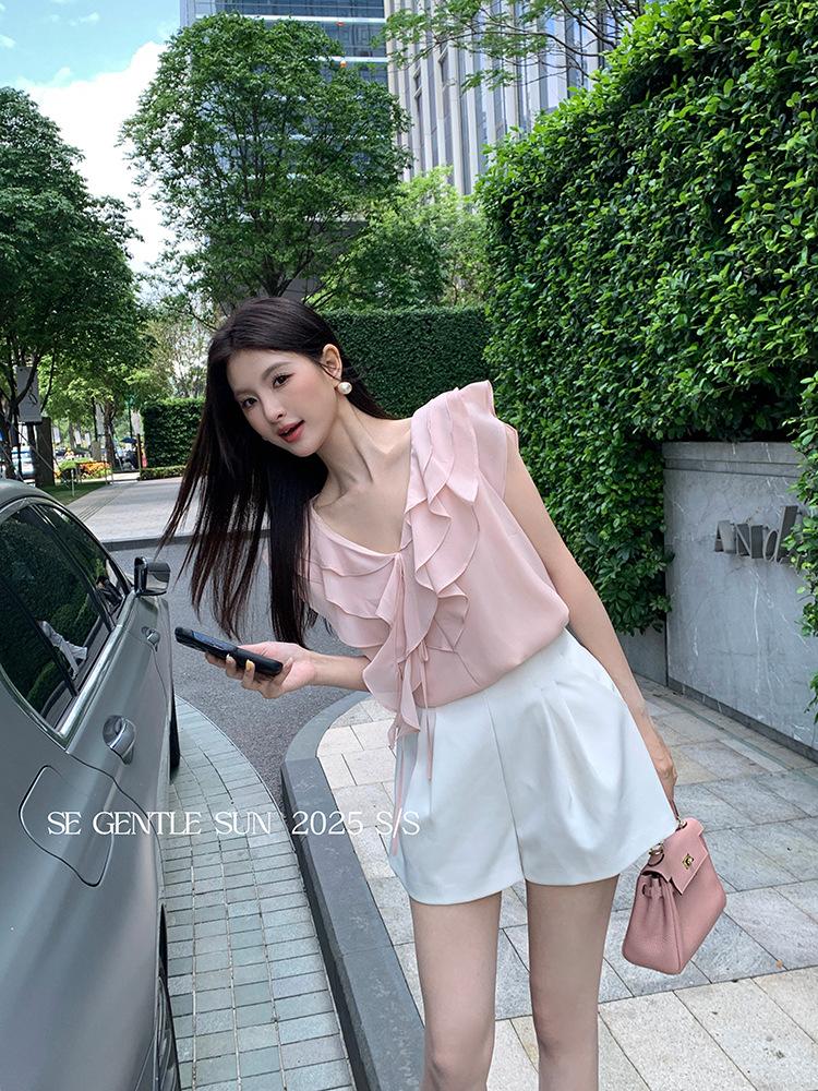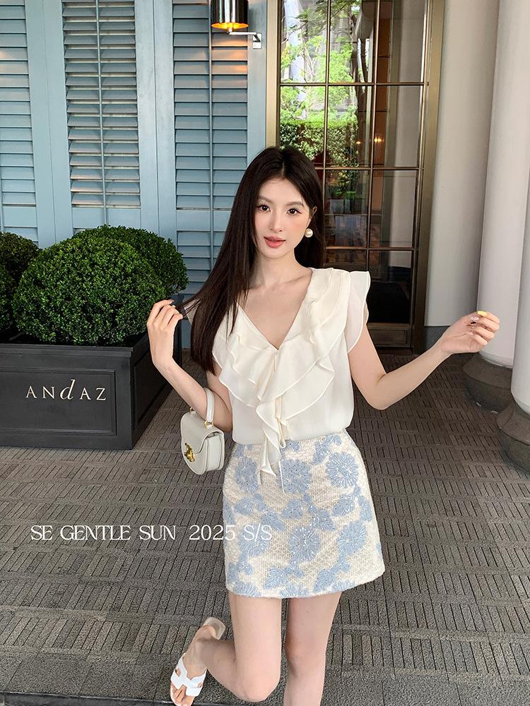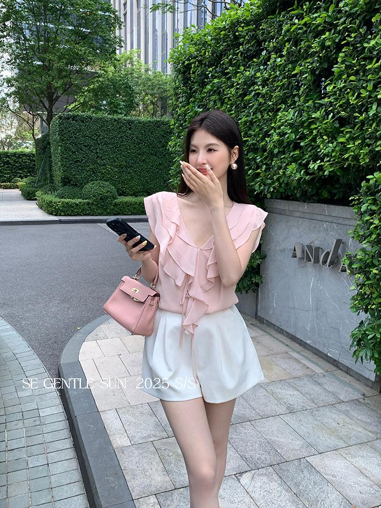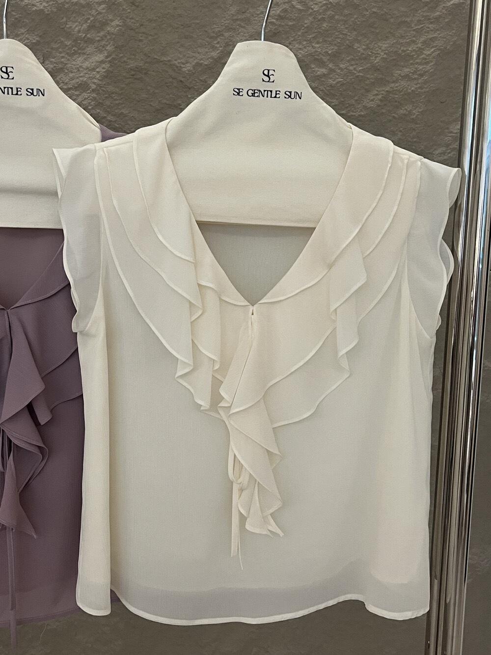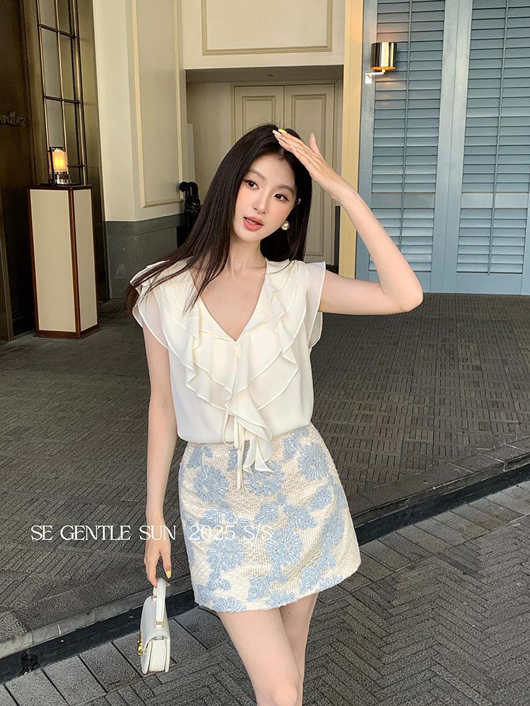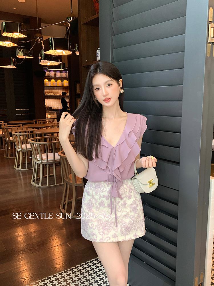 Xiuxi 2025 Verano Nuevo Adelgazante Elegante Combinable Hoja de Loto Cuello en V Chifón Top Camisa de Manga Corta para Mujer 89431