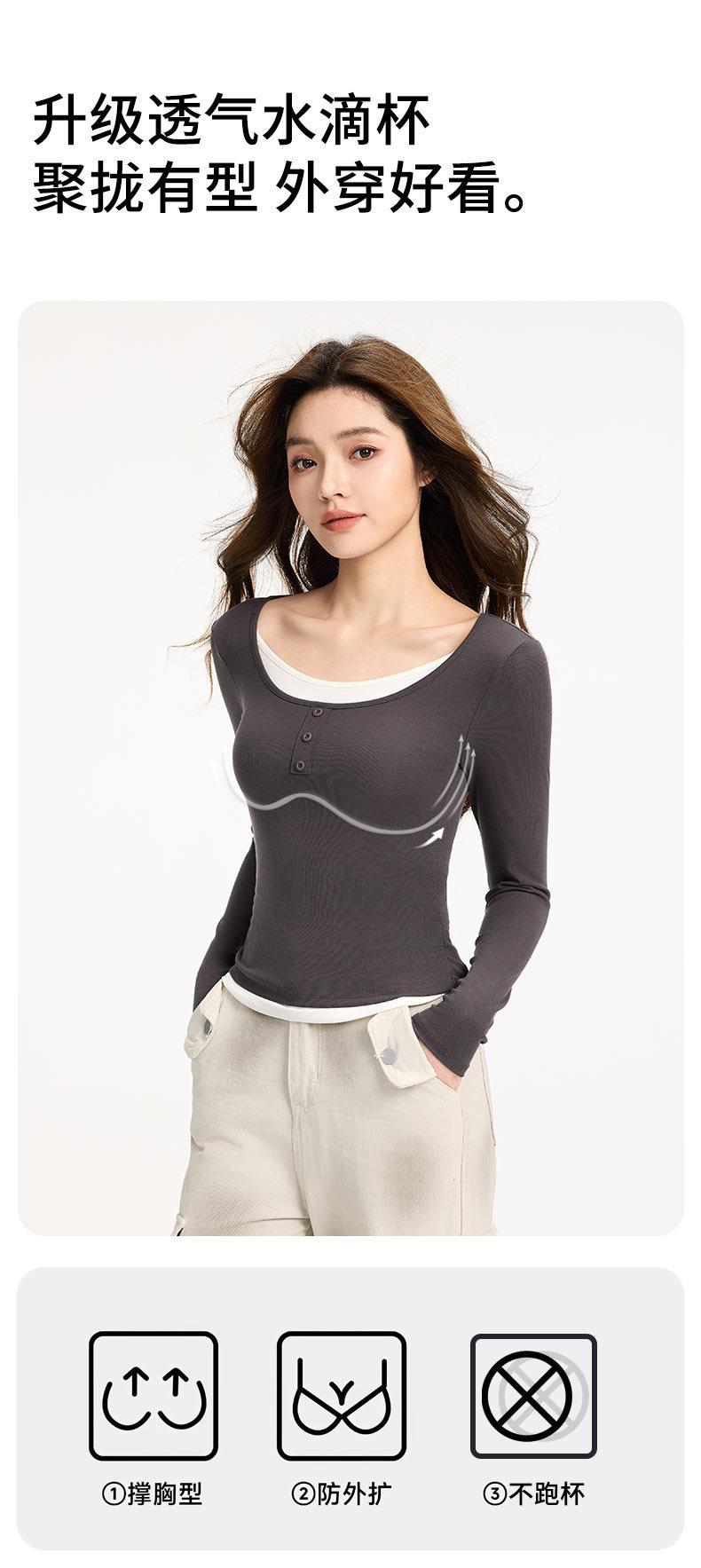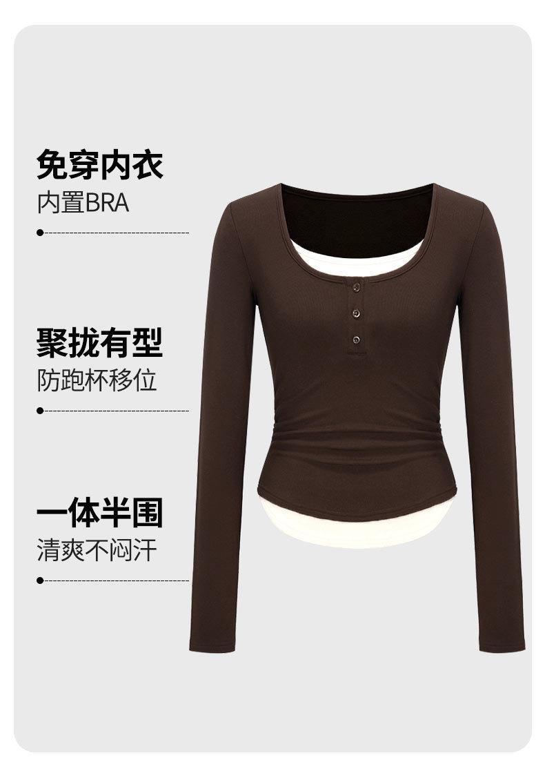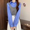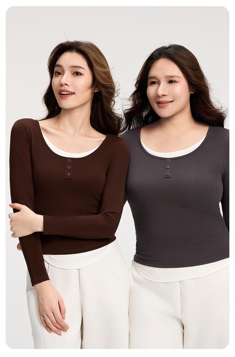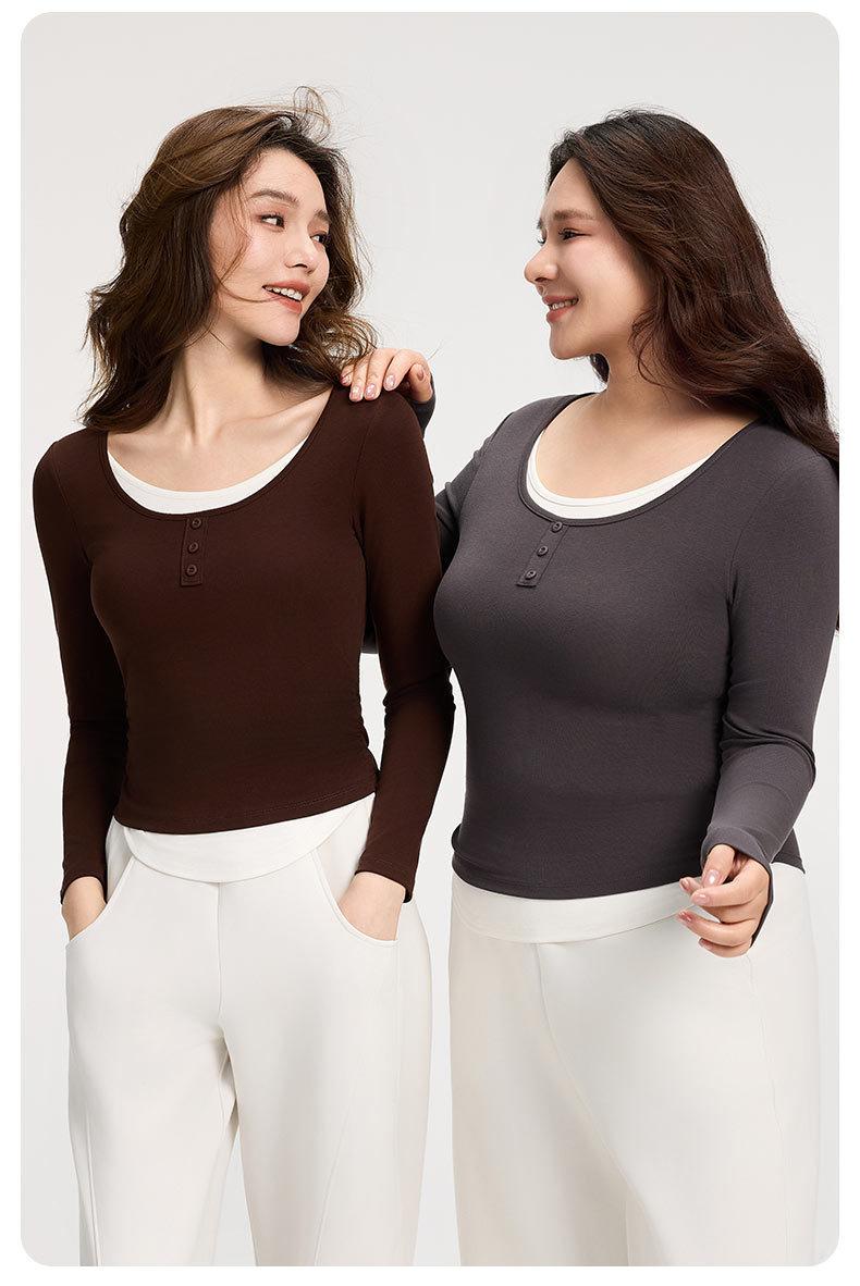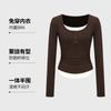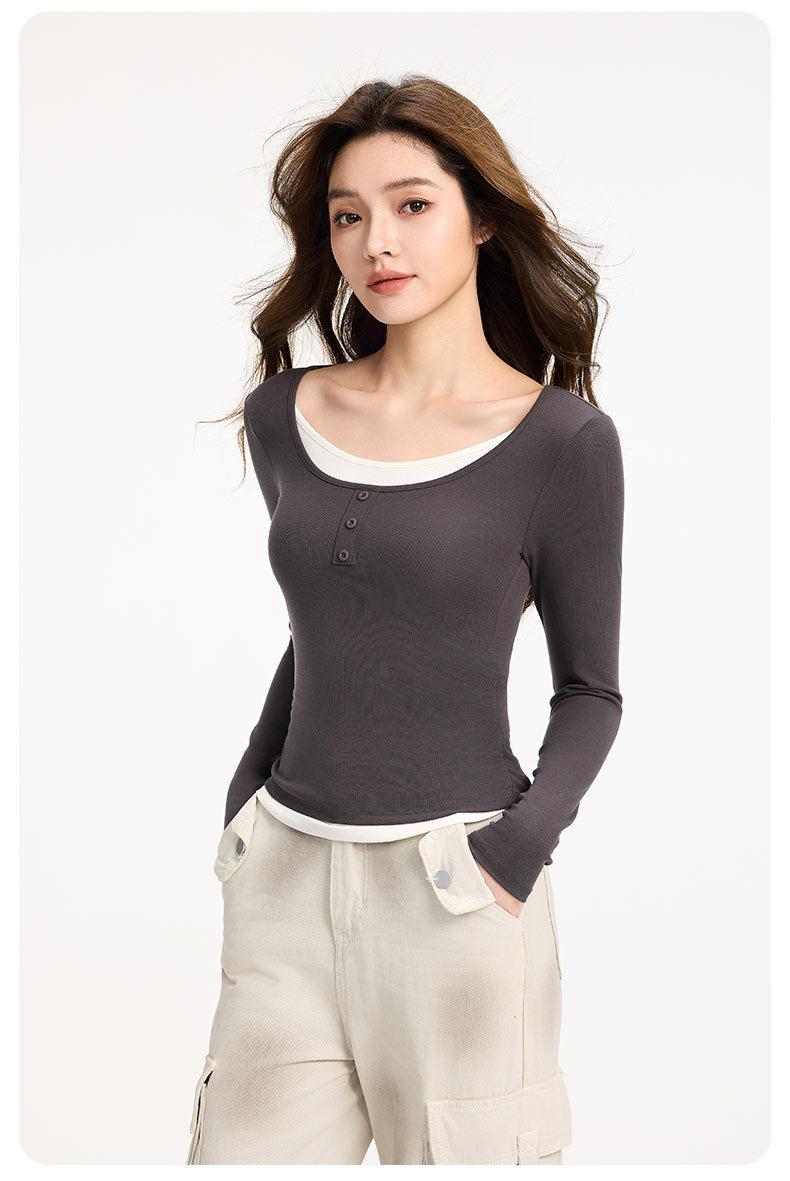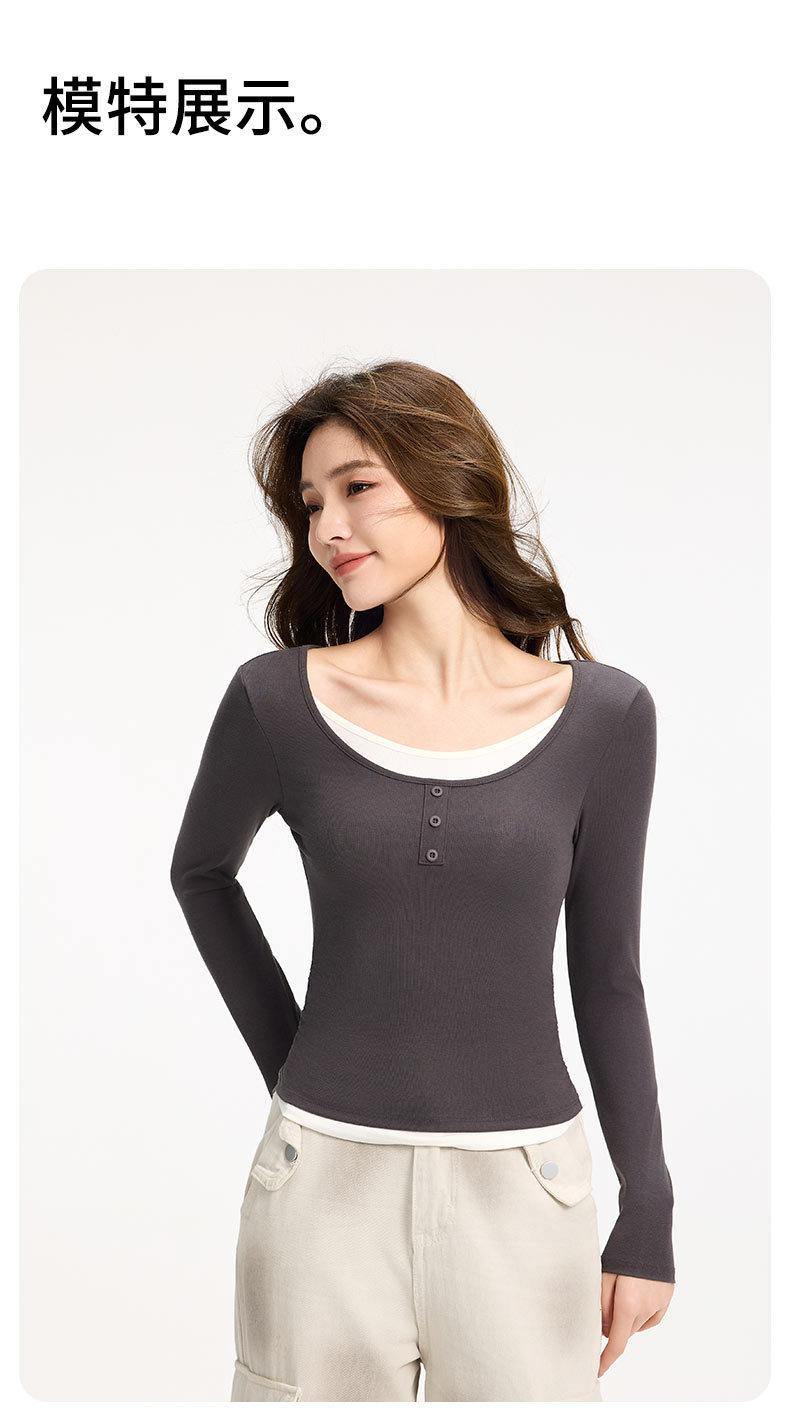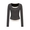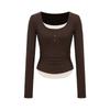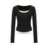 Primavera y Verano Nuevo para Mujer Falso de Dos Piezas Color de Contraste Manga Larga Camiseta Sentido del Diseño Nicho Ajustado Ajustado Top Básico