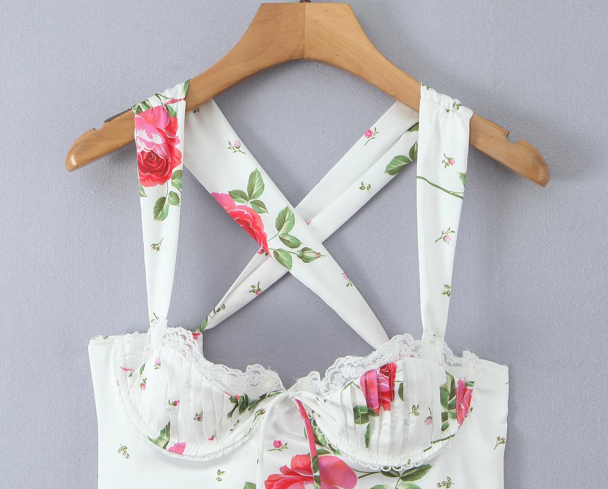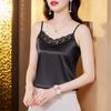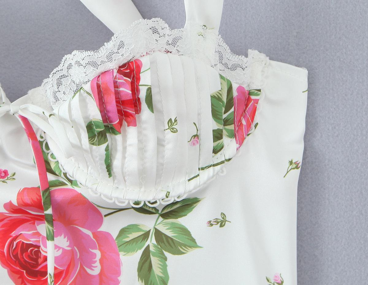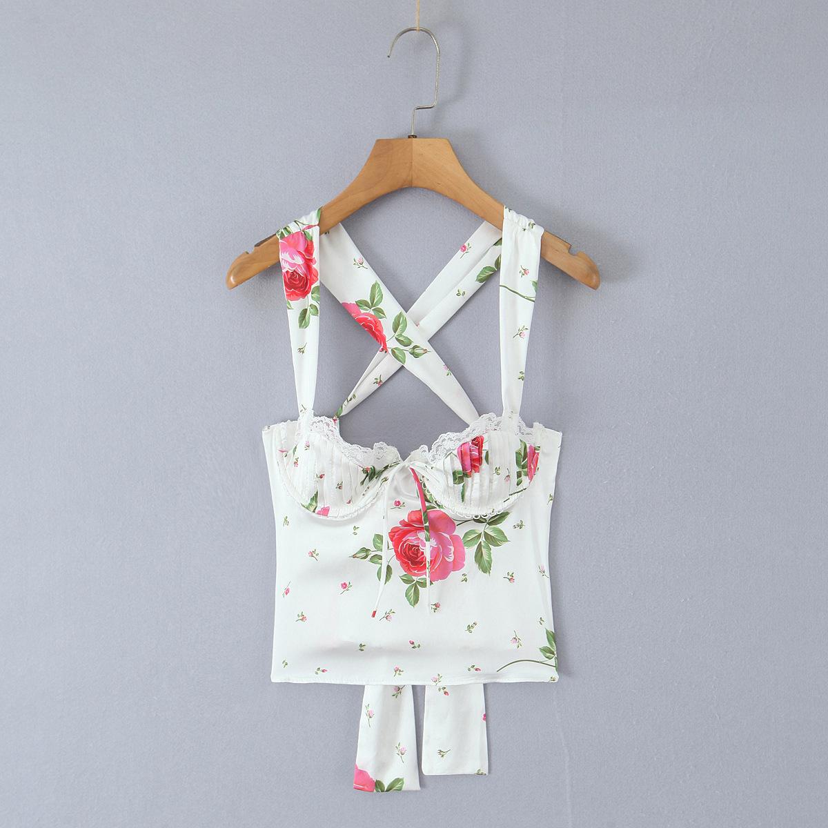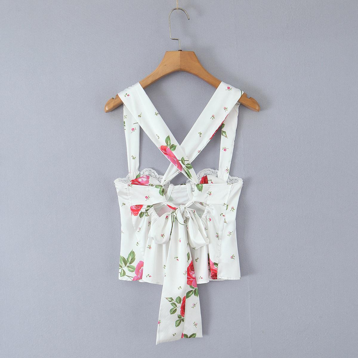7524-25 Primavera Nuevo Estilo Europeo y Americano Satén Estampado de Rosas Encaje Costuras Cuello Top Camisola Pequeña